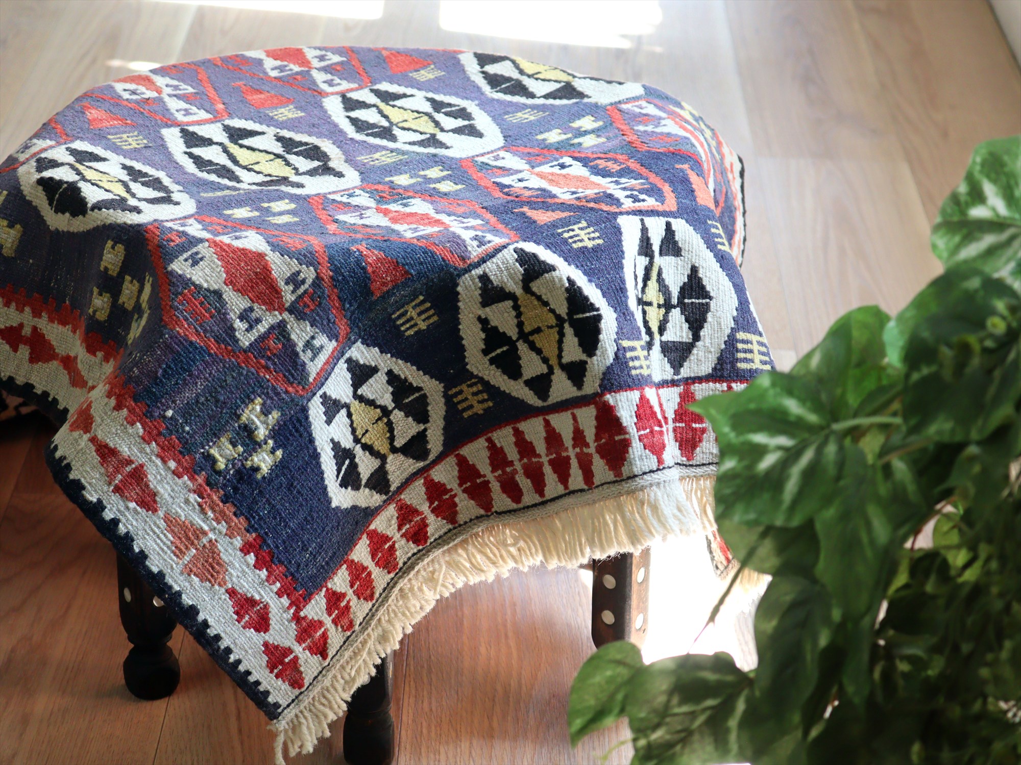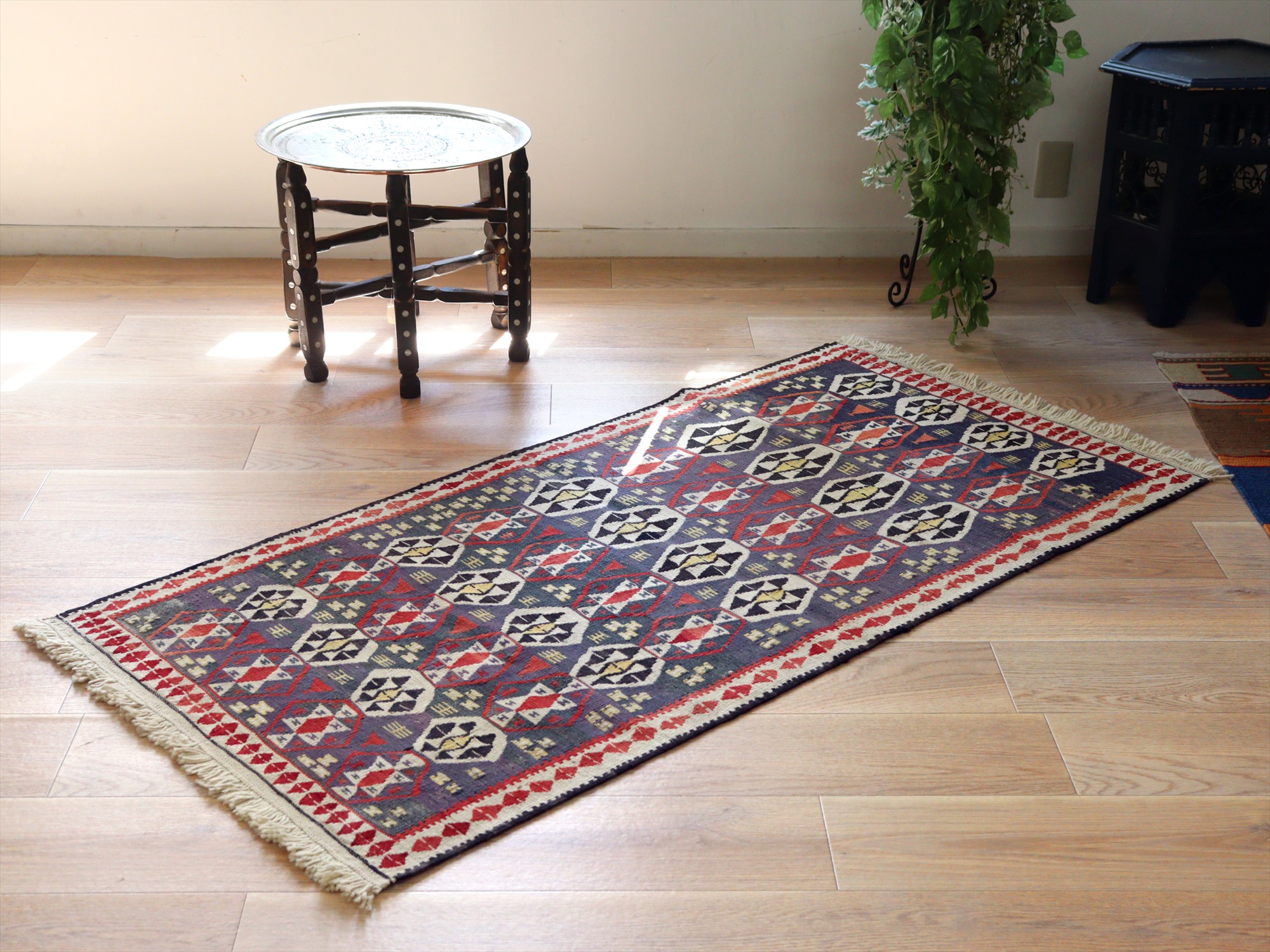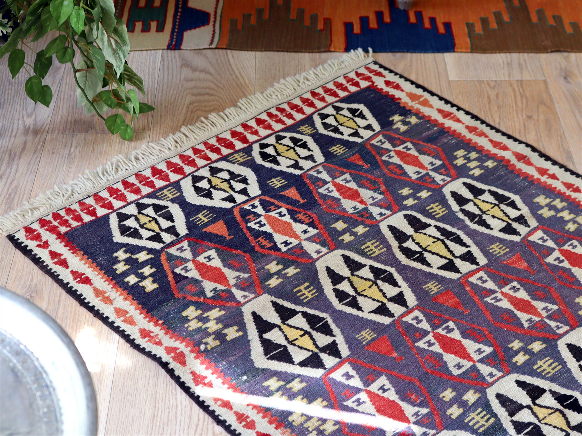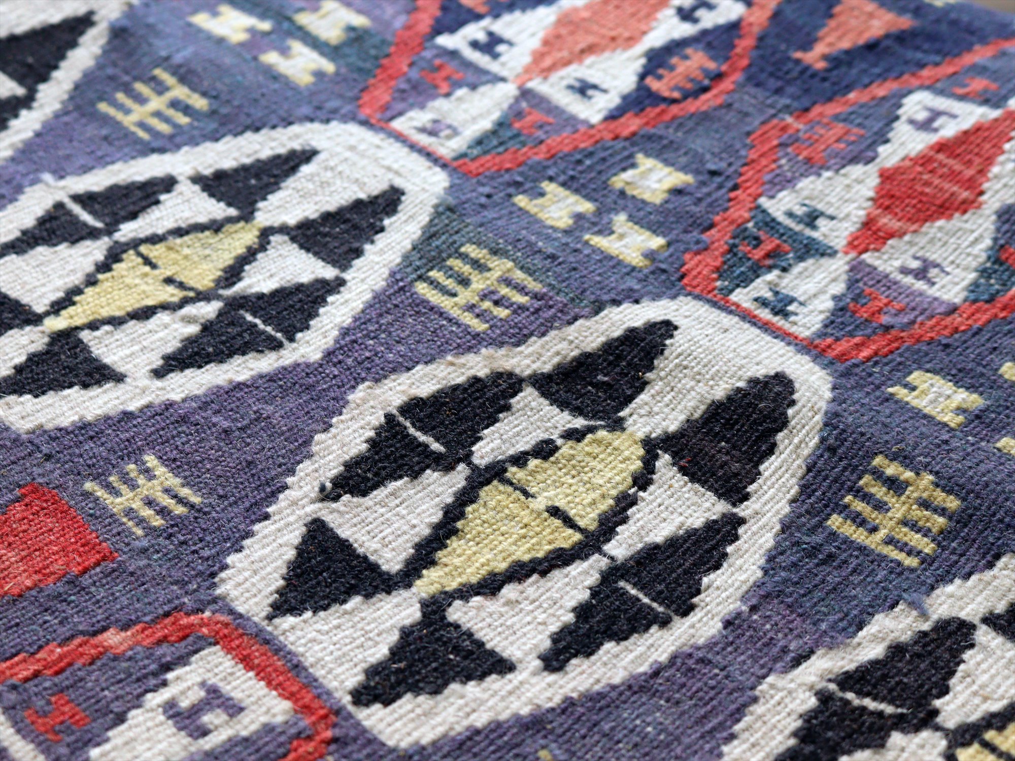 トルコ南東部、イランとの国境に近いエリアで織られたワン地方のキリム。グラデーションのあるムラサキベースに、幾何学模様が連なるように織られたデザイン。全体的にだいぶ色褪せているのがわかります。