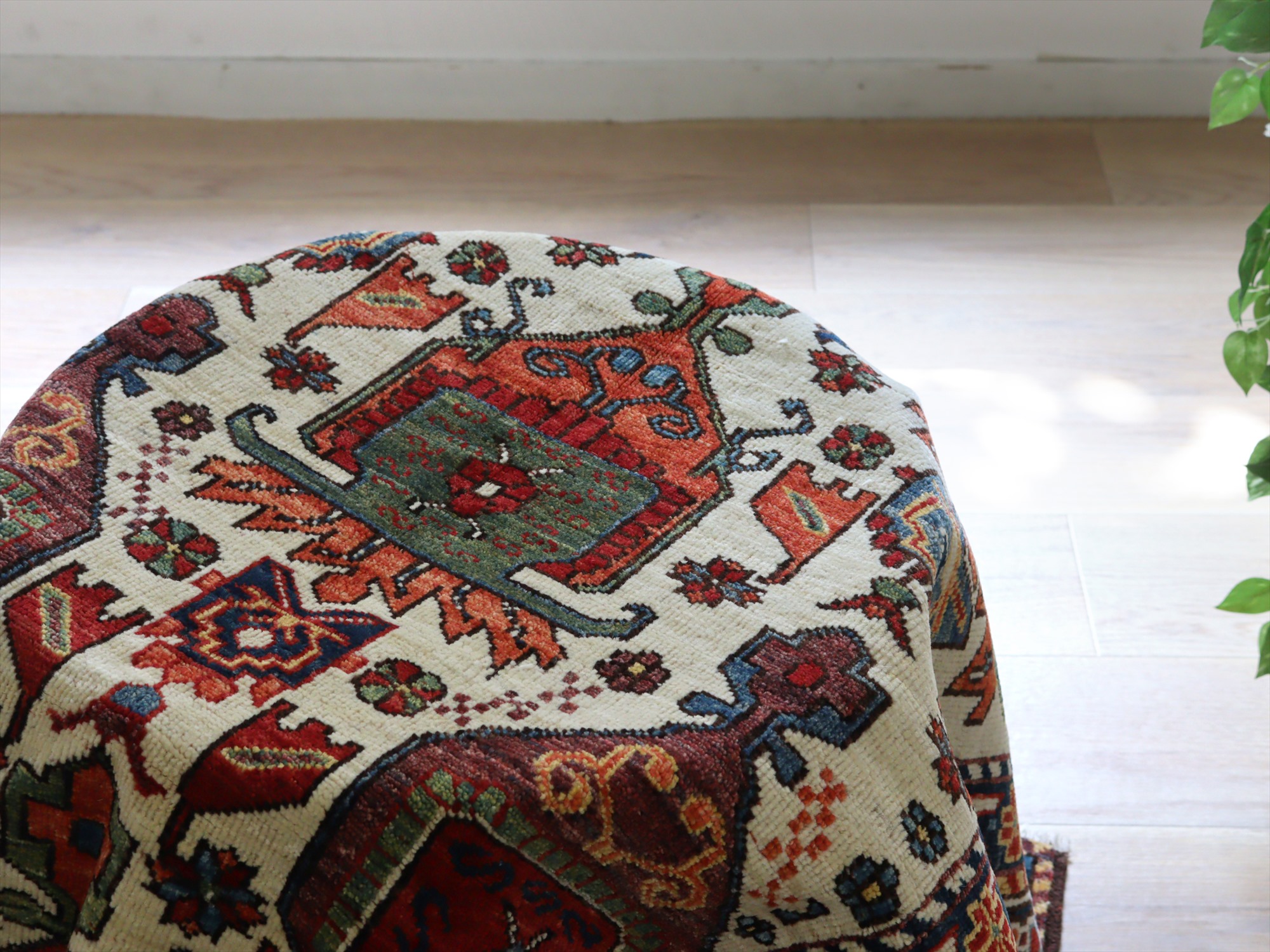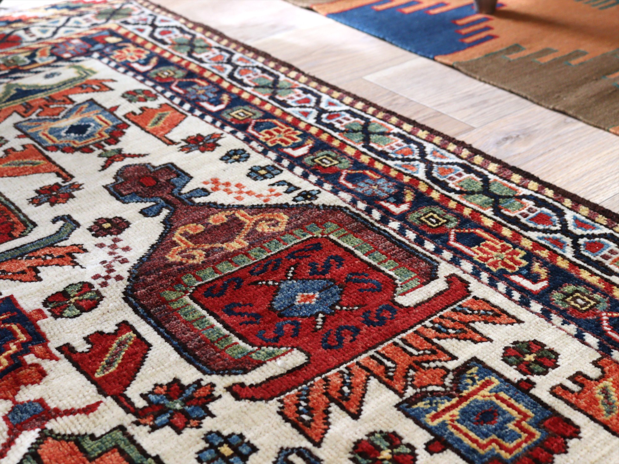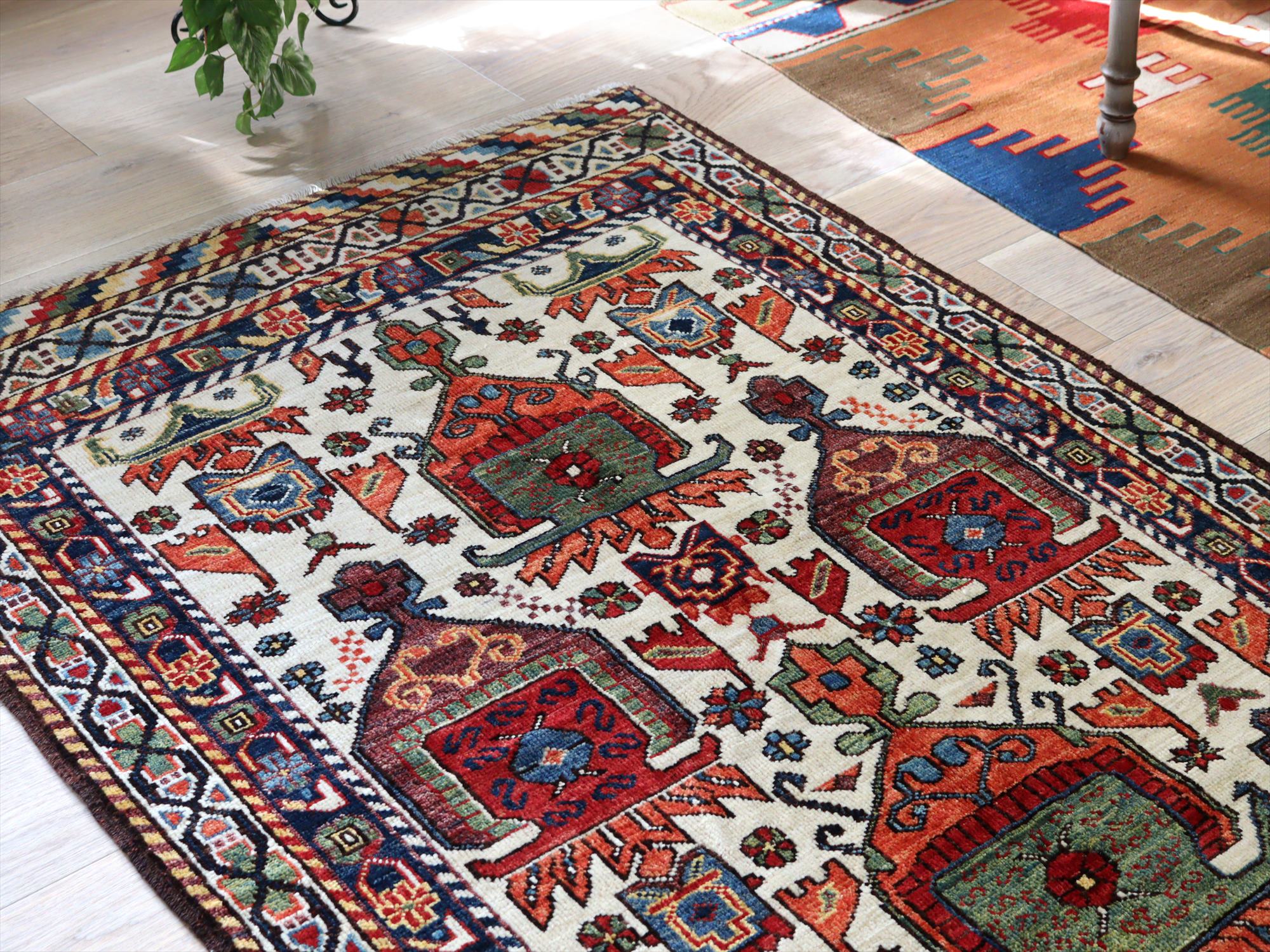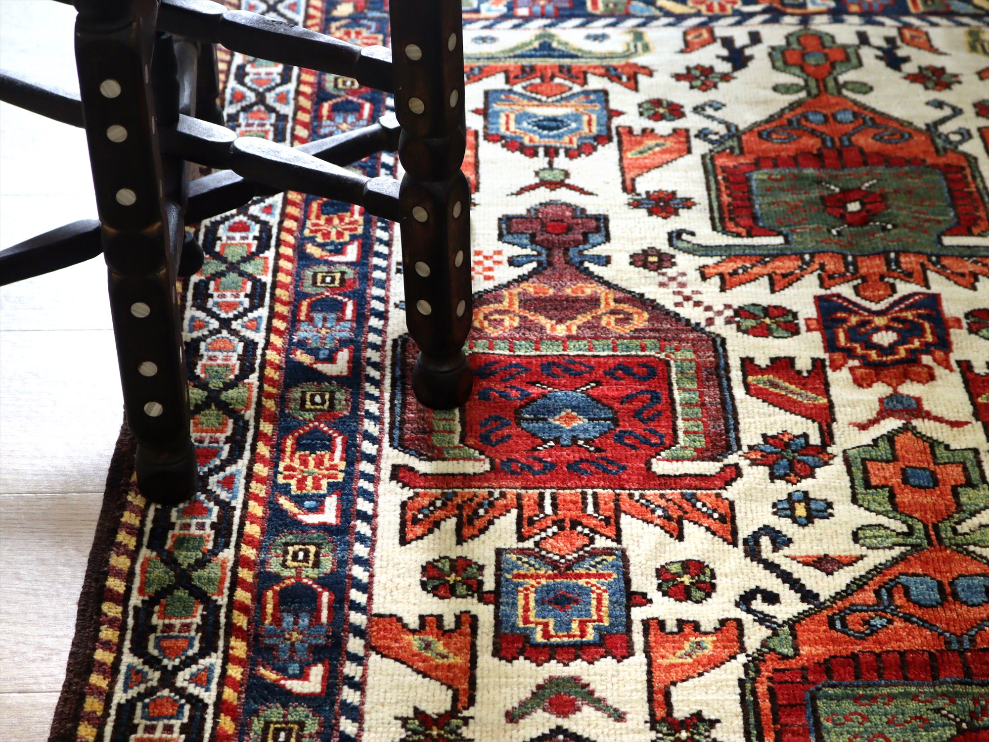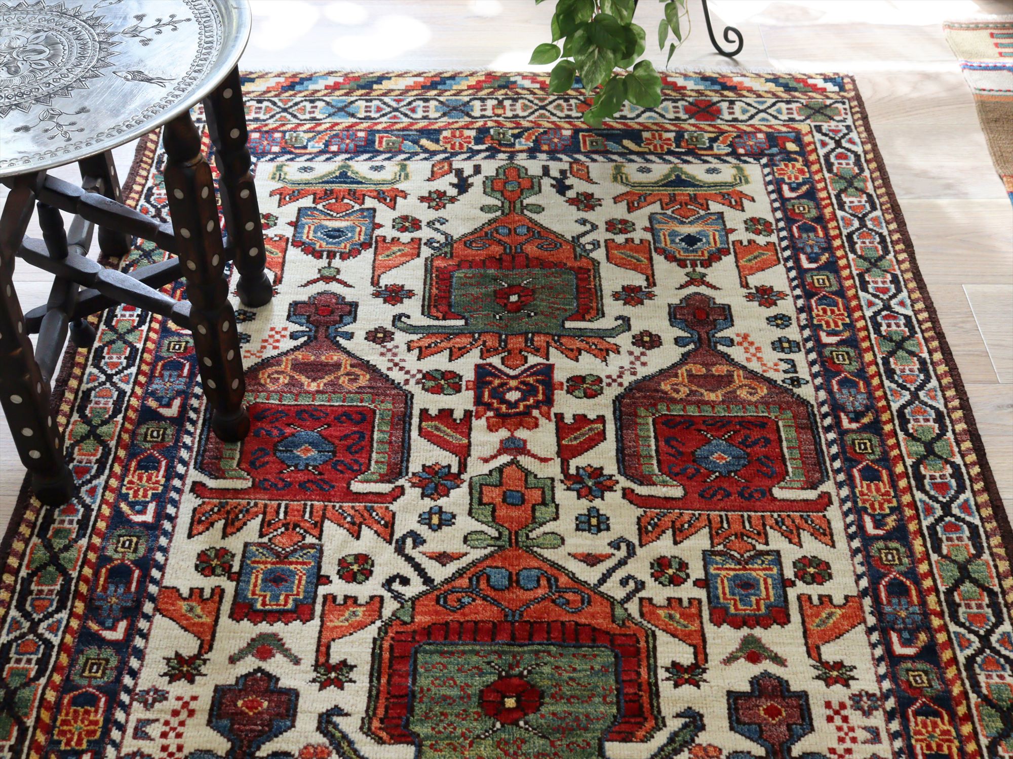 ベージュベースに、幾何学模様や小花、それにチューリップと思しきものが描かれたデザイン。こちらの絨毯は、天然染料により染色された手紡ぎの糸を使い、織られたものとされています。鮮やかで、華やかな色使いがトルコ絨毯らしい雰囲気を漂わせています。