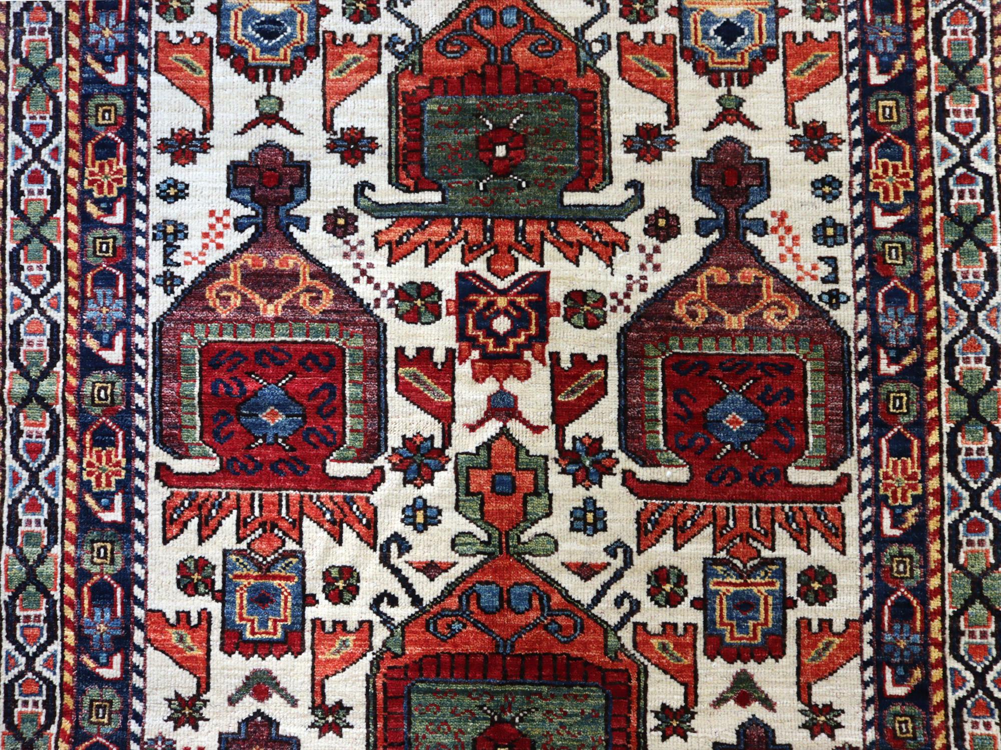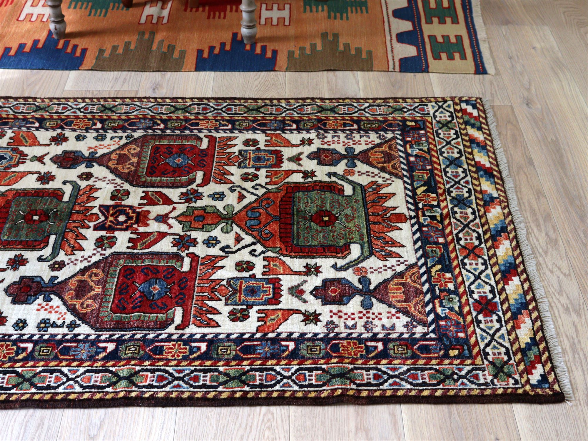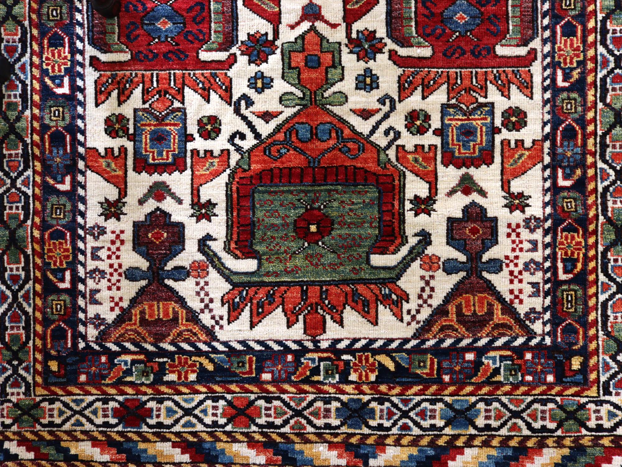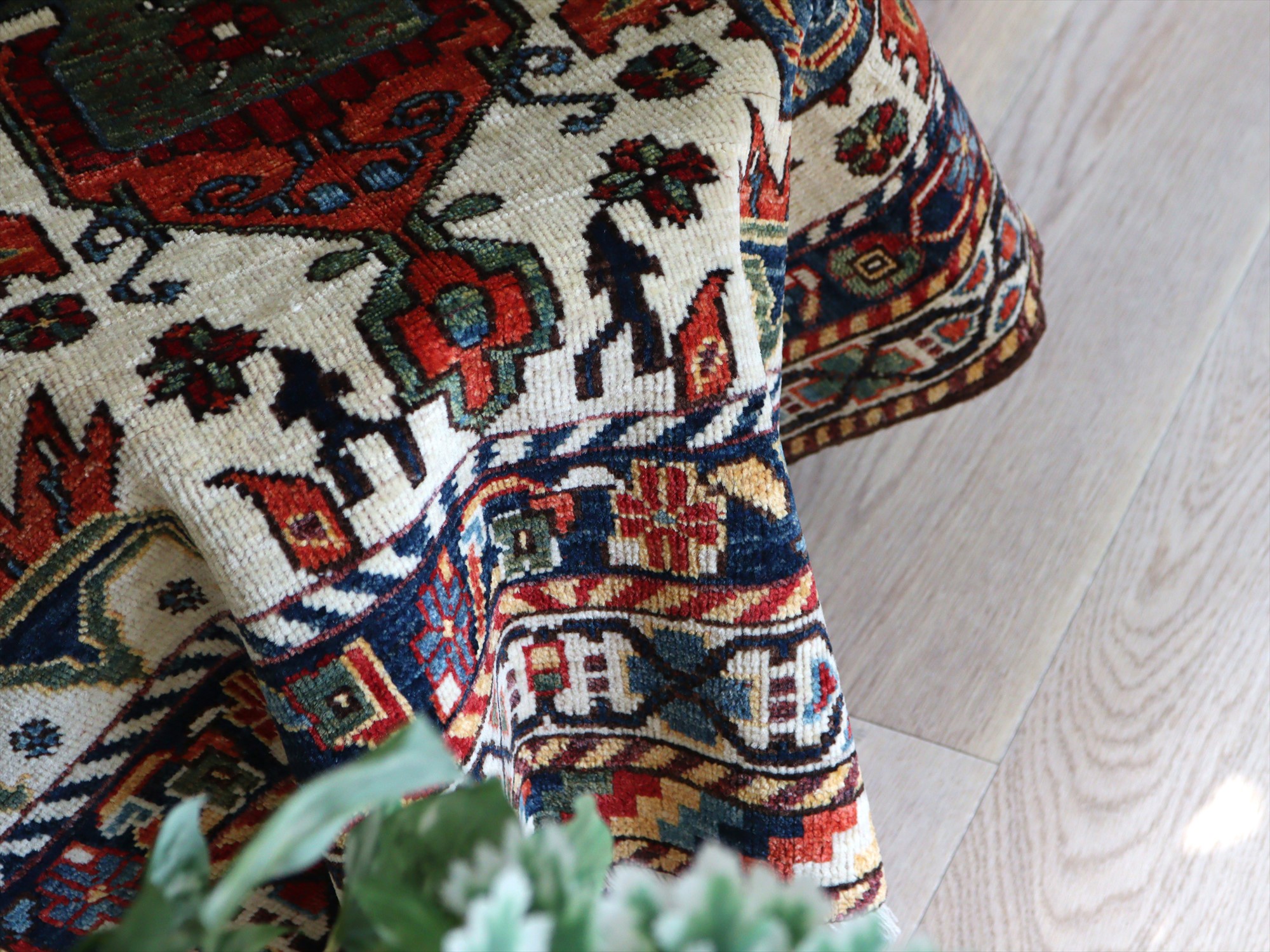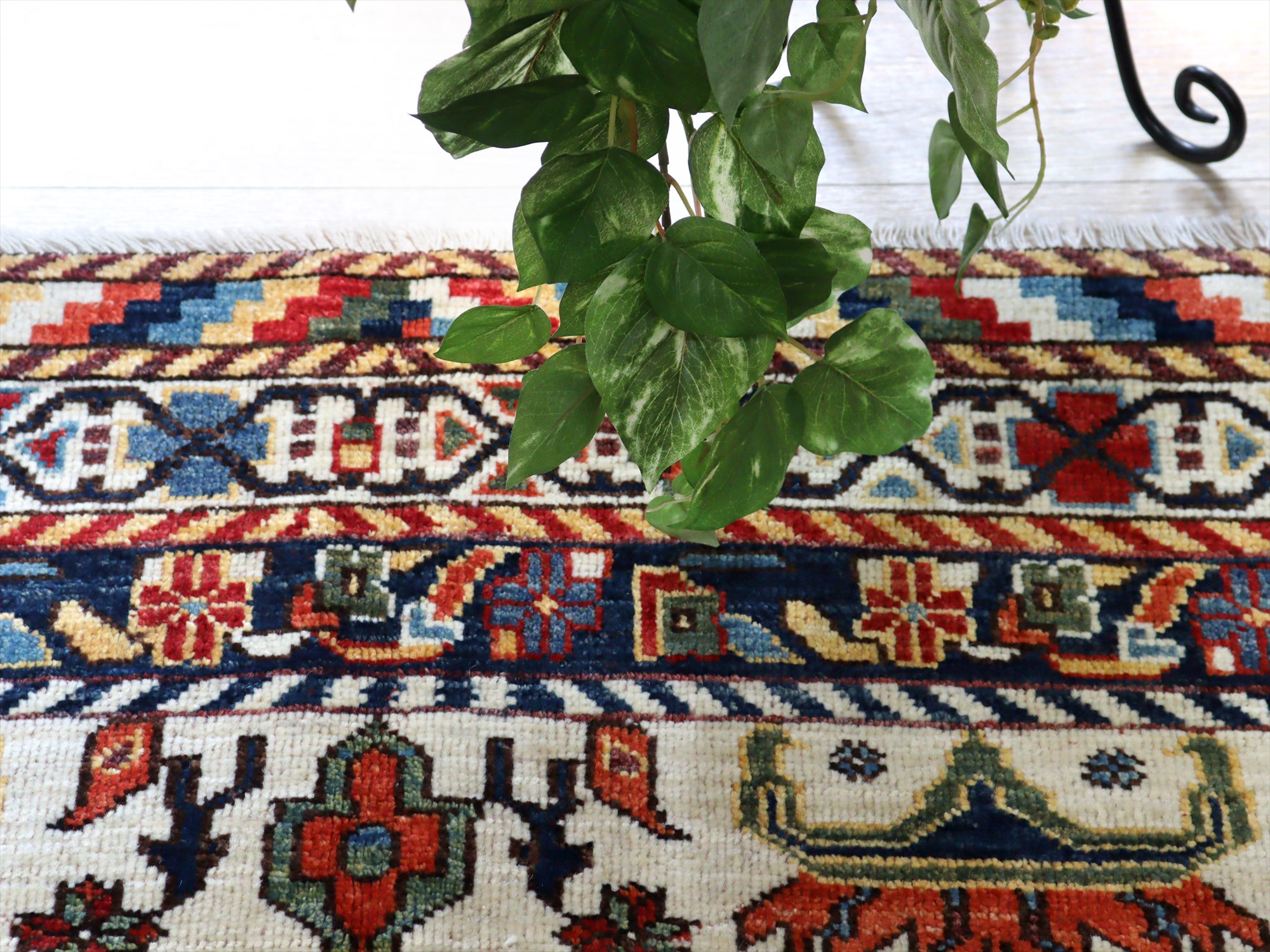 ベージュベースに、幾何学模様や小花、それにチューリップと思しきものが描かれたデザイン。こちらの絨毯は、天然染料により染色された手紡ぎの糸を使い、織られたものとされています。鮮やかで、華やかな色使いがトルコ絨毯らしい雰囲気を漂わせています。