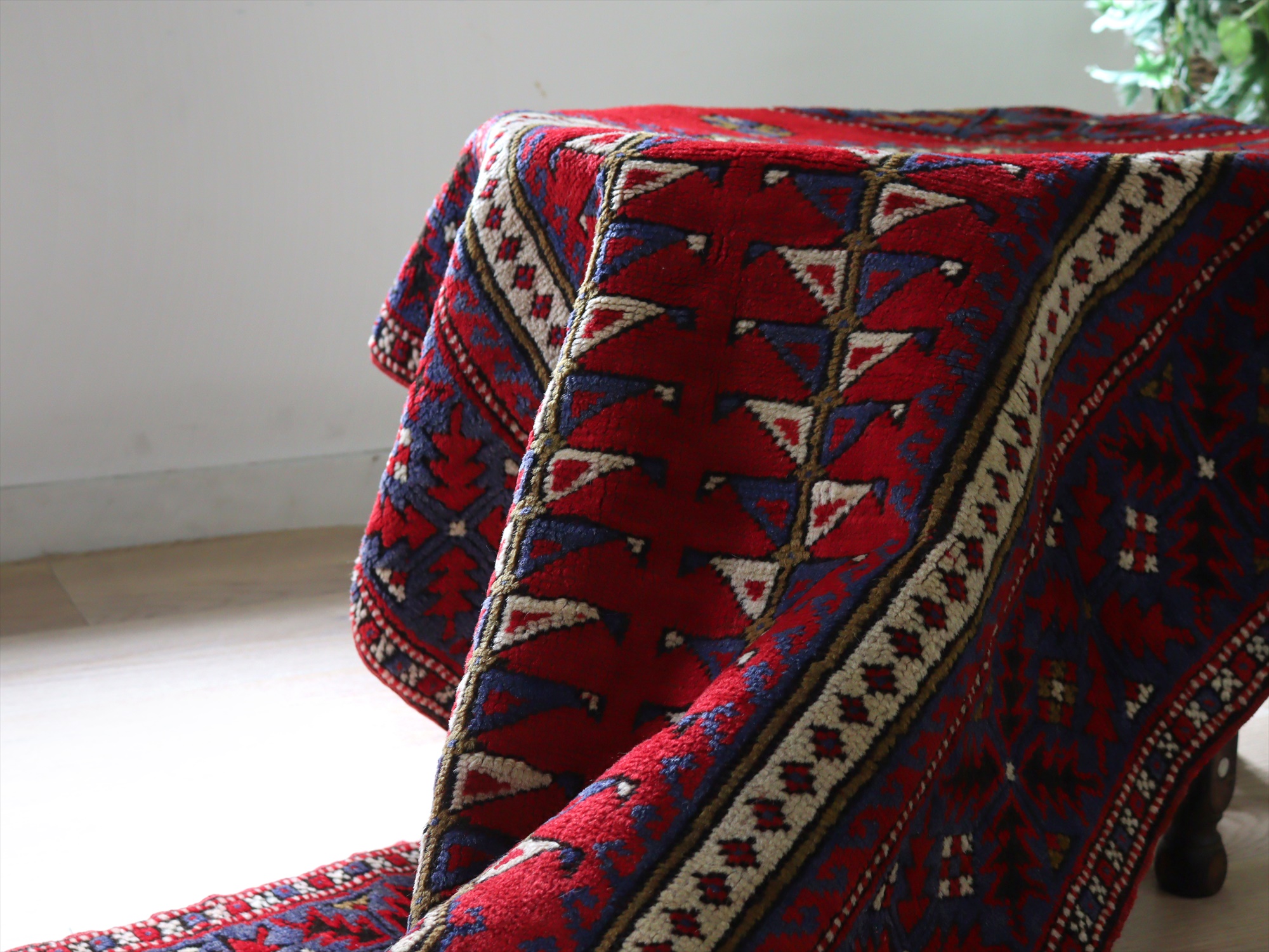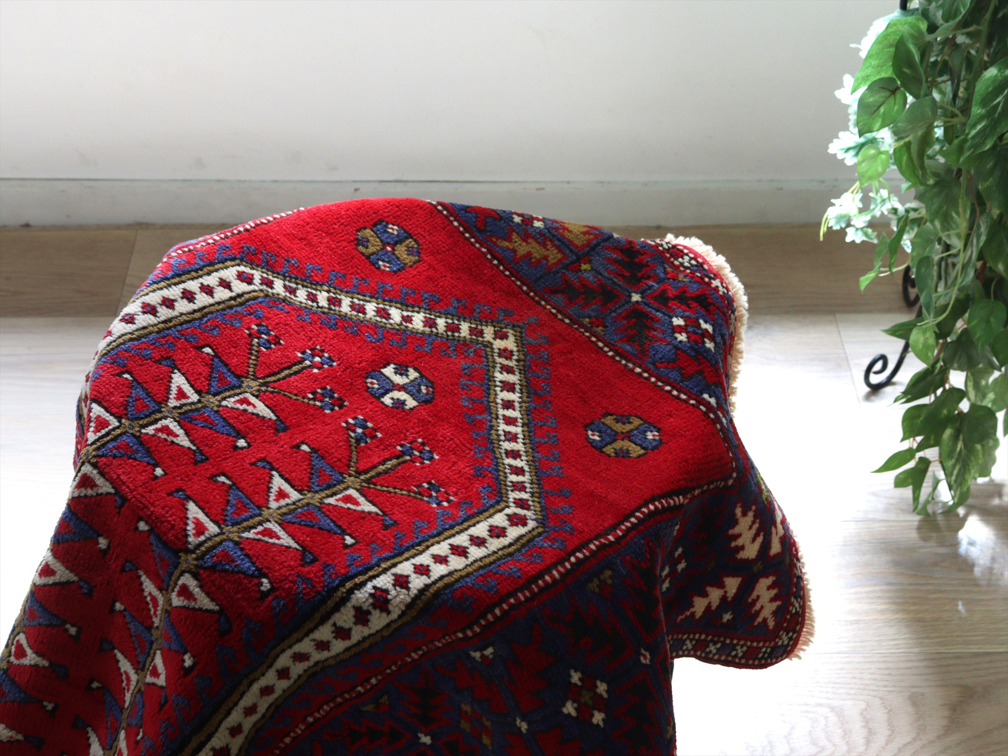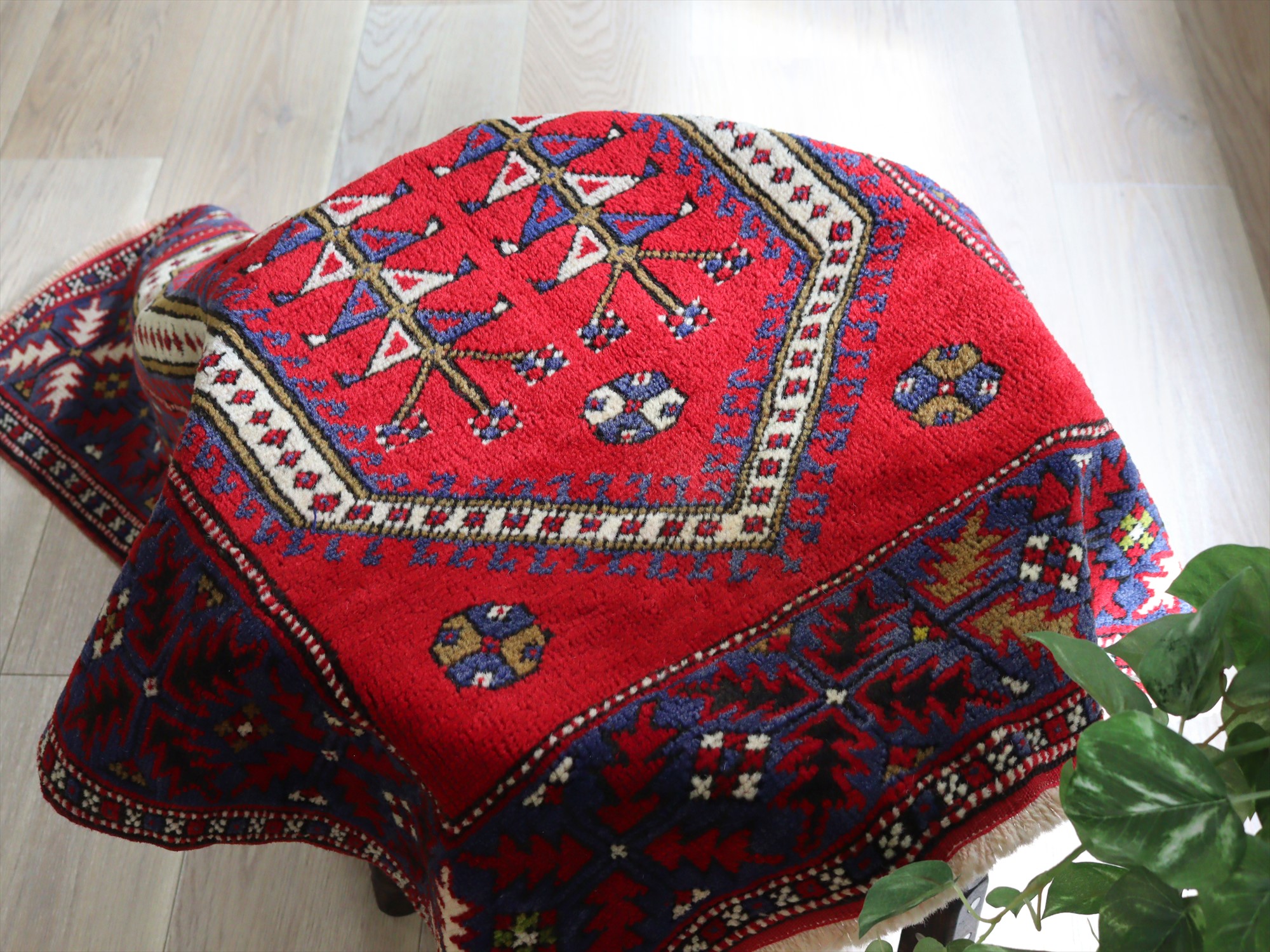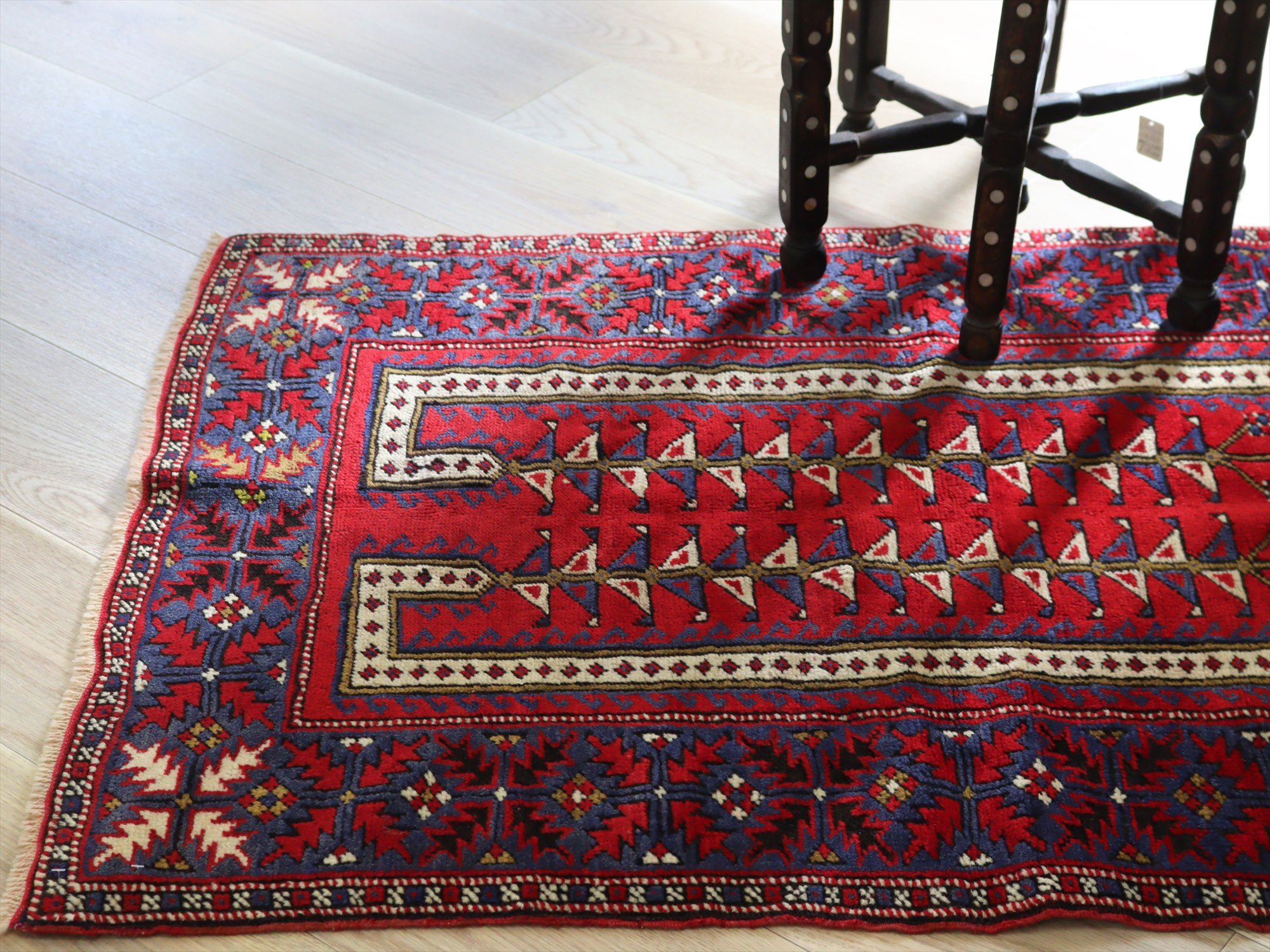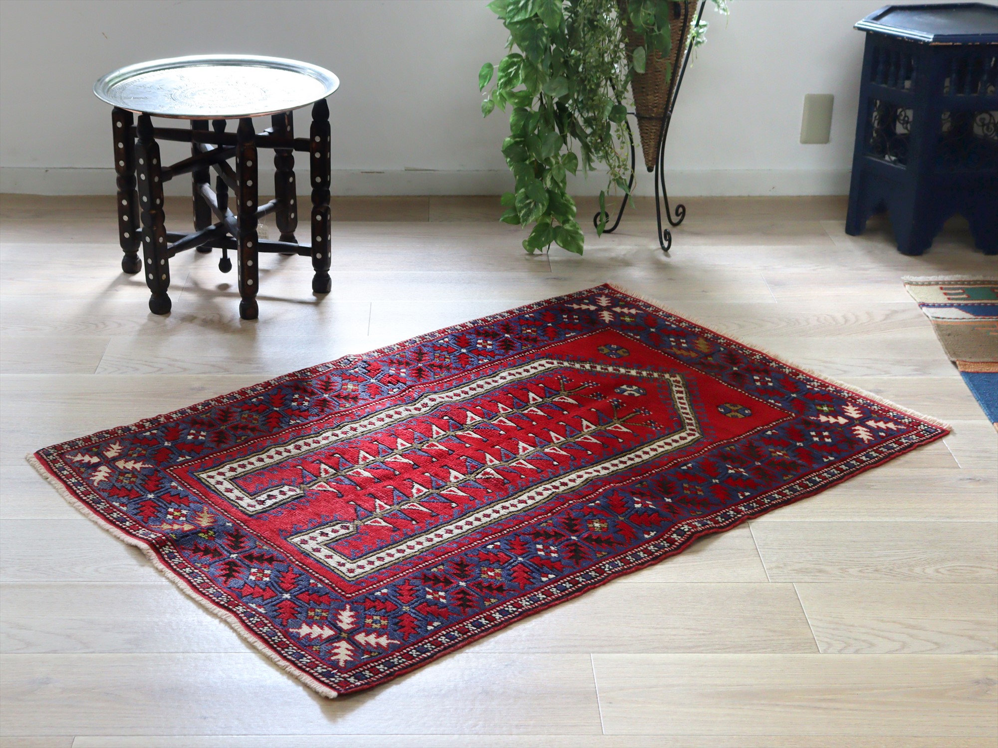 レッドと紫がかったネイビーのコンビネーションに、お祈りのくぼみを示すミフラープと、その中に生命の樹が織られたデザイン。エキゾチックな色使いが目を引きます。