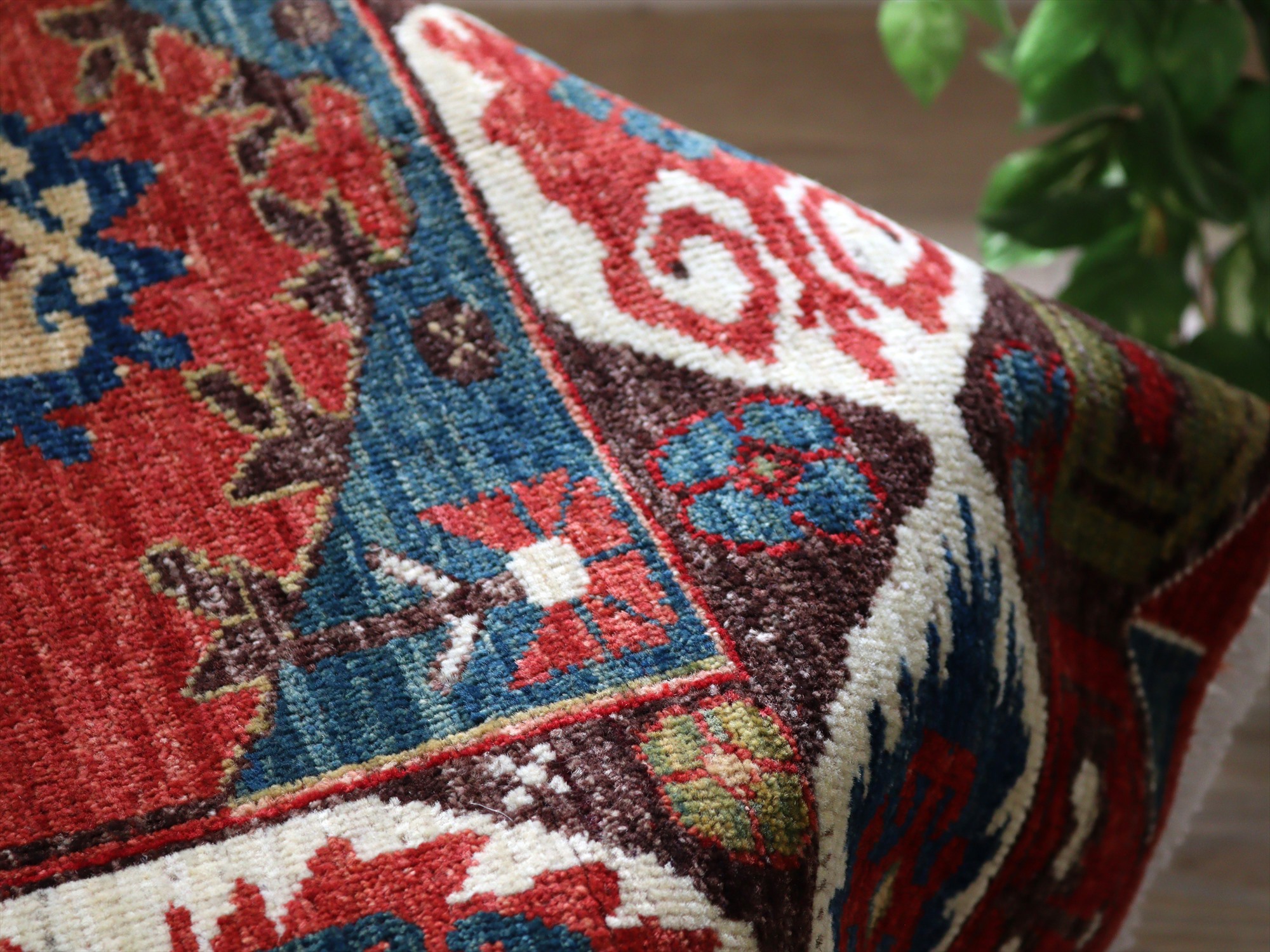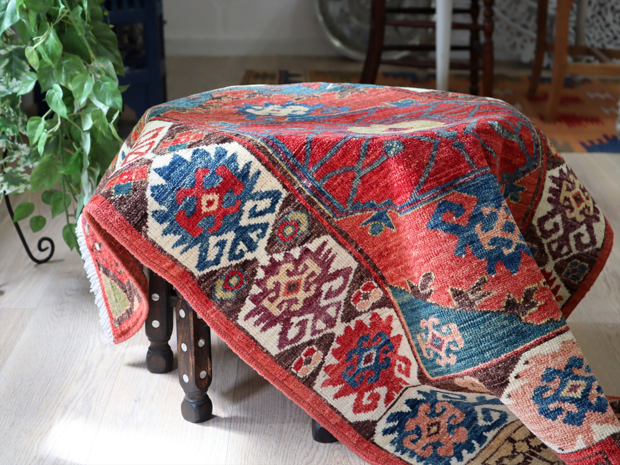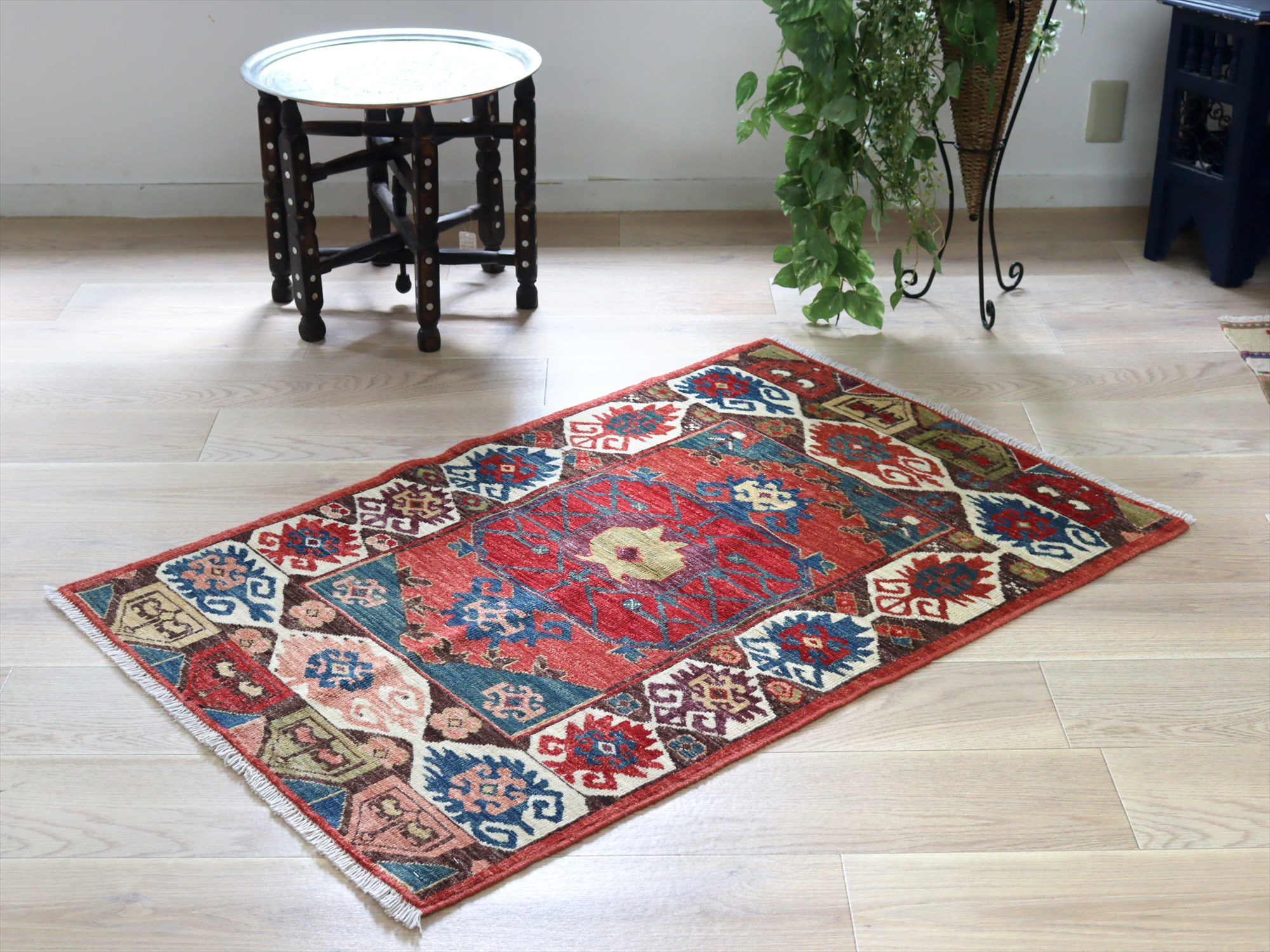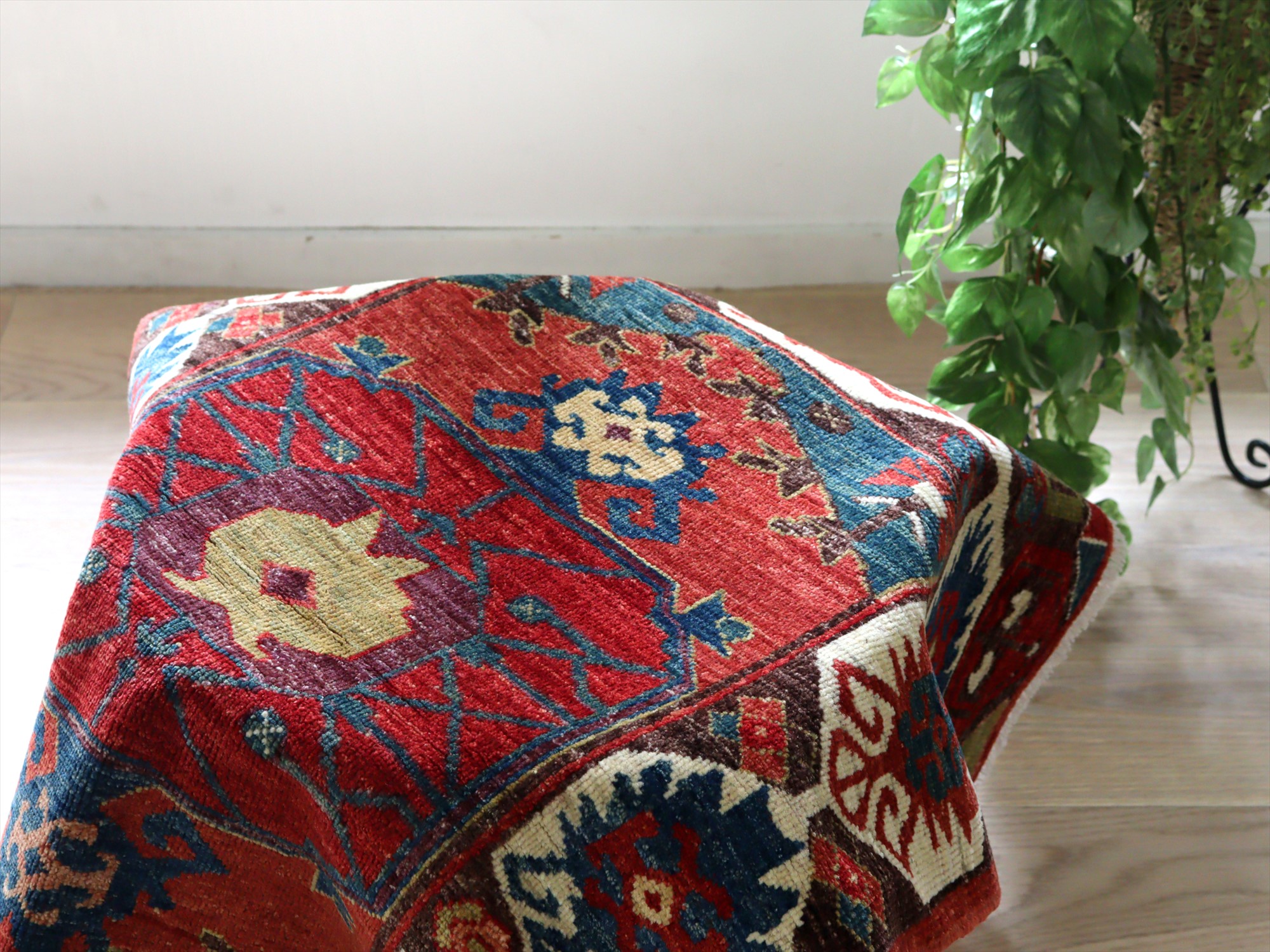 中央に大きな花形のメダリオン、そのまわりには大柄の幾何学模様が織られています。こちらの幾何学模様は、サソリのモチーフを変形させたようなデザインのようにも見えます。鮮やかな色使いながら、どことなくくすんでいて、こなれた感が出ています。