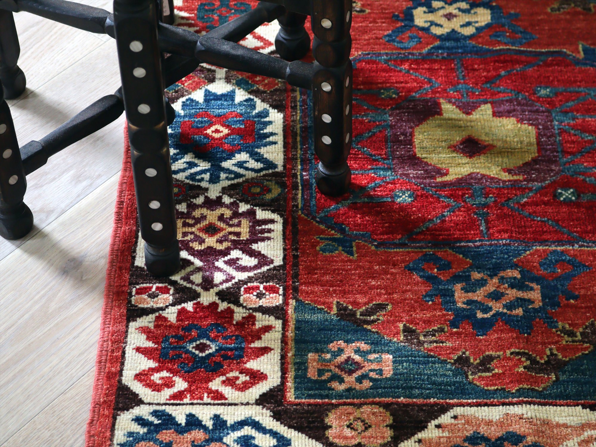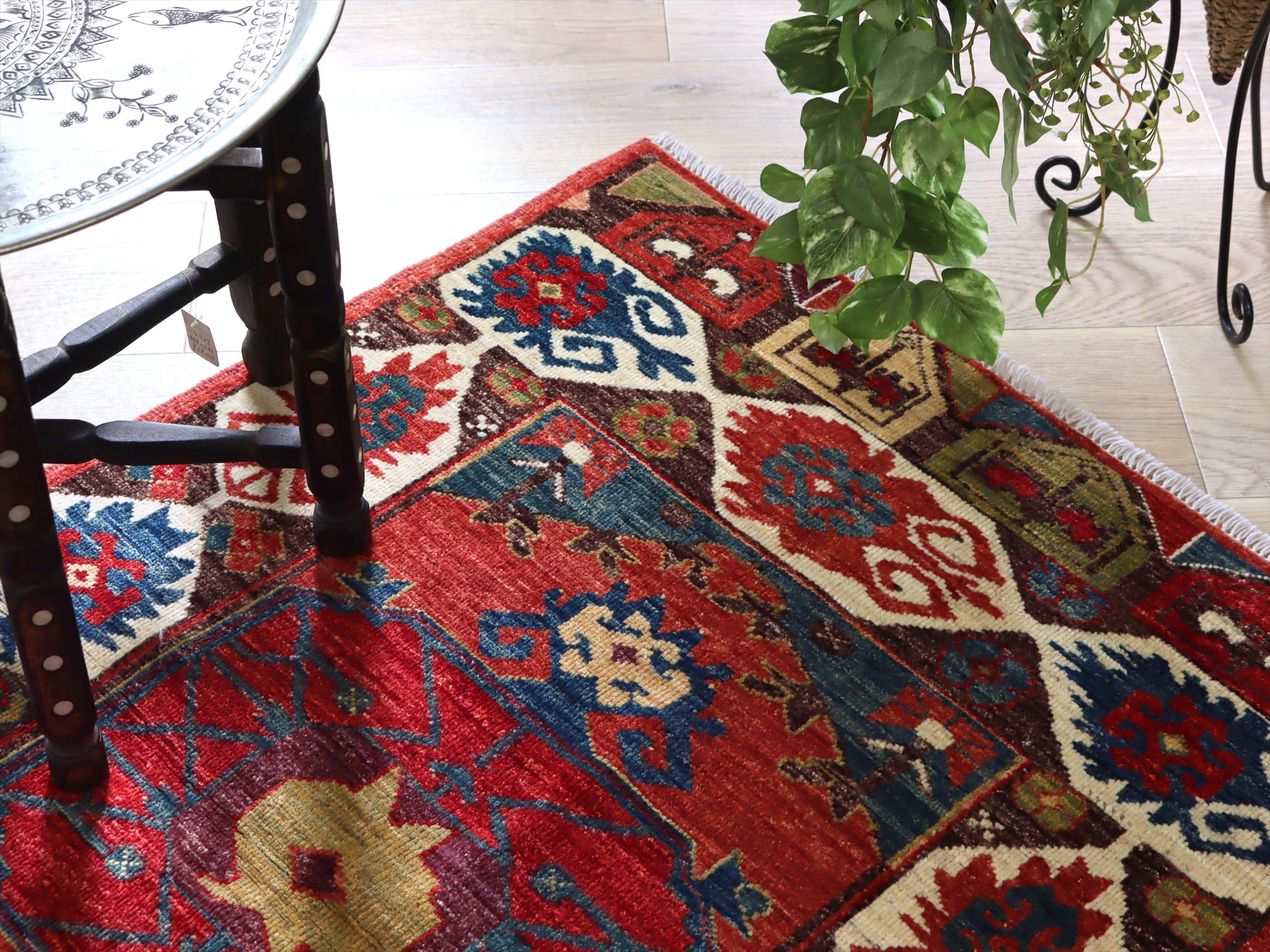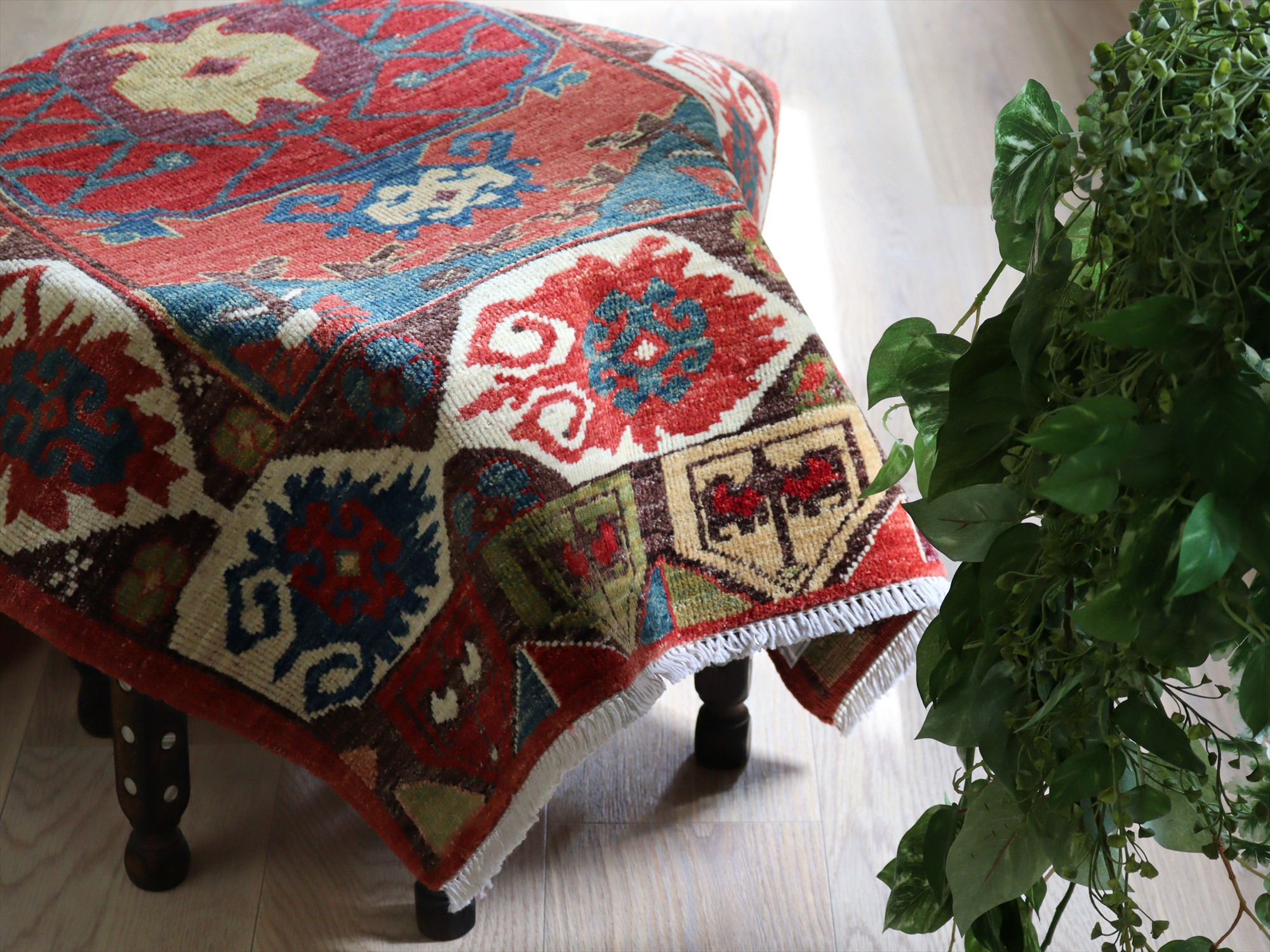 中央に大きな花形のメダリオン、そのまわりには大柄の幾何学模様が織られています。こちらの幾何学模様は、サソリのモチーフを変形させたようなデザインのようにも見えます。鮮やかな色使いながら、どことなくくすんでいて、こなれた感が出ています。