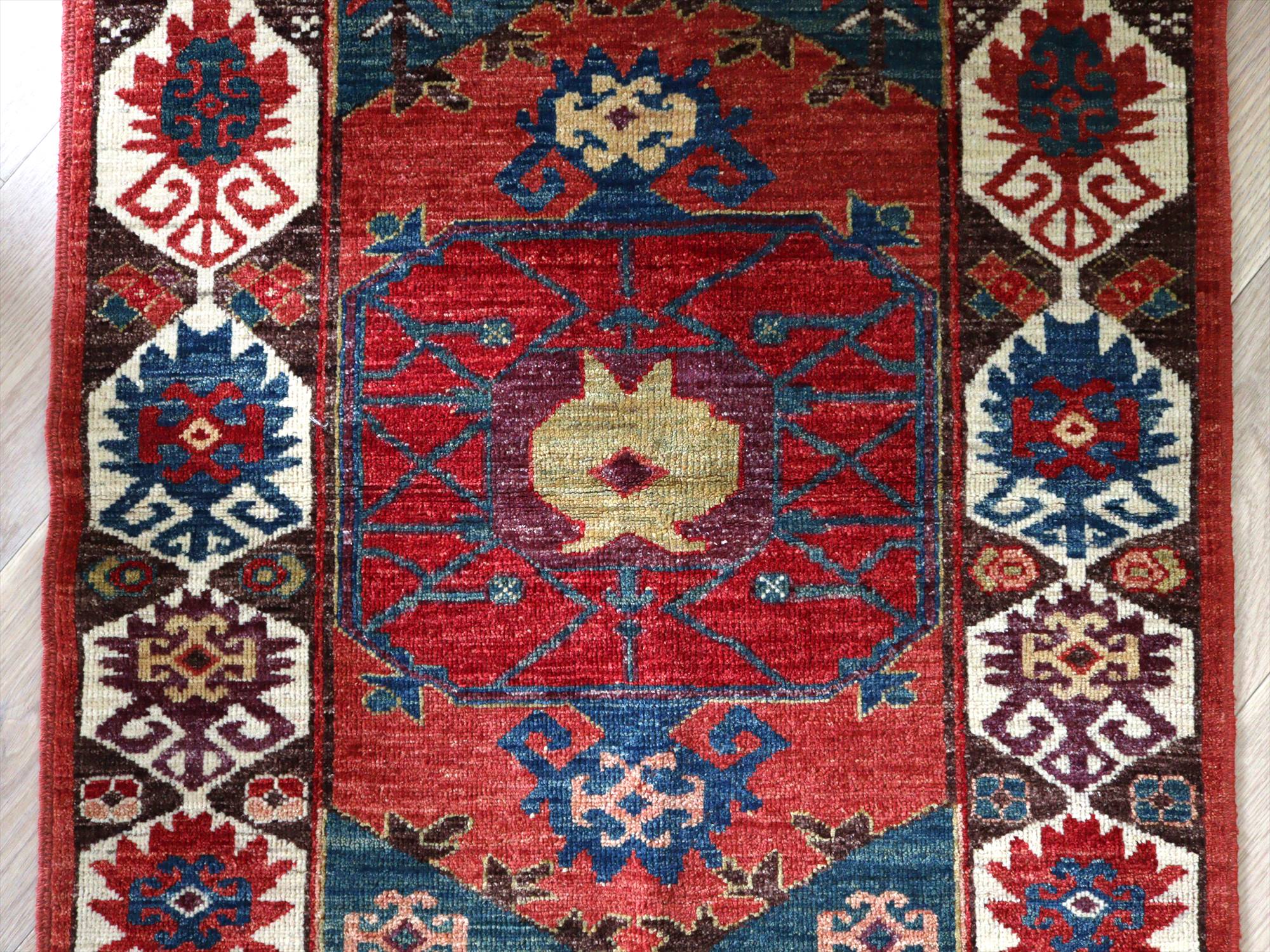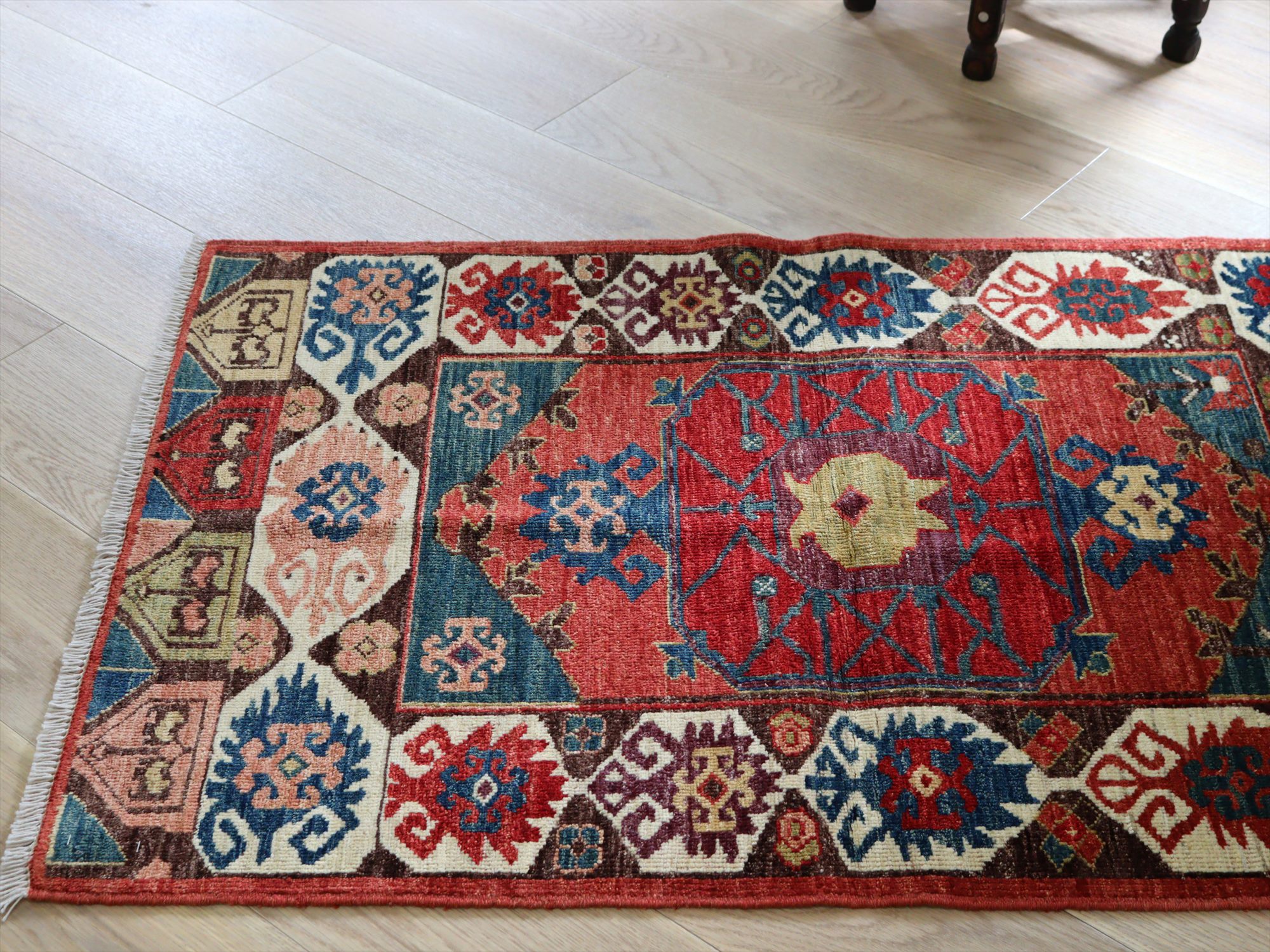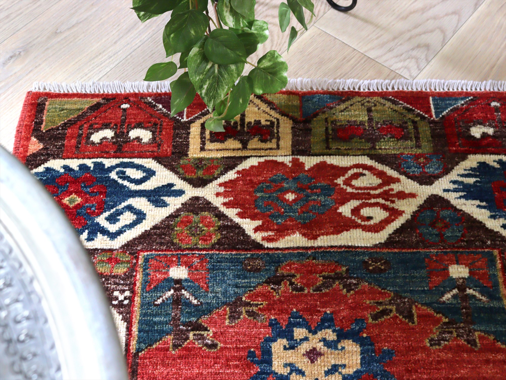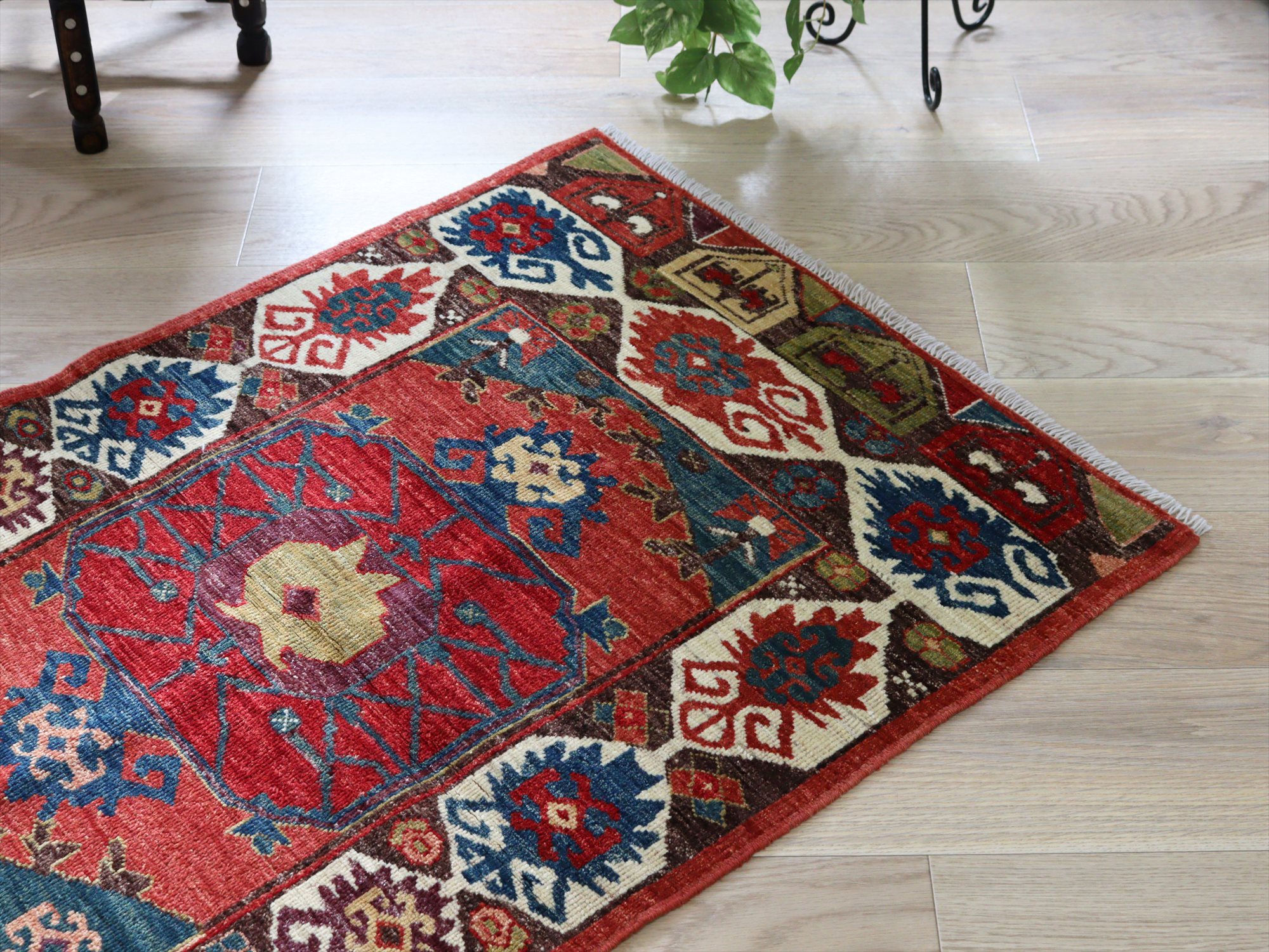 中央に大きな花形のメダリオン、そのまわりには大柄の幾何学模様が織られています。こちらの幾何学模様は、サソリのモチーフを変形させたようなデザインのようにも見えます。鮮やかな色使いながら、どことなくくすんでいて、こなれた感が出ています。