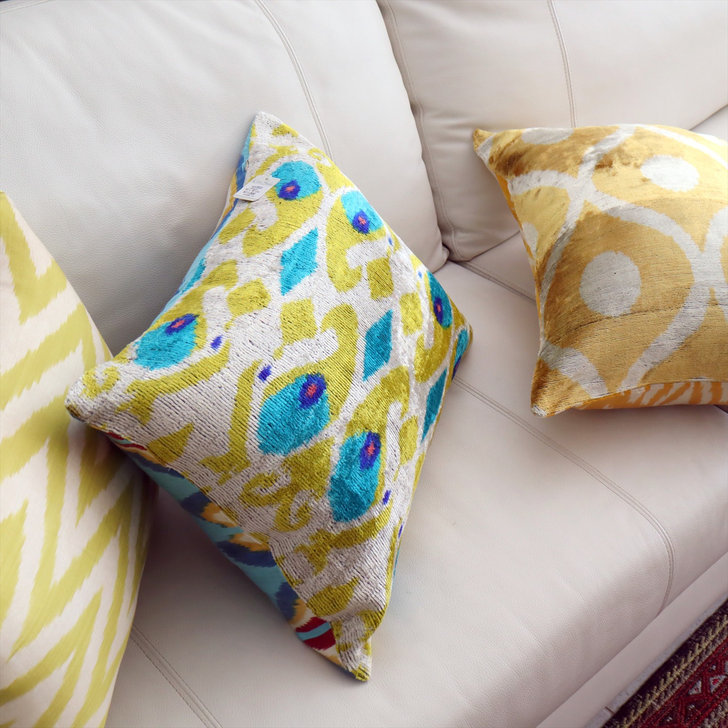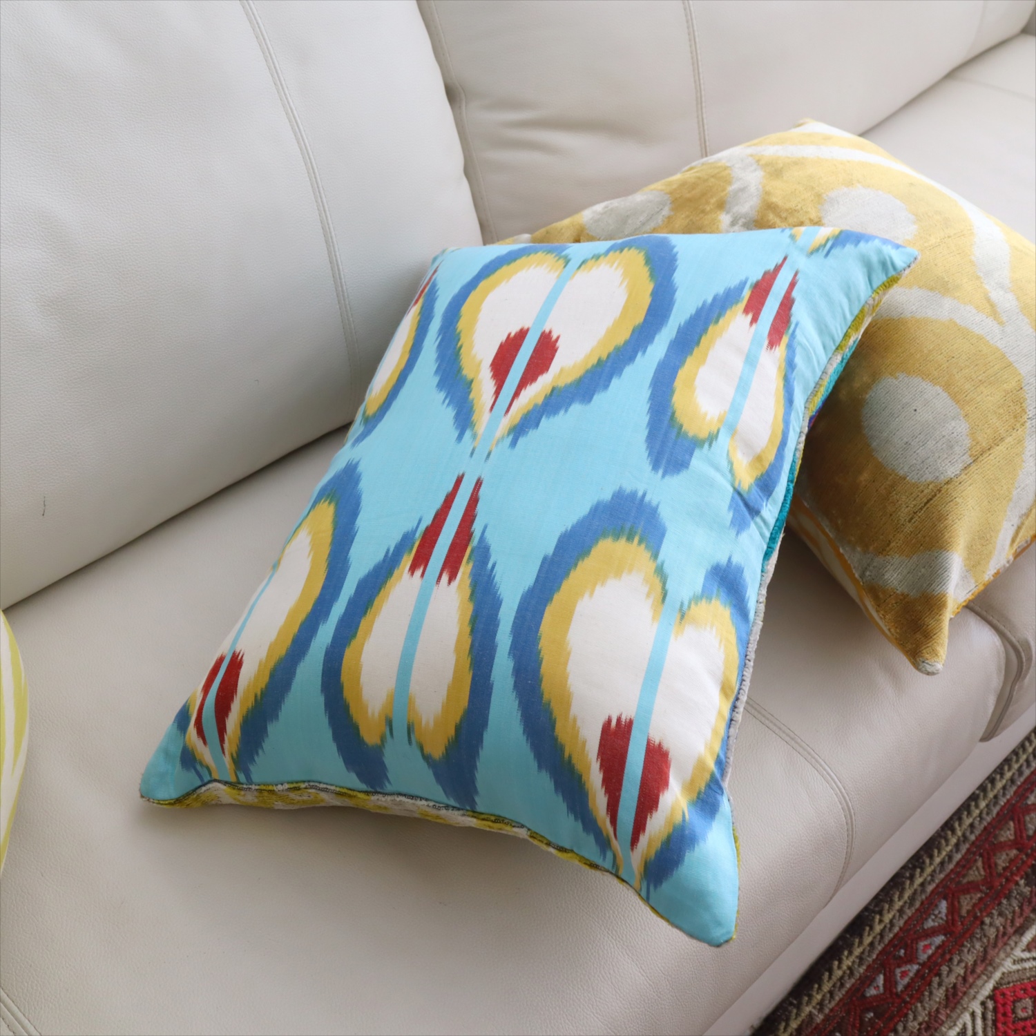 ウズベキスタンで「アトラス」と呼ばれる、中央アジアの女性たちの衣装用に織られた、手機織りの絣布(かすり・イカット)を使ったクッションカバー。