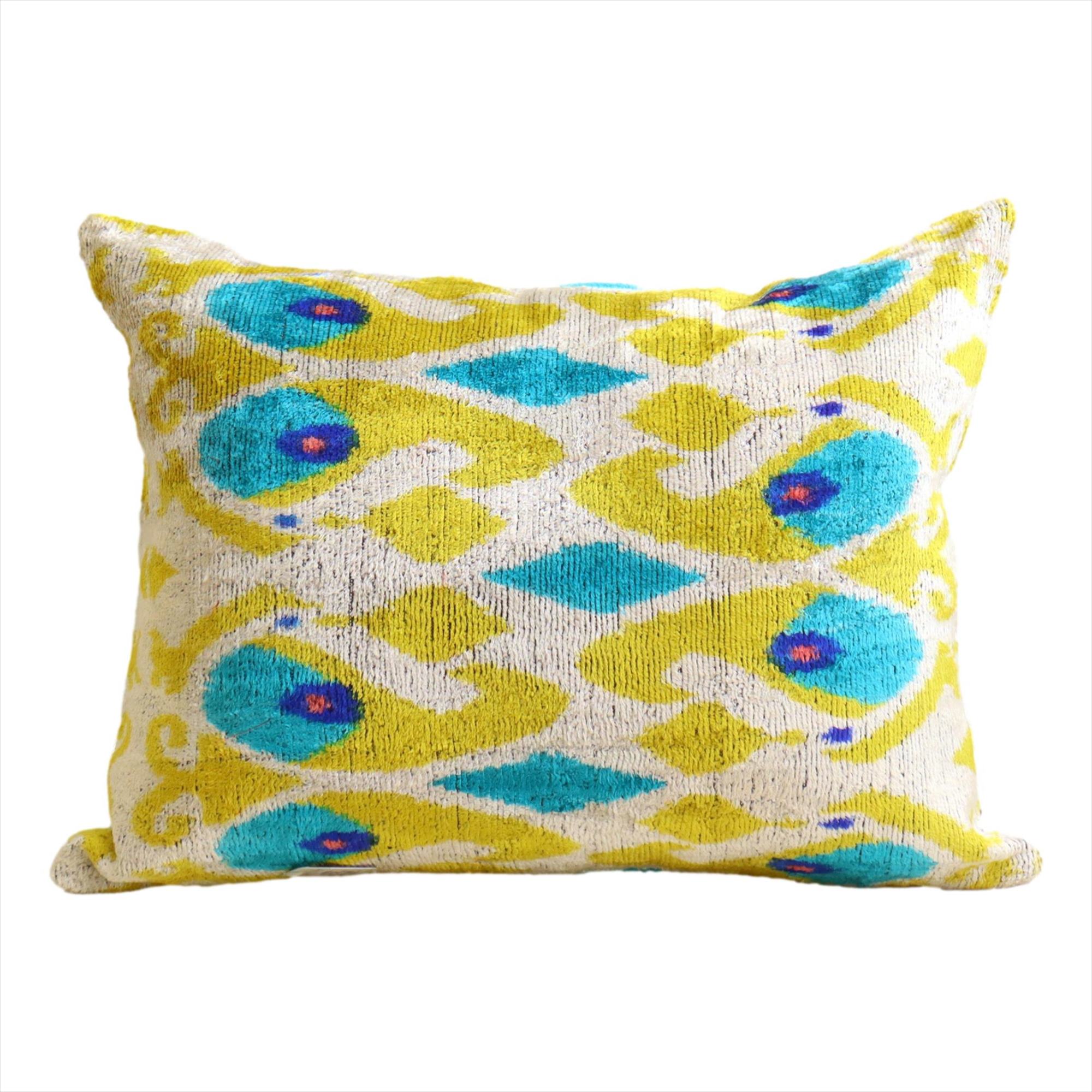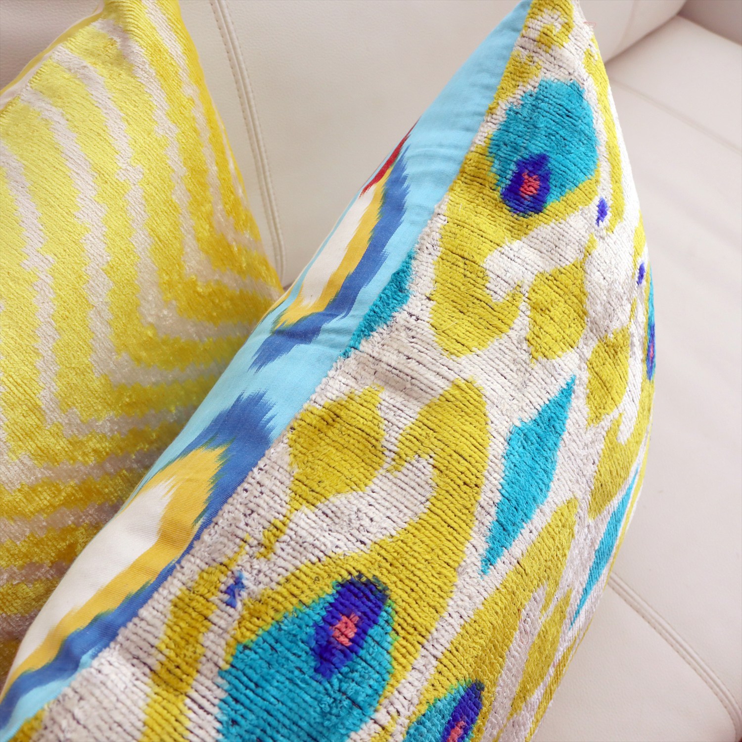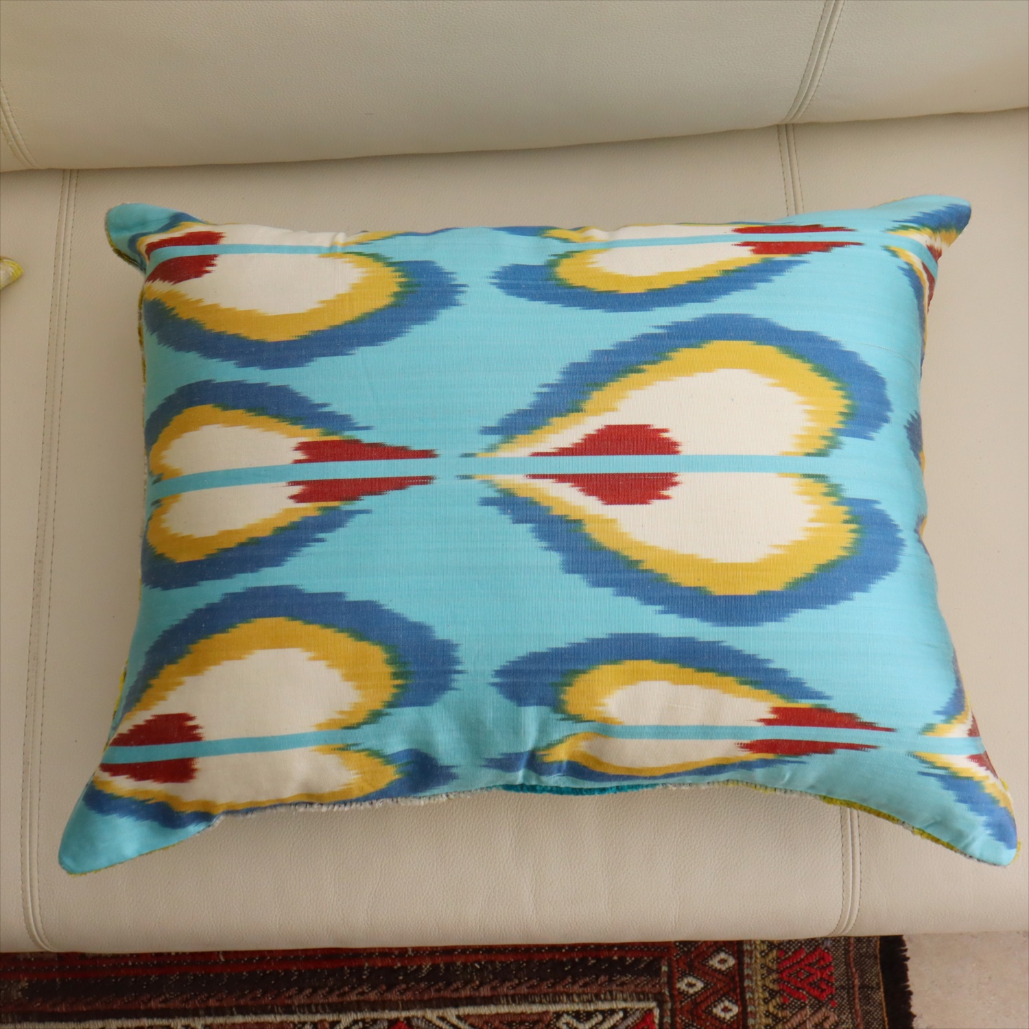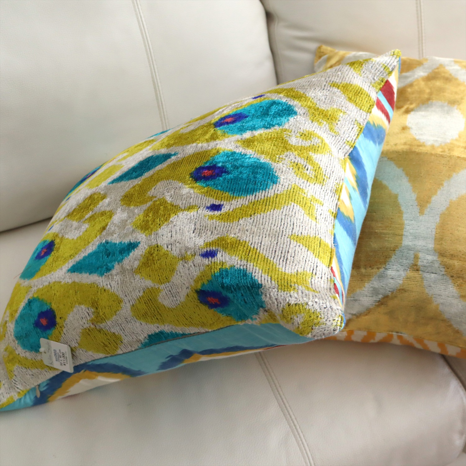 - アトラス ベルベットイカットクッションカバー 両面シルク ライトグリーン ターコイズ ペイズリー Silk Velvet Cushion - Double-Sided Design