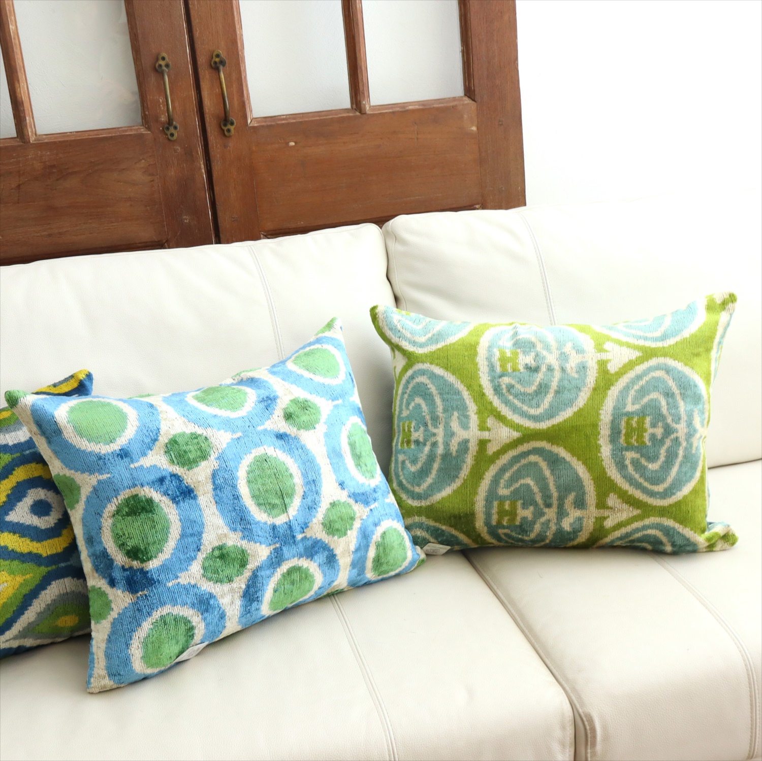 ウズベキスタンで「アトラス」と呼ばれる、中央アジアの女性たちの衣装用に織られた、手機織りの絣布(かすり・イカット)を使ったクッションカバー。
