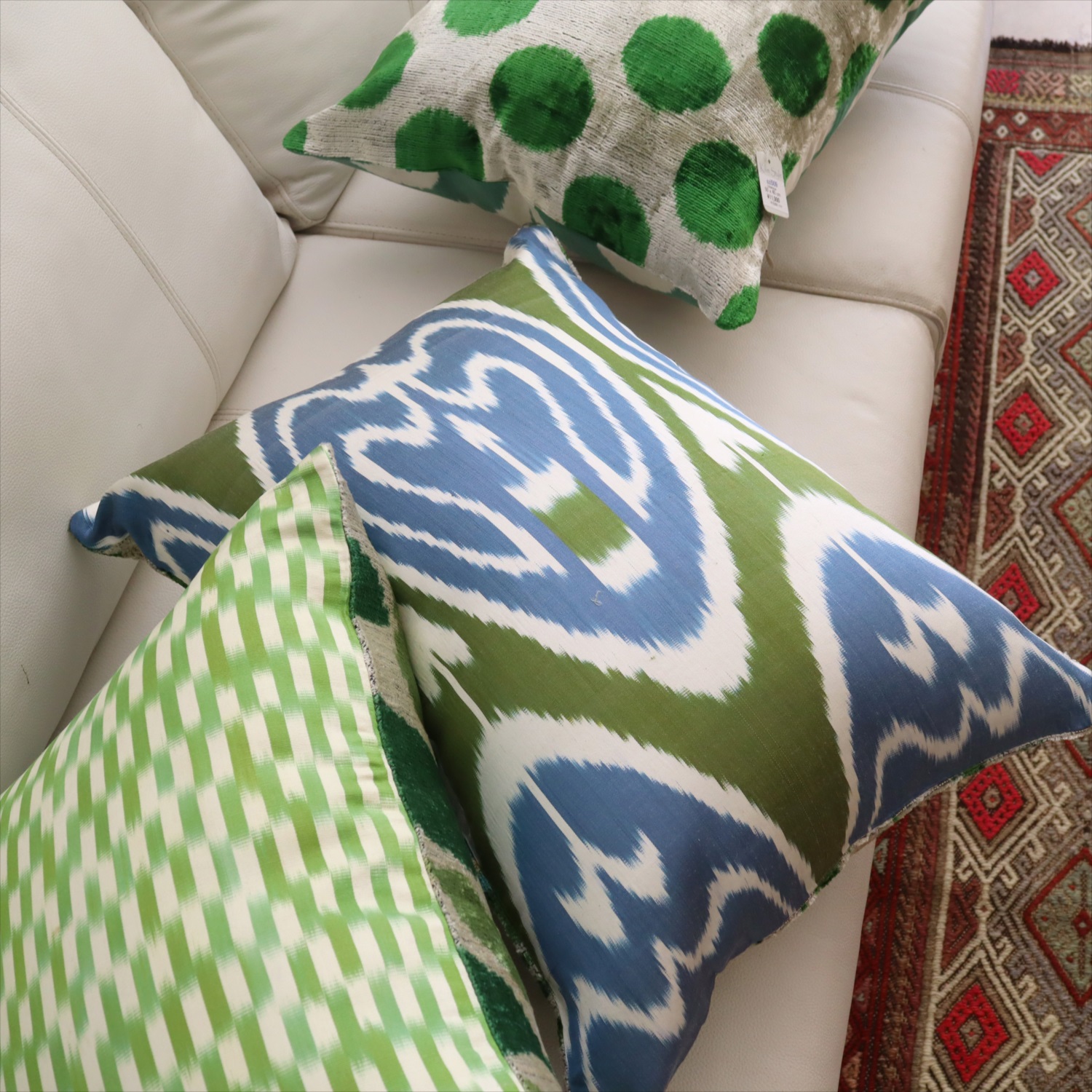- アトラス ベルベットイカットクッションカバー 両面シルク クジャクの羽 アイボリーxグリーン Silk Velvet Cushion - Double-Sided Design