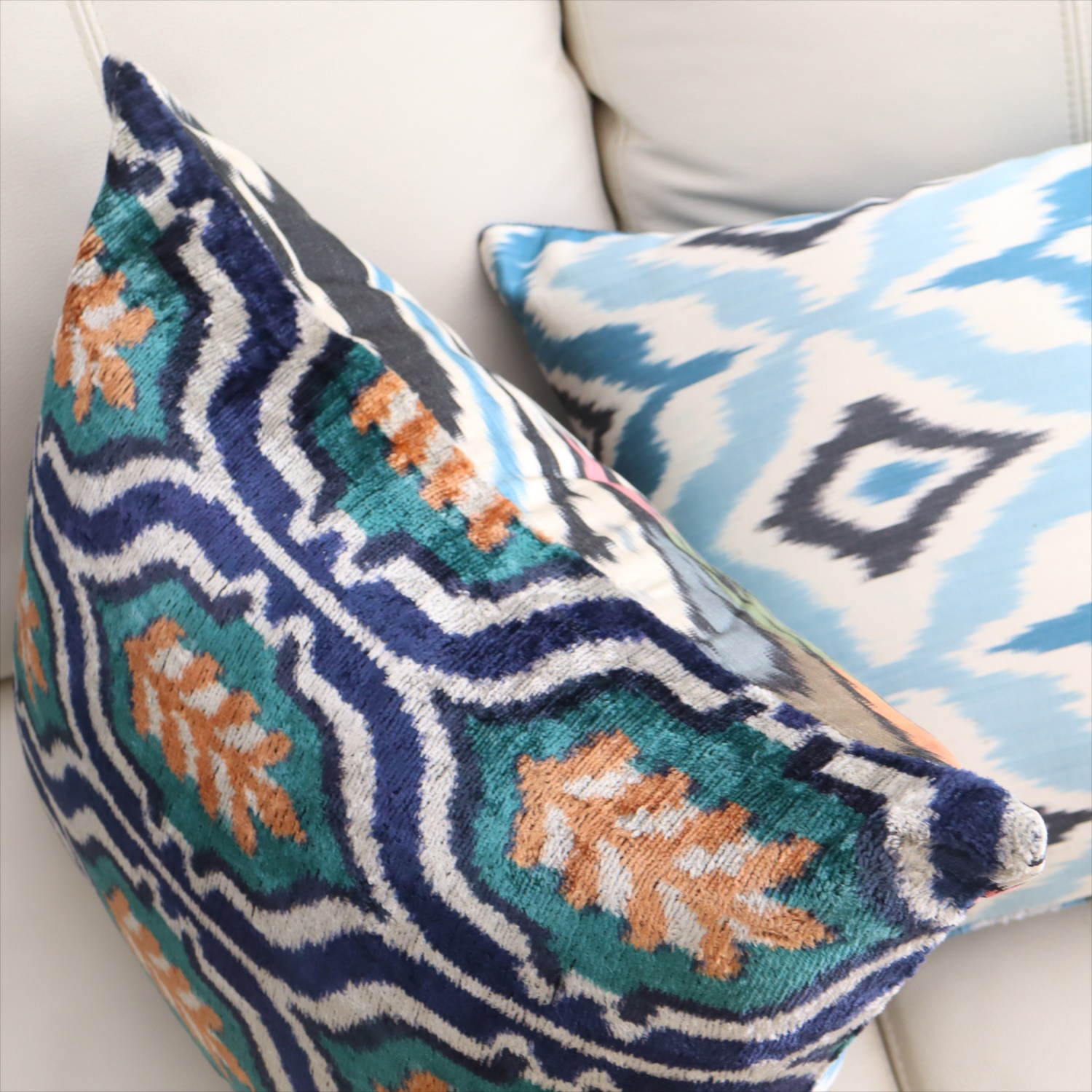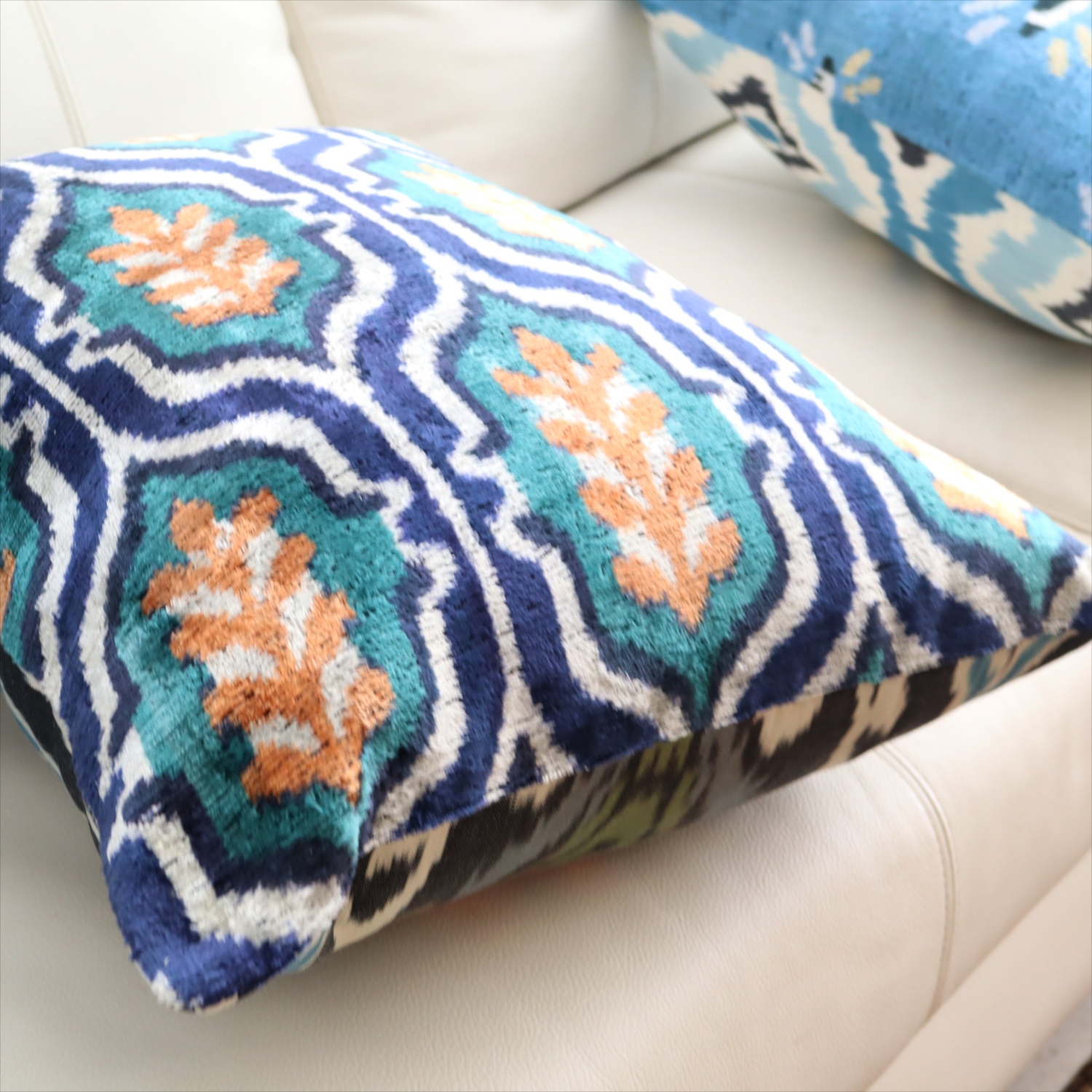 アトラス ベルベットイカットクッションカバー 両面シルク タイル柄 ブルーxグリーン Silk Velvet Cushion - Double-Sided Design