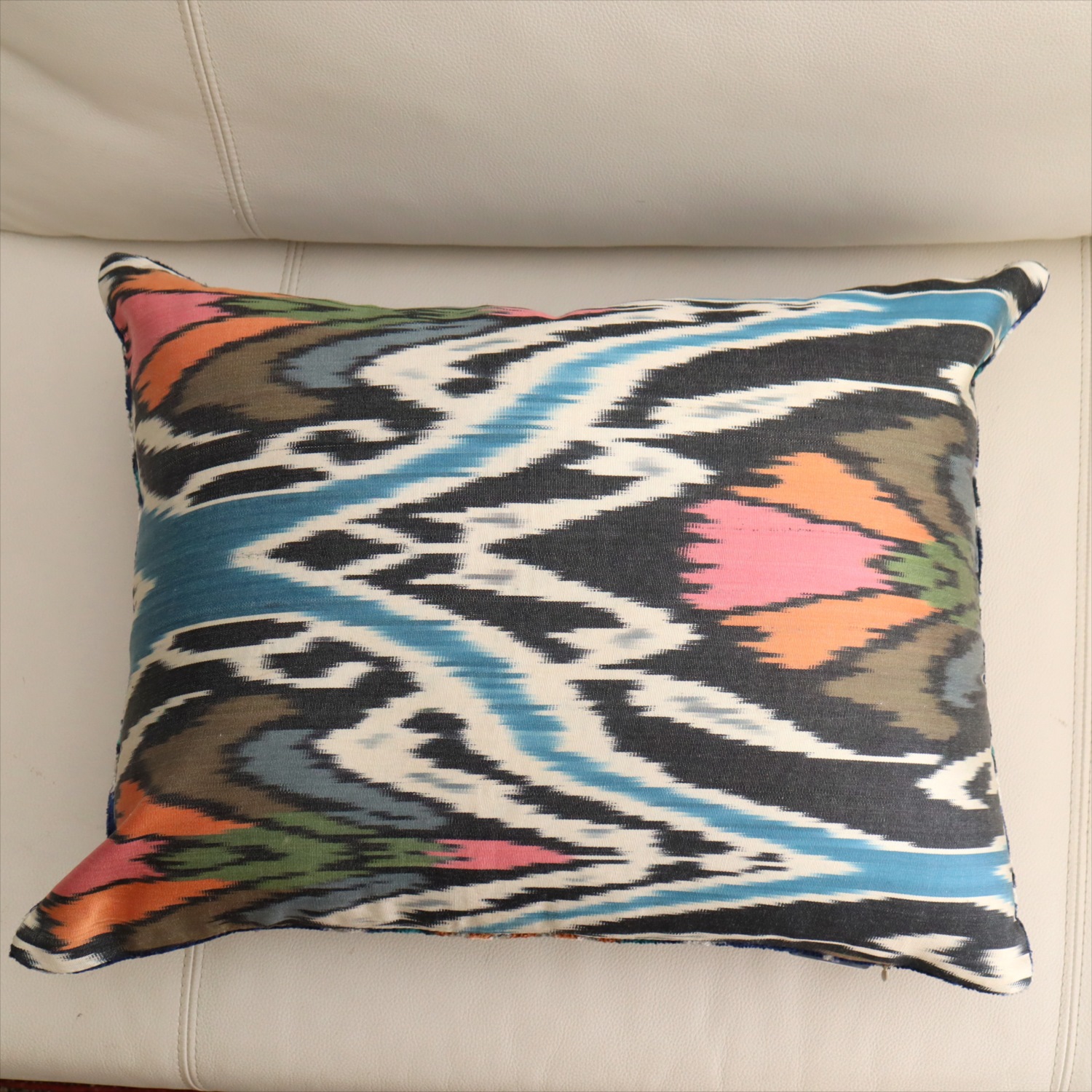ウズベキスタンで「アトラス」と呼ばれる、中央アジアの女性たちの衣装用に織られた、手機織りの絣布(かすり・イカット)を使ったクッションカバー。
