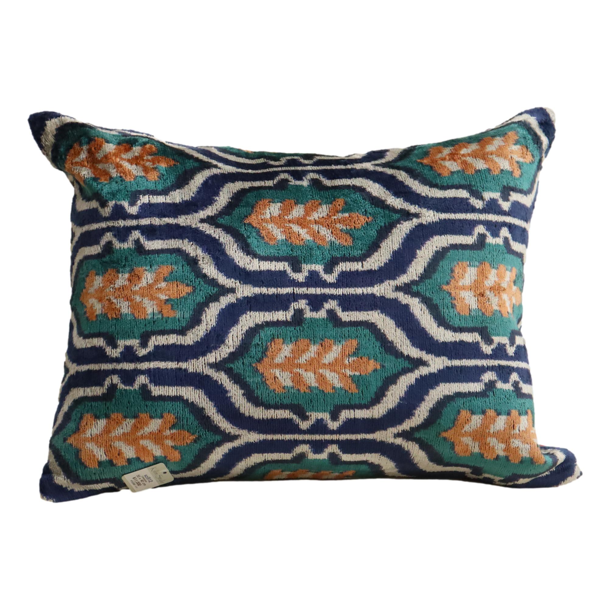 - アトラス ベルベットイカットクッションカバー 両面シルク タイル柄 ブルーxグリーン Silk Velvet Cushion - Double-Sided Design