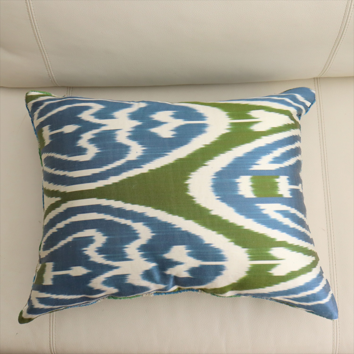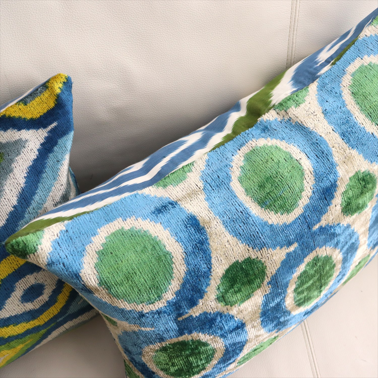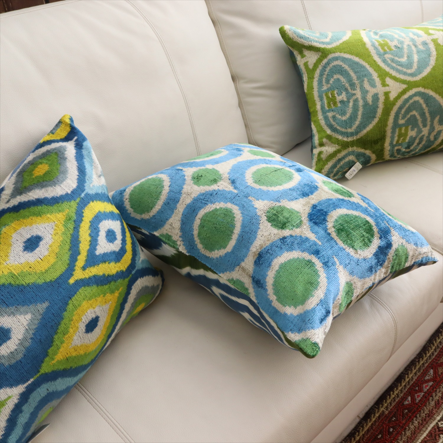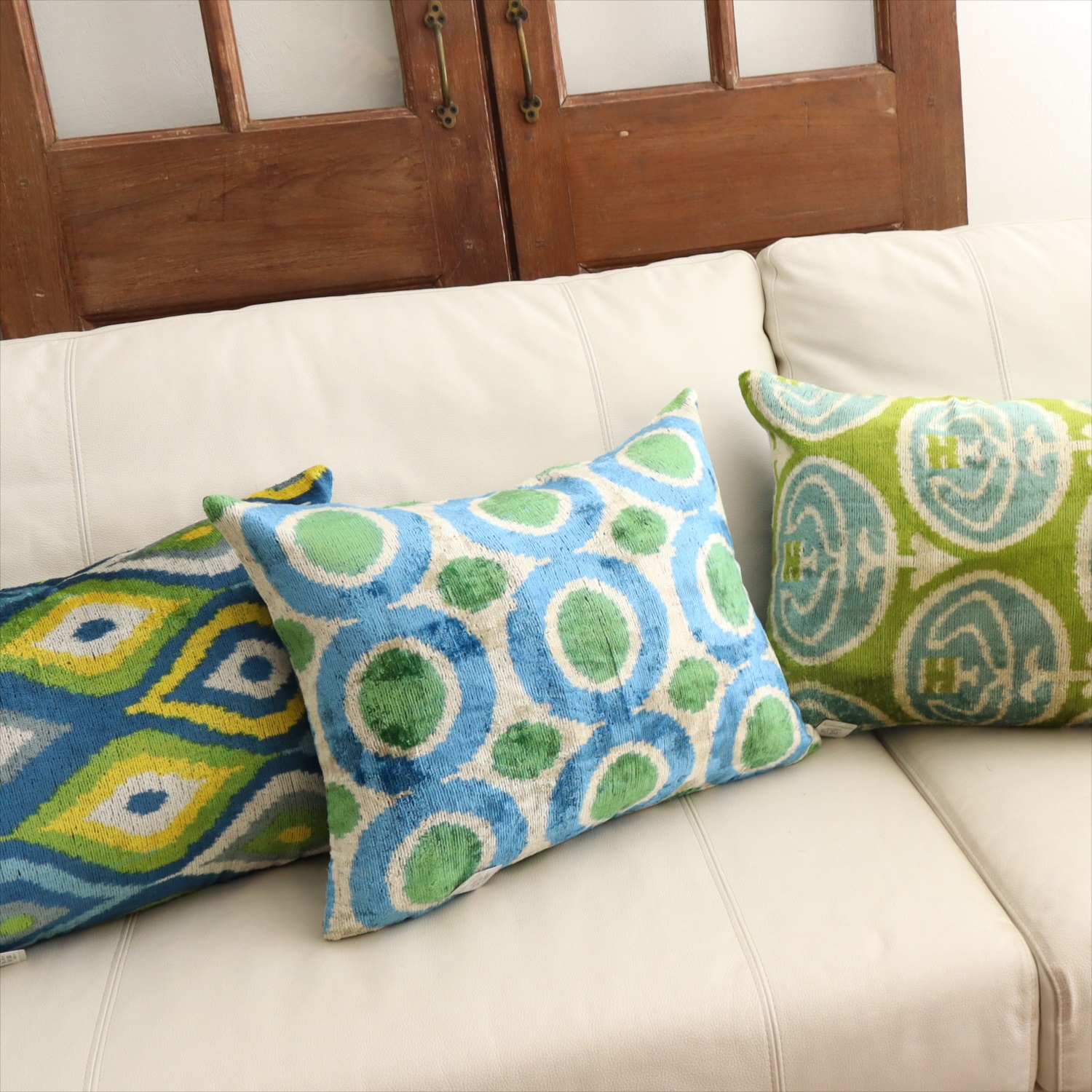 - アトラス ベルベットイカットクッションカバー 両面シルク ブルーxグリーン 水玉柄 泡 Silk Velvet Cushion - Double-Sided Design