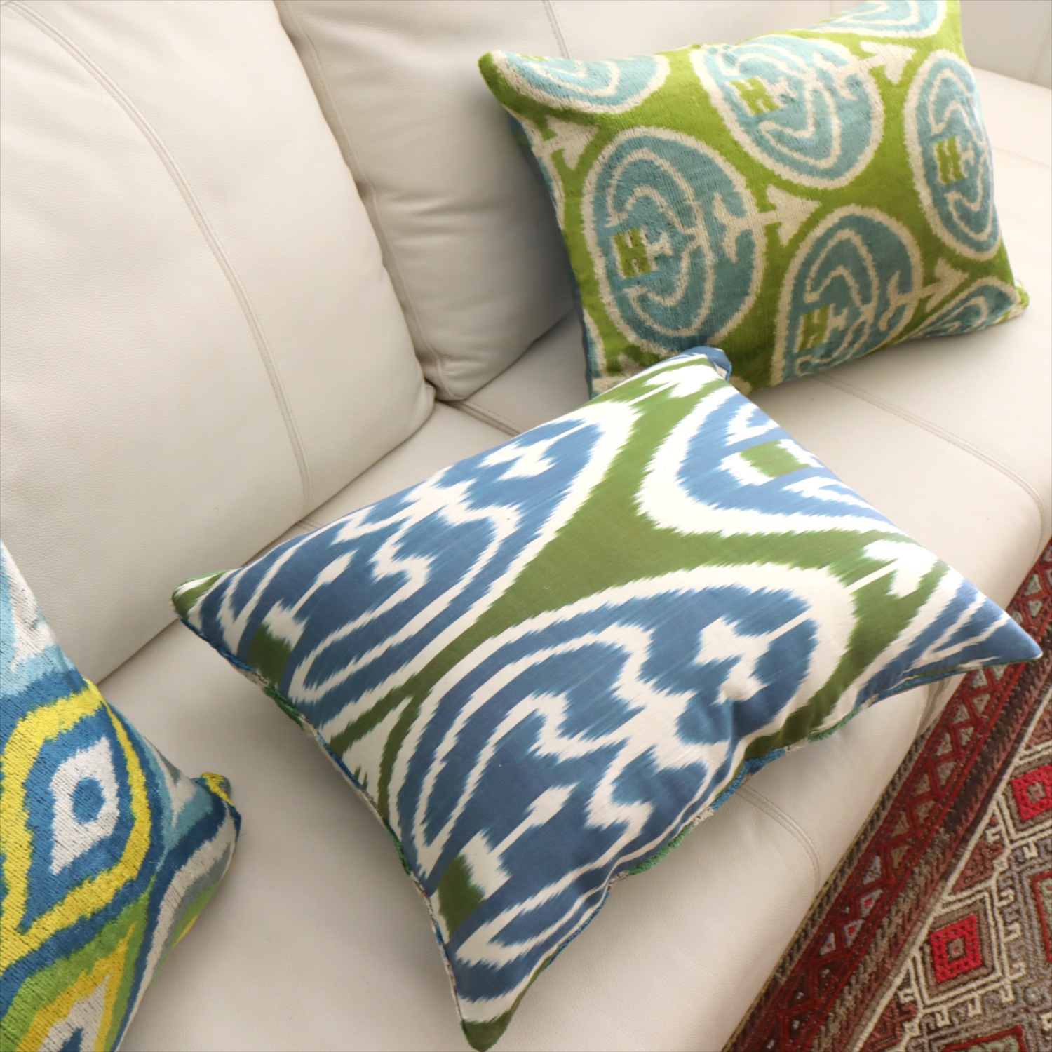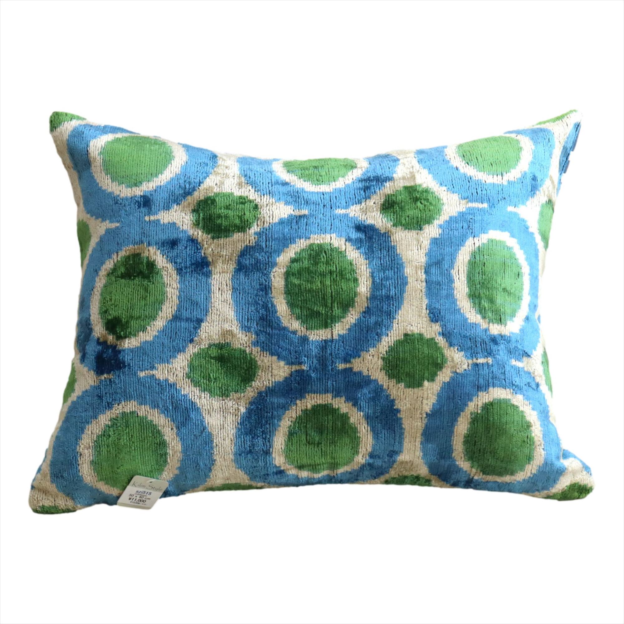 アトラス ベルベットイカットクッションカバー 両面シルク ブルーxグリーン 水玉柄 泡 Silk Velvet Cushion - Double-Sided Design