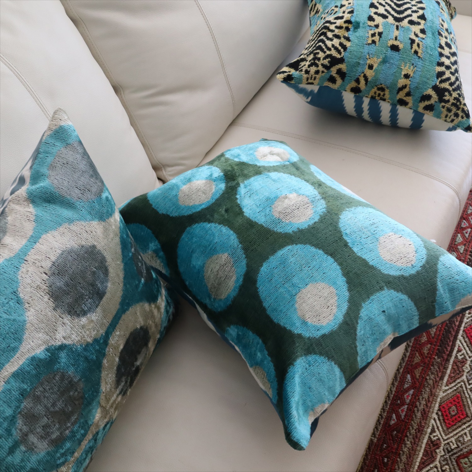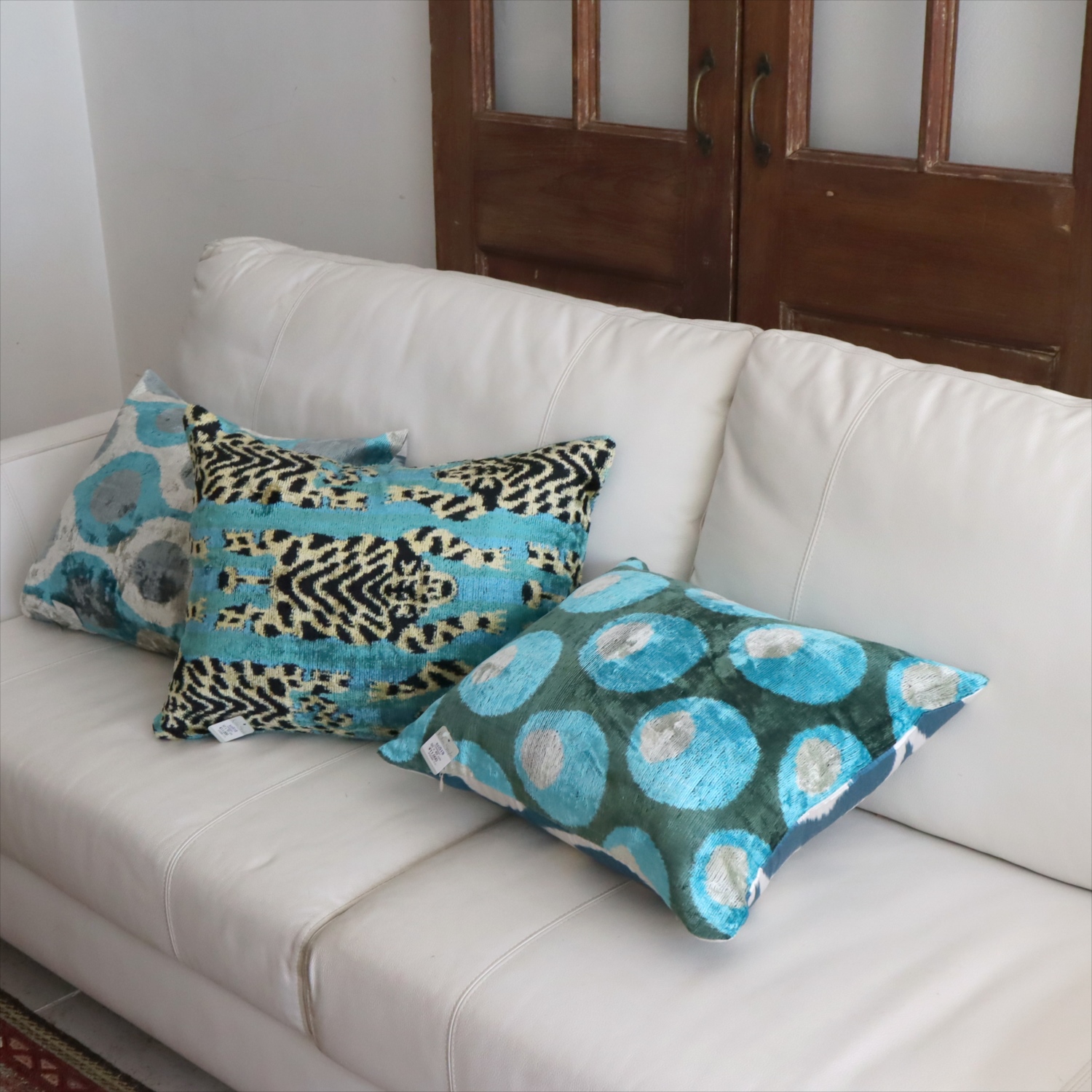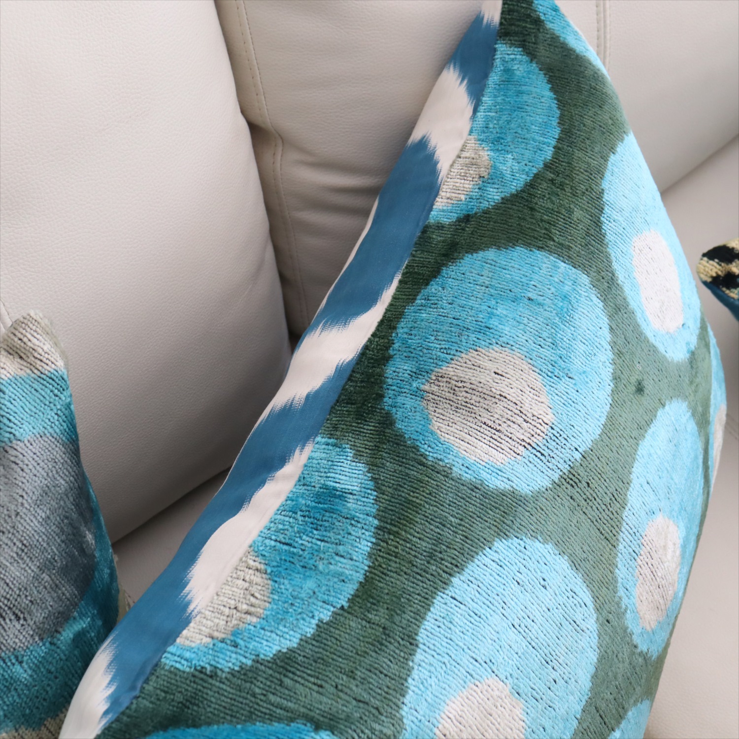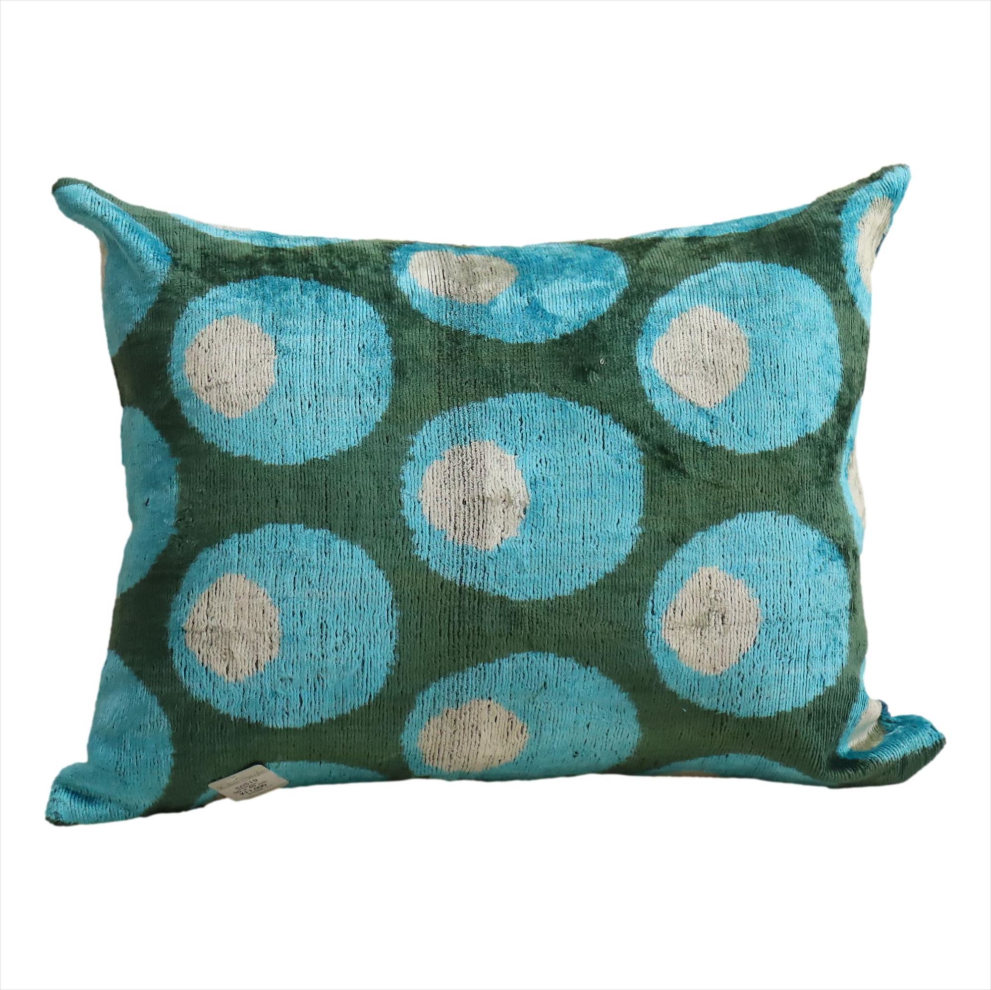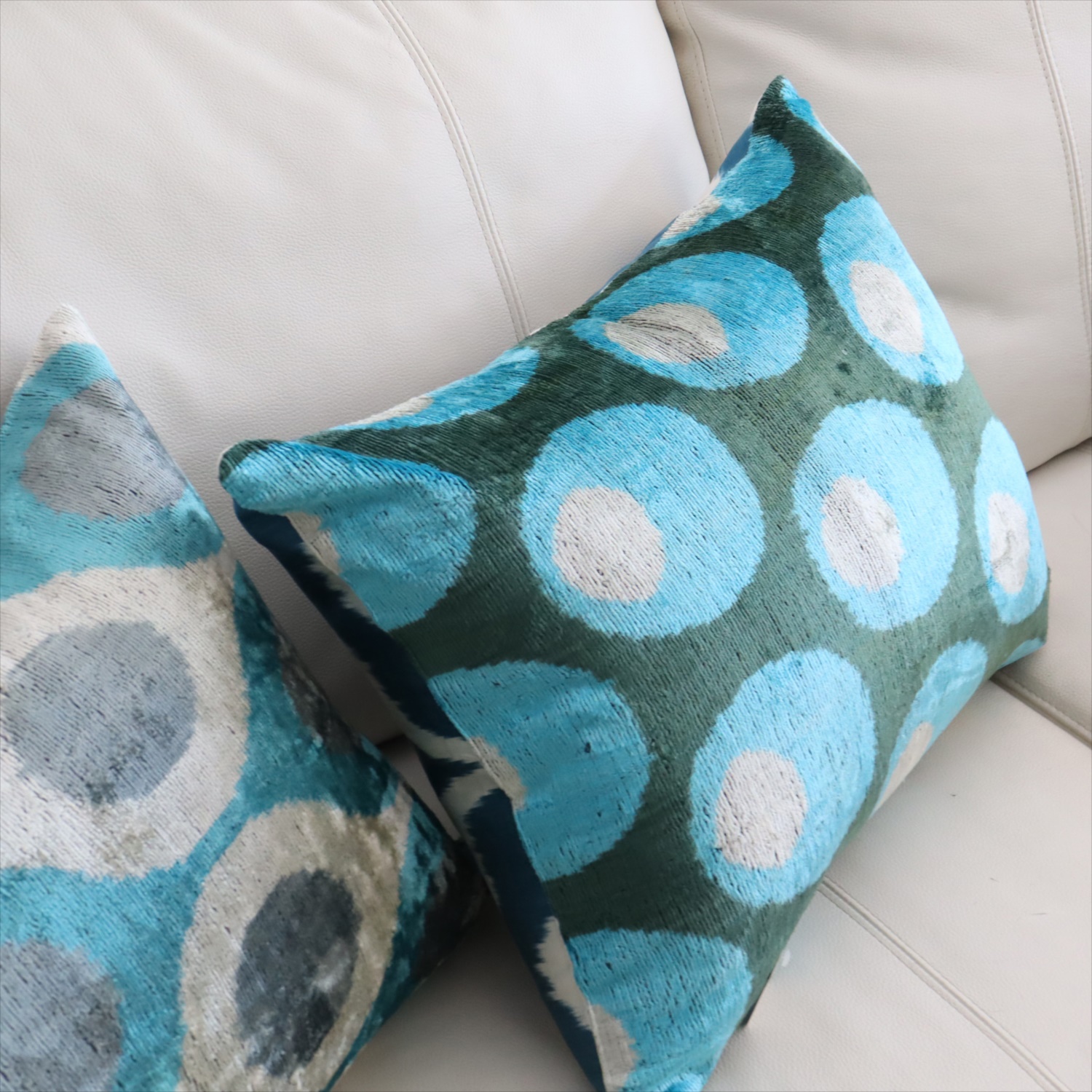アトラス ベルベットイカットクッションカバー 両面シルク 水玉 泡 グリーンx水色 Silk Velvet Cushion - Double-Sided Design
