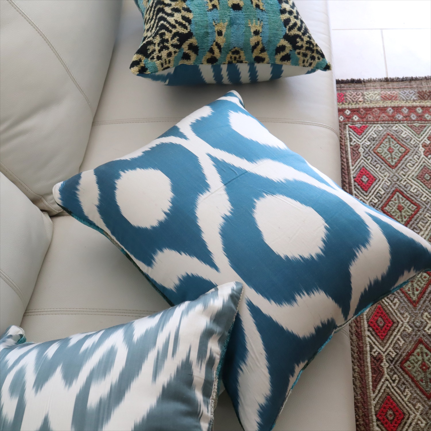 ウズベキスタンで「アトラス」と呼ばれる、中央アジアの女性たちの衣装用に織られた、手機織りの絣布(かすり・イカット)を使ったクッションカバー。