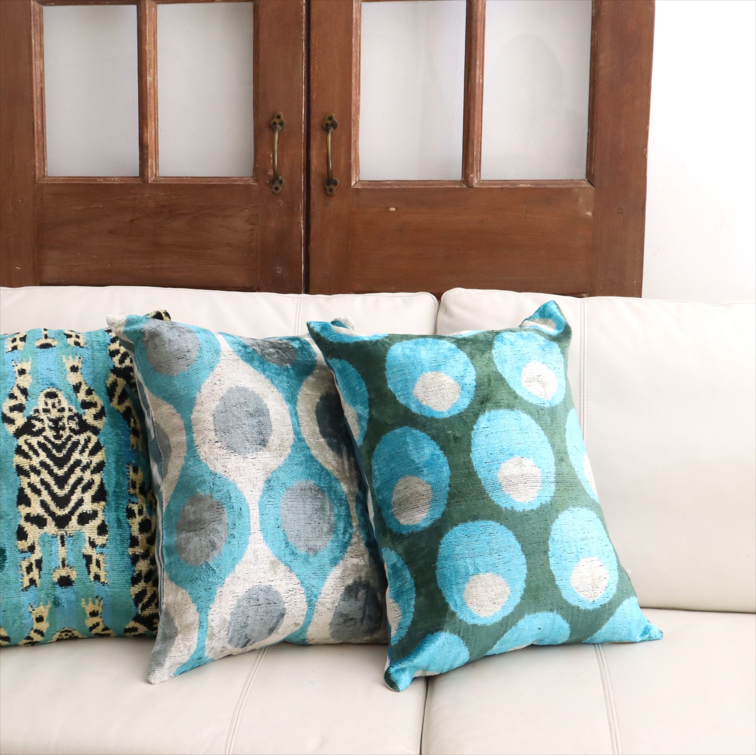 - アトラス ベルベットイカットクッションカバー 両面シルク 水玉 泡 グリーンx水色 Silk Velvet Cushion - Double-Sided Design