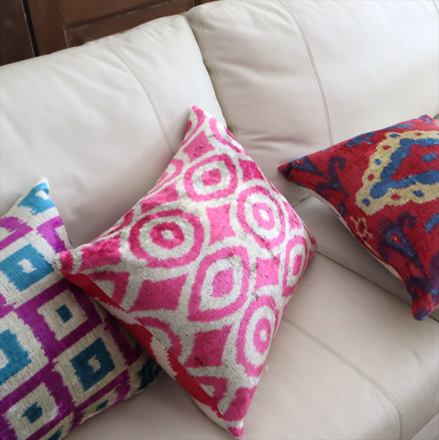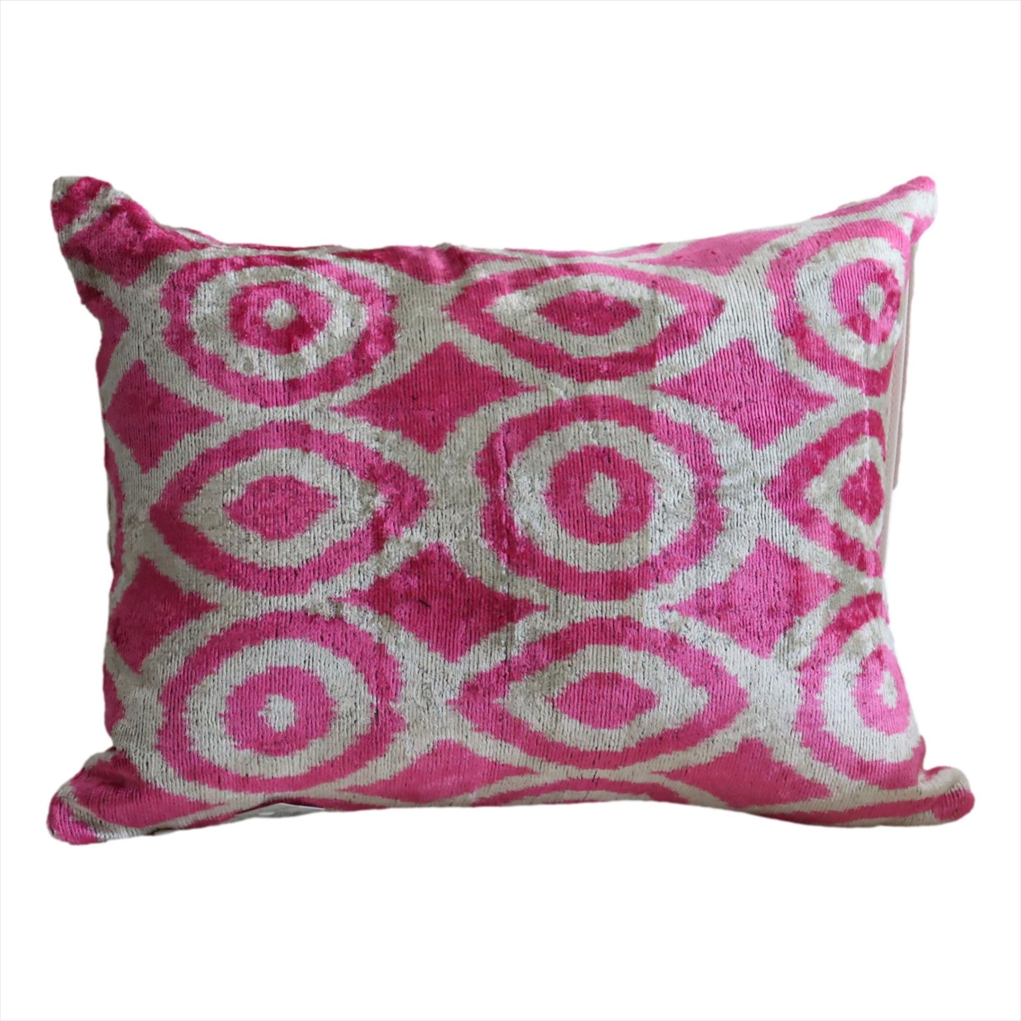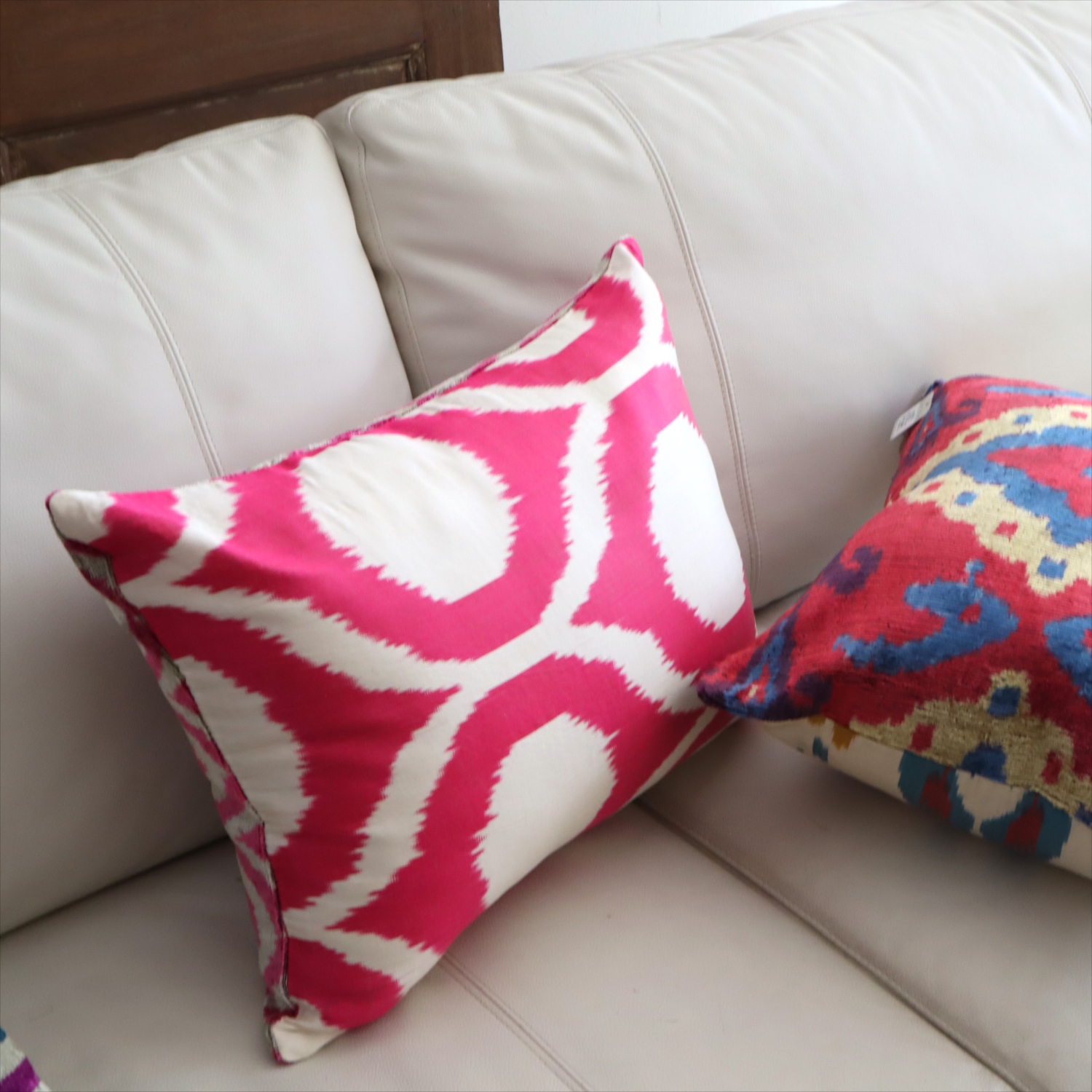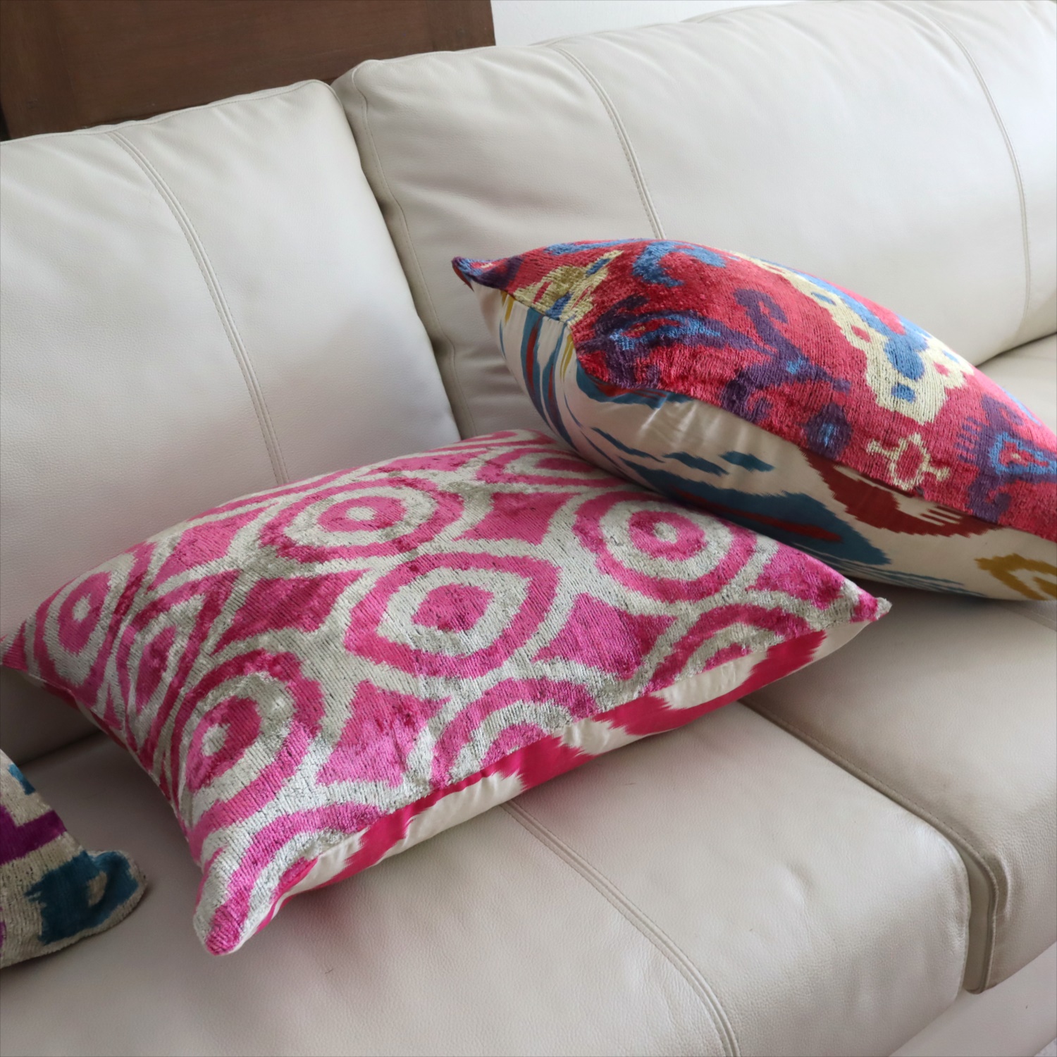- アトラス ベルベットイカットクッションカバー 両面シルク フューシャピンク 水玉サークル Silk Velvet Cushion - Double-Sided Design