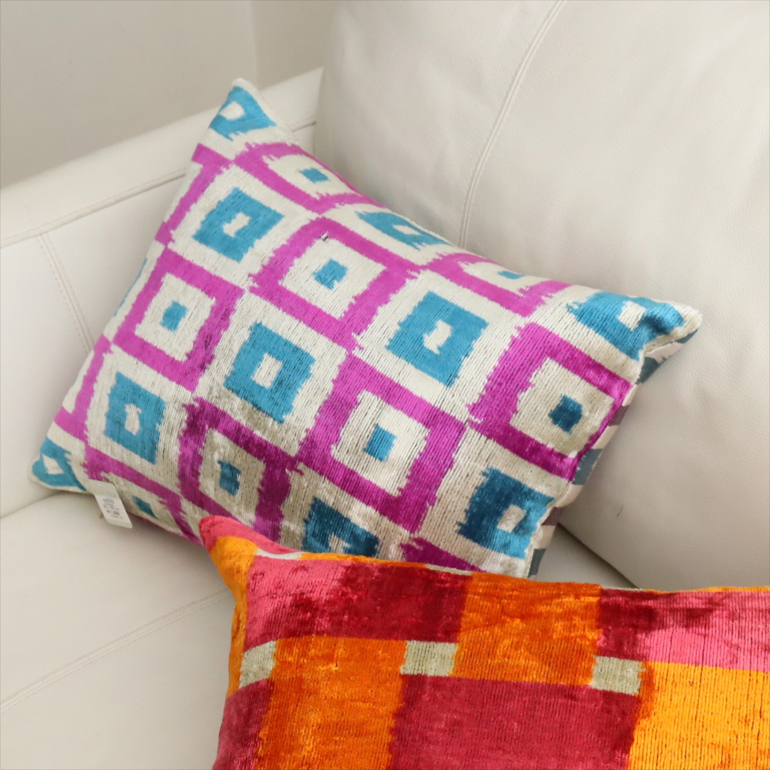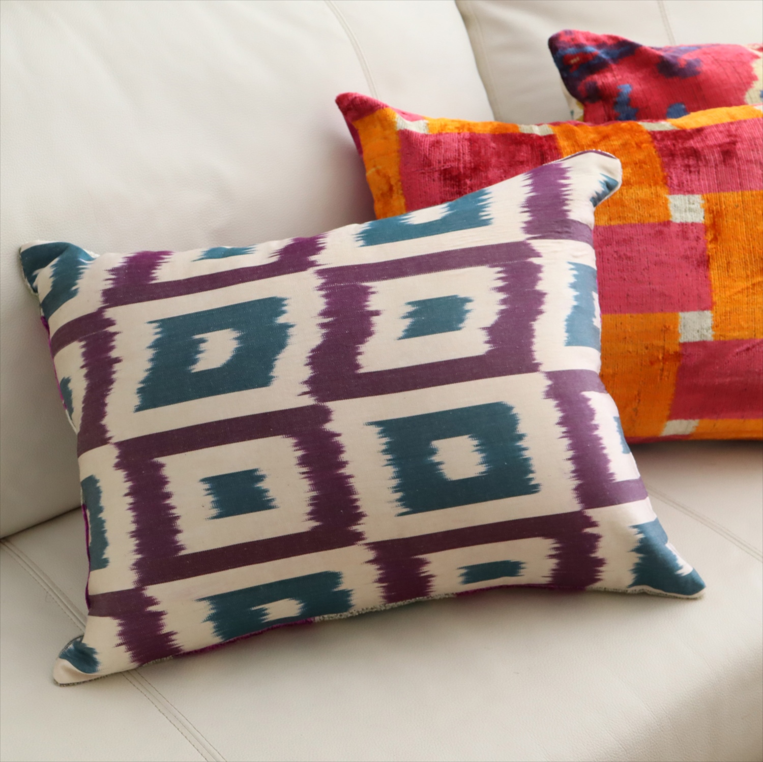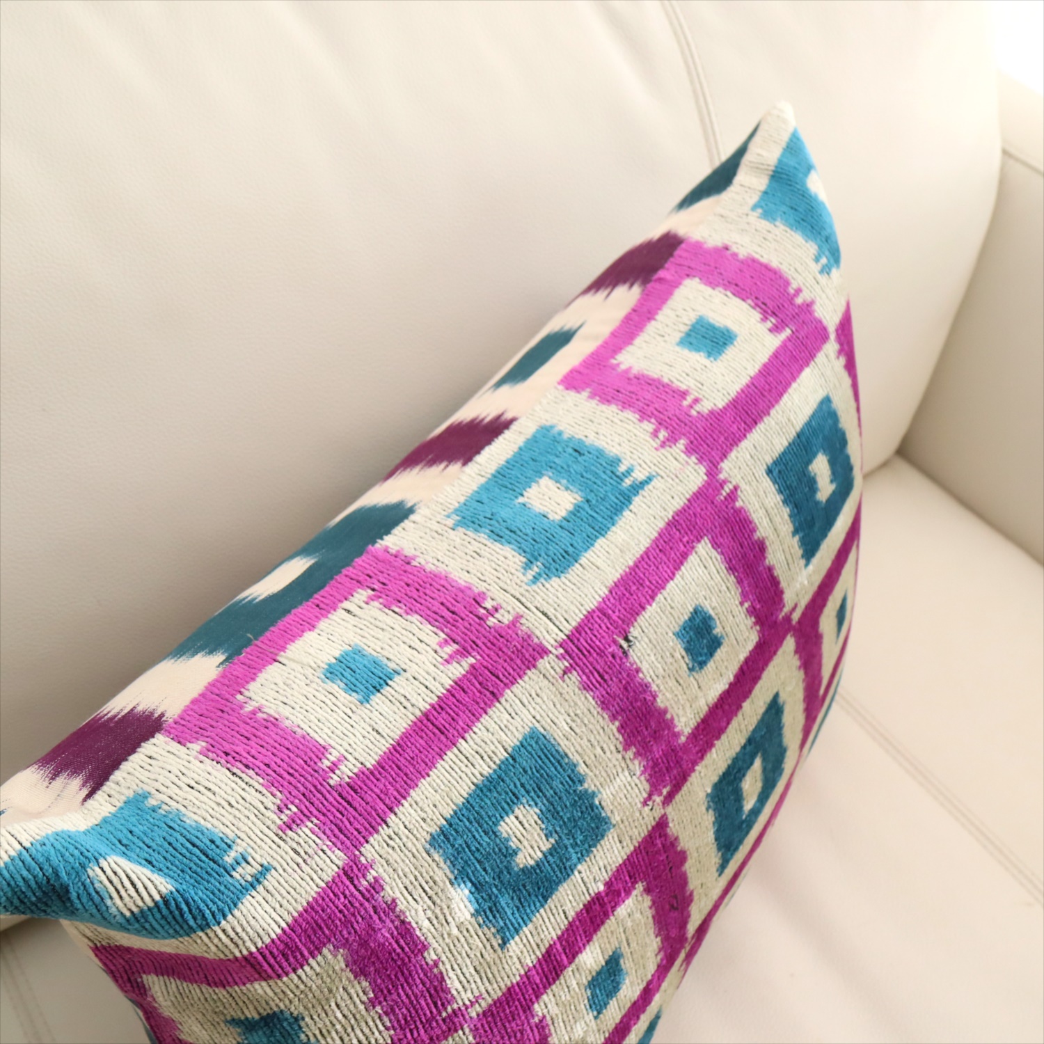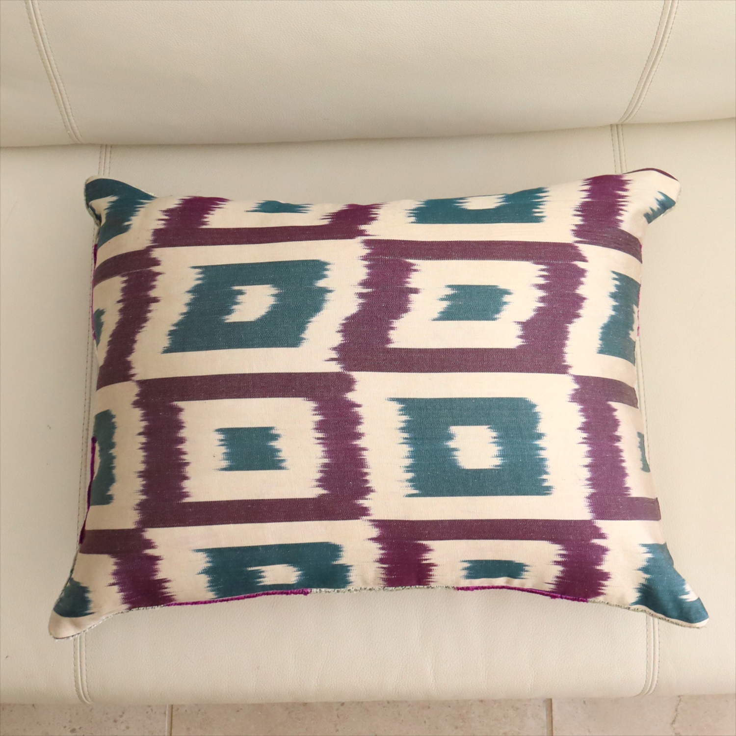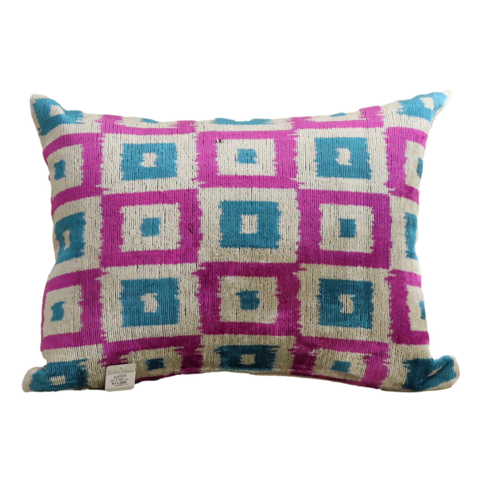 - アトラス ベルベットイカットクッションカバー 両面シルク タイル柄 パープルxターコイズ Silk Velvet Cushion - Double-Sided Design