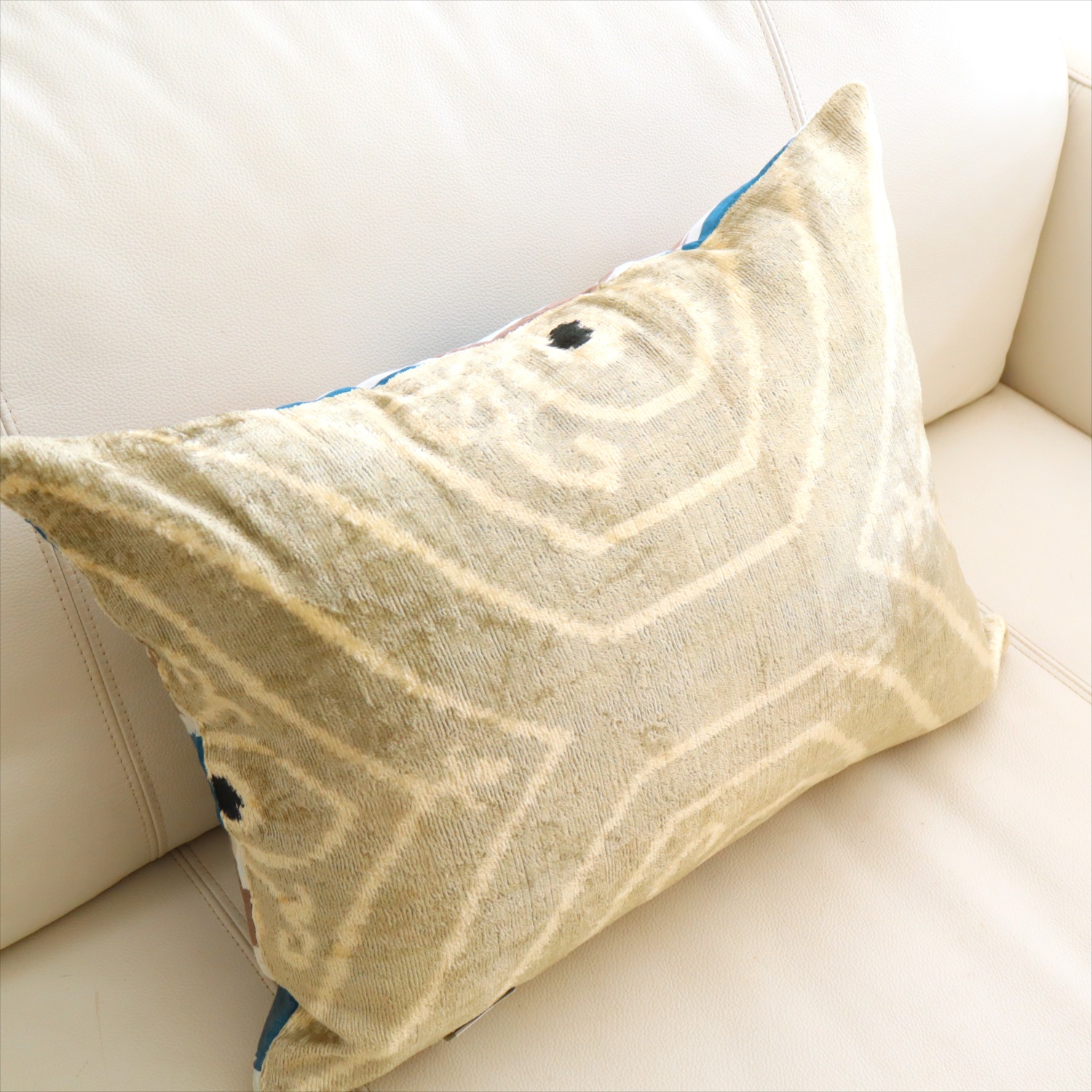 ウズベキスタンで「アトラス」と呼ばれる、中央アジアの女性たちの衣装用に織られた、手機織りの絣布(かすり・イカット)を使ったクッションカバー。