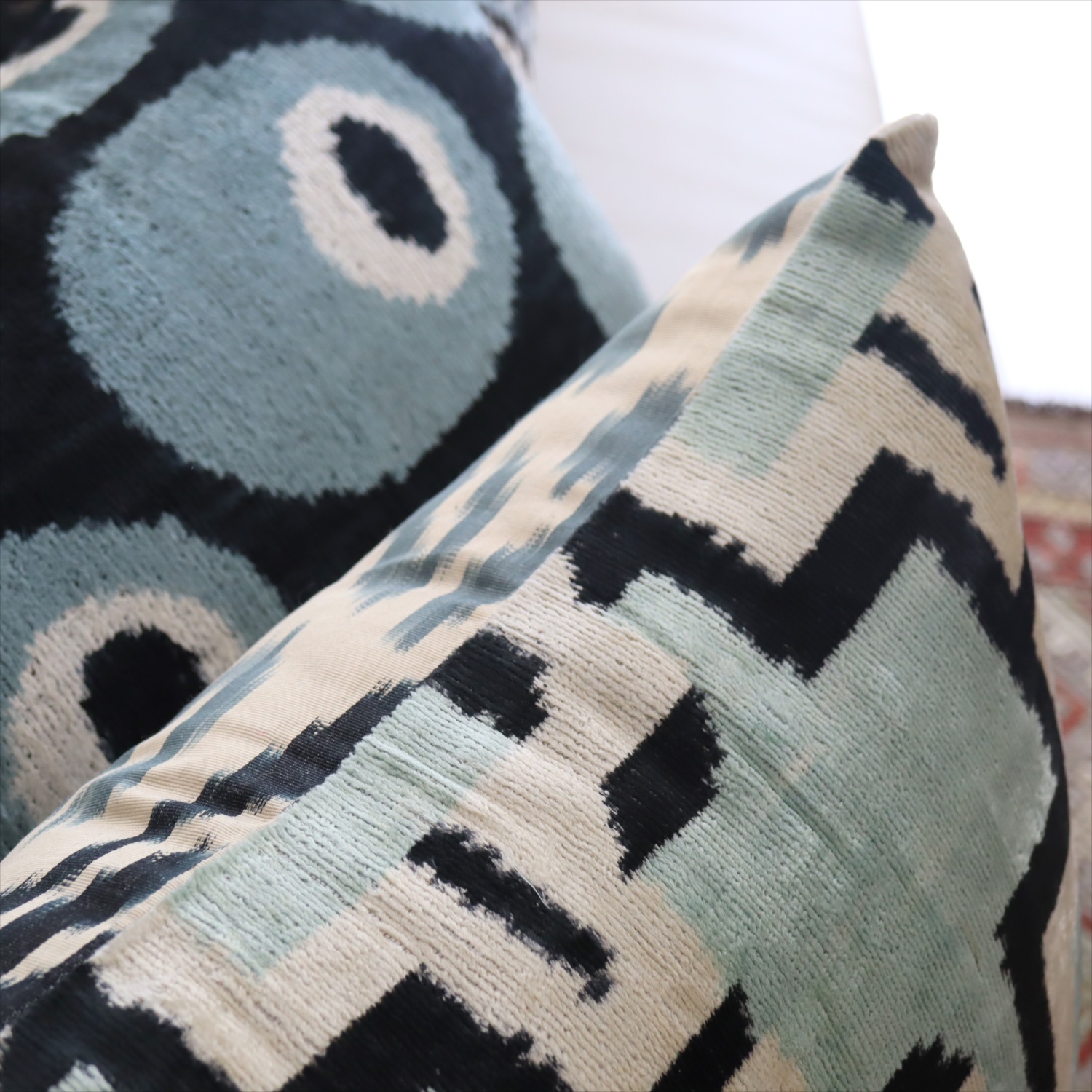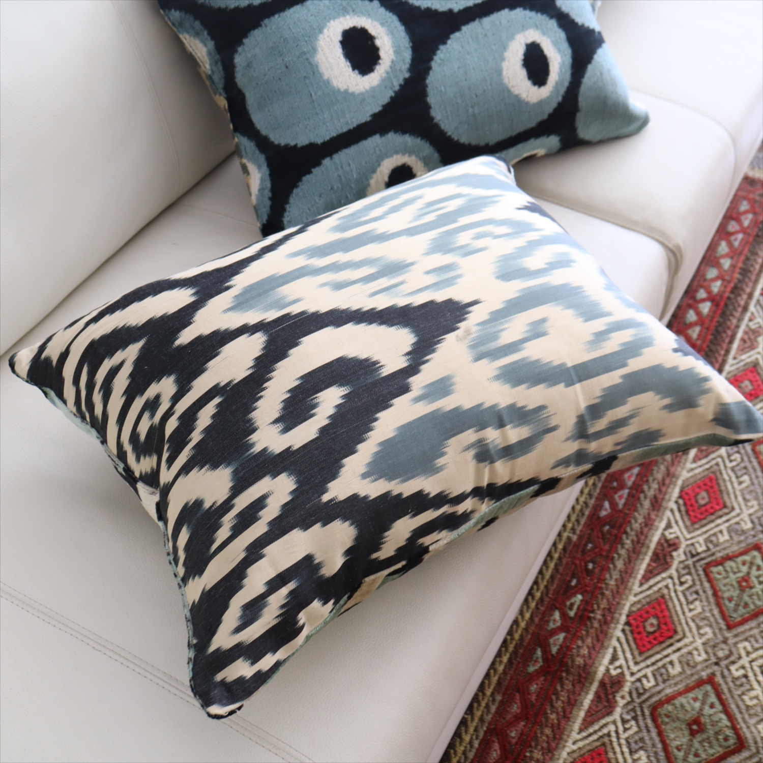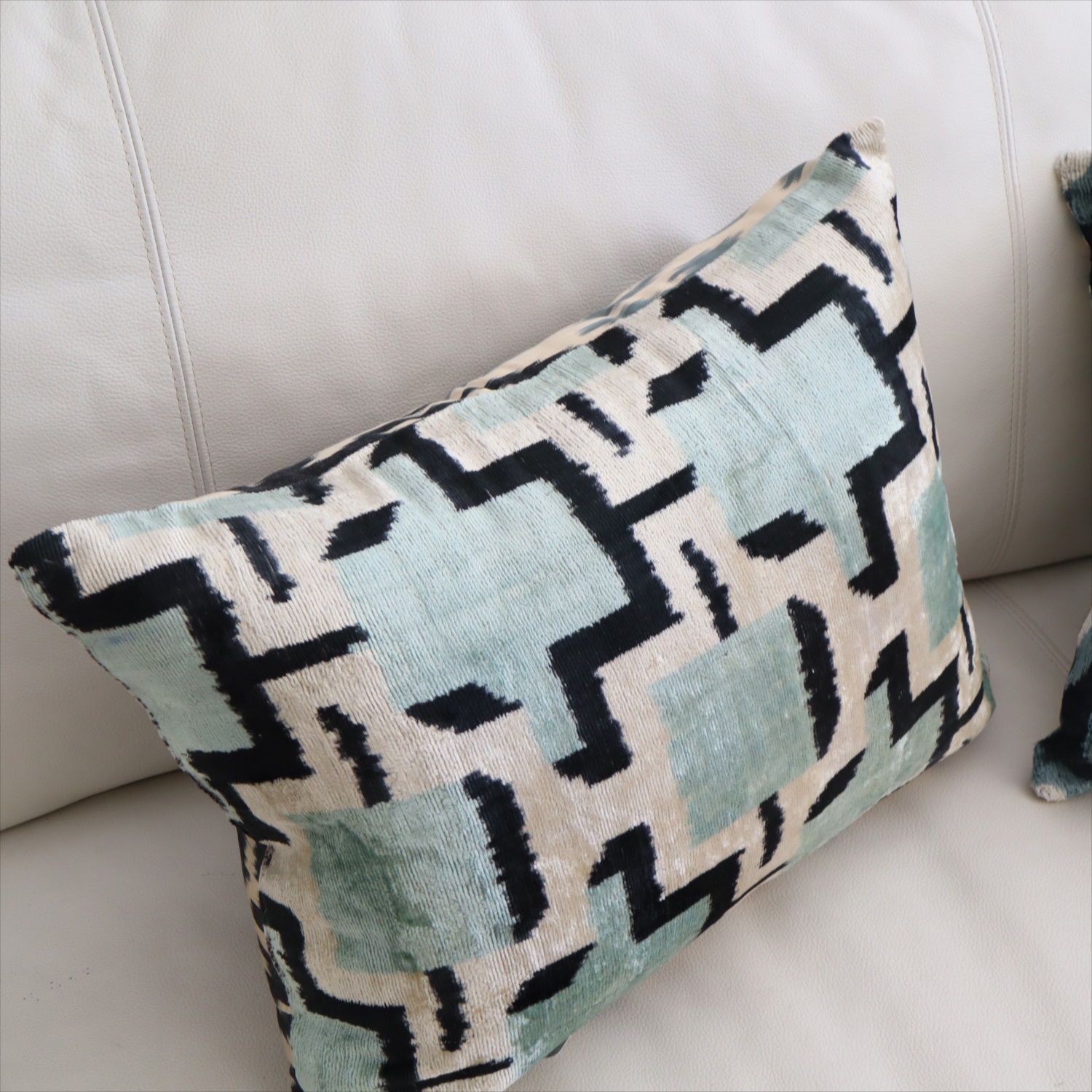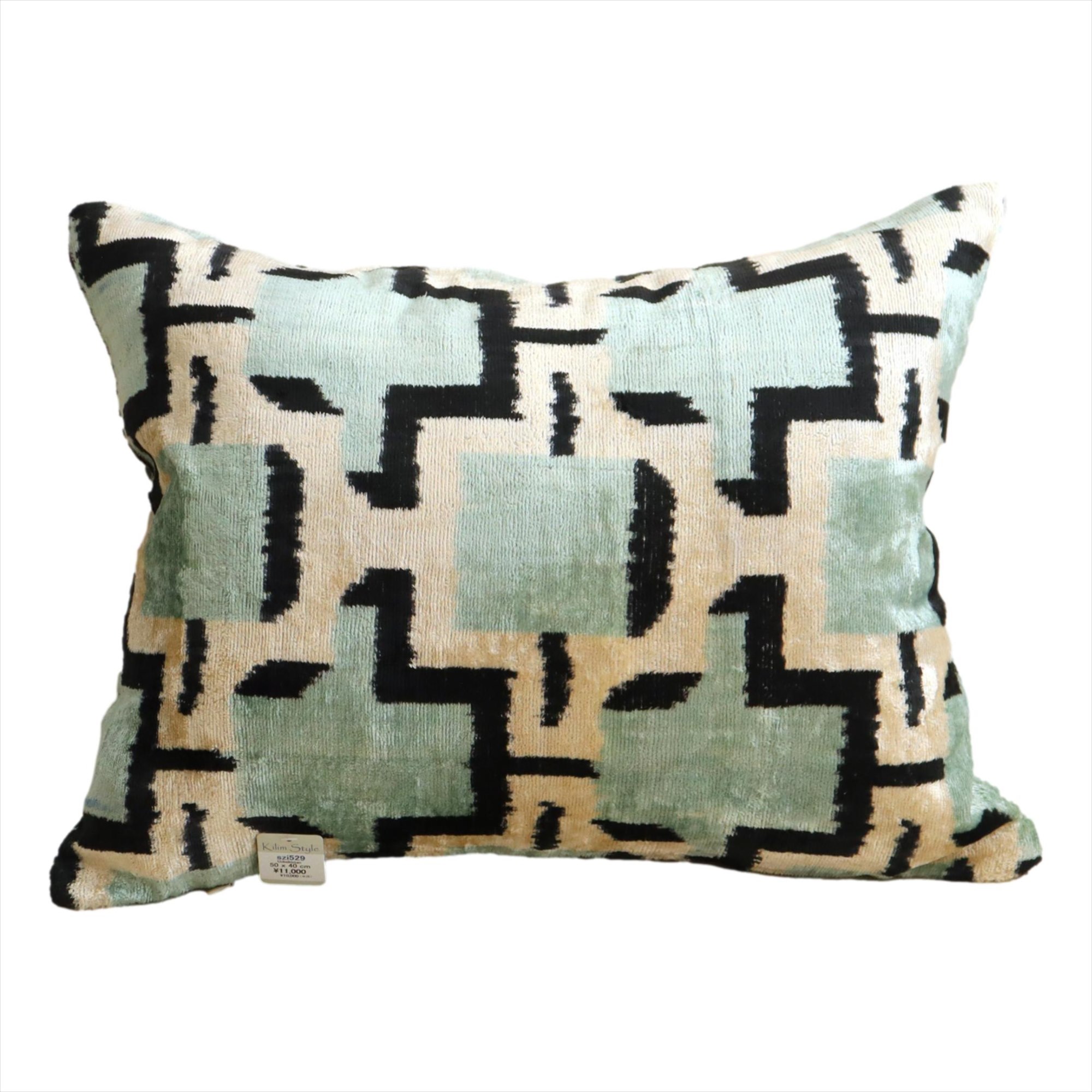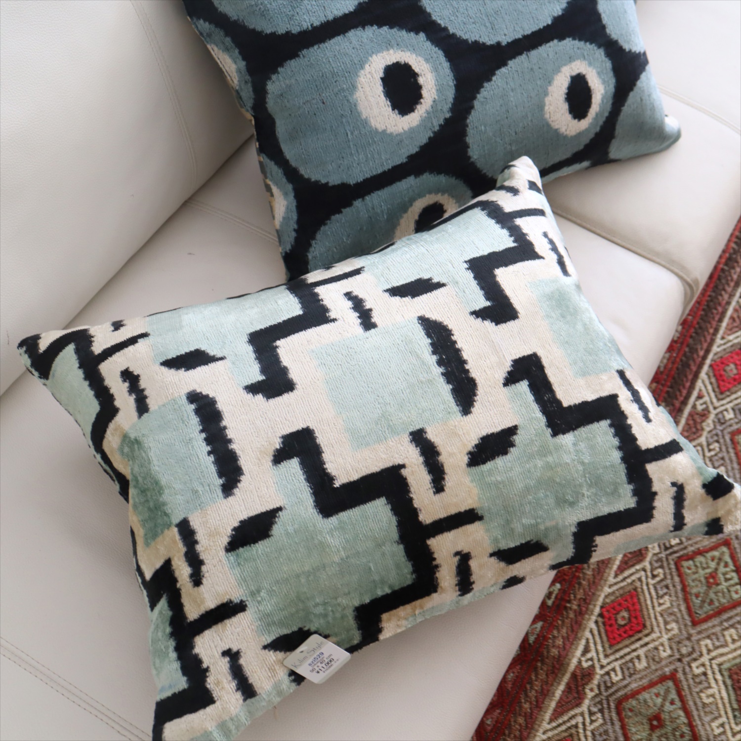 アトラス ベルベットイカットクッションカバー 両面シルク パズルのような幾何学モチーフ ペールブルー Silk Velvet Cushion - Double-Sided Design