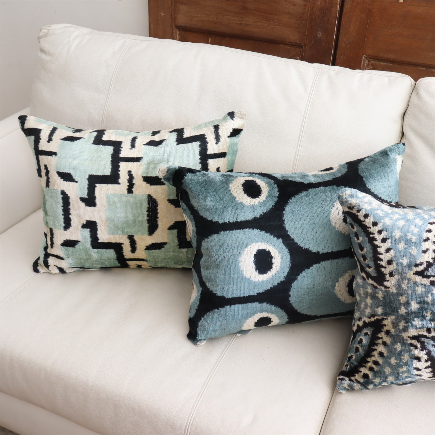 - アトラス ベルベットイカットクッションカバー 両面シルク パズルのような幾何学モチーフ ペールブルー Silk Velvet Cushion - Double-Sided Design