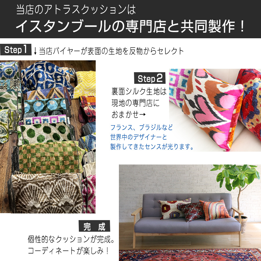 ウズベキスタンで「アトラス」と呼ばれる、中央アジアの女性たちの衣装用に織られた、手機織りの絣布(かすり・イカット)を使ったクッションカバー。
