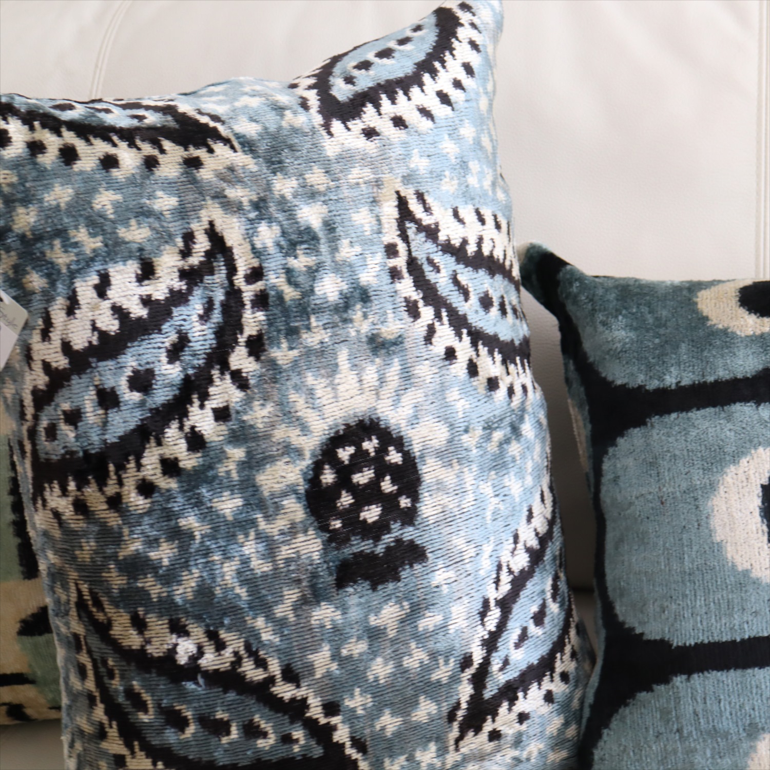 アトラス ベルベットイカットクッションカバー 両面シルク ペイズリー グレー Silk Velvet Cushion - Double-Sided Design