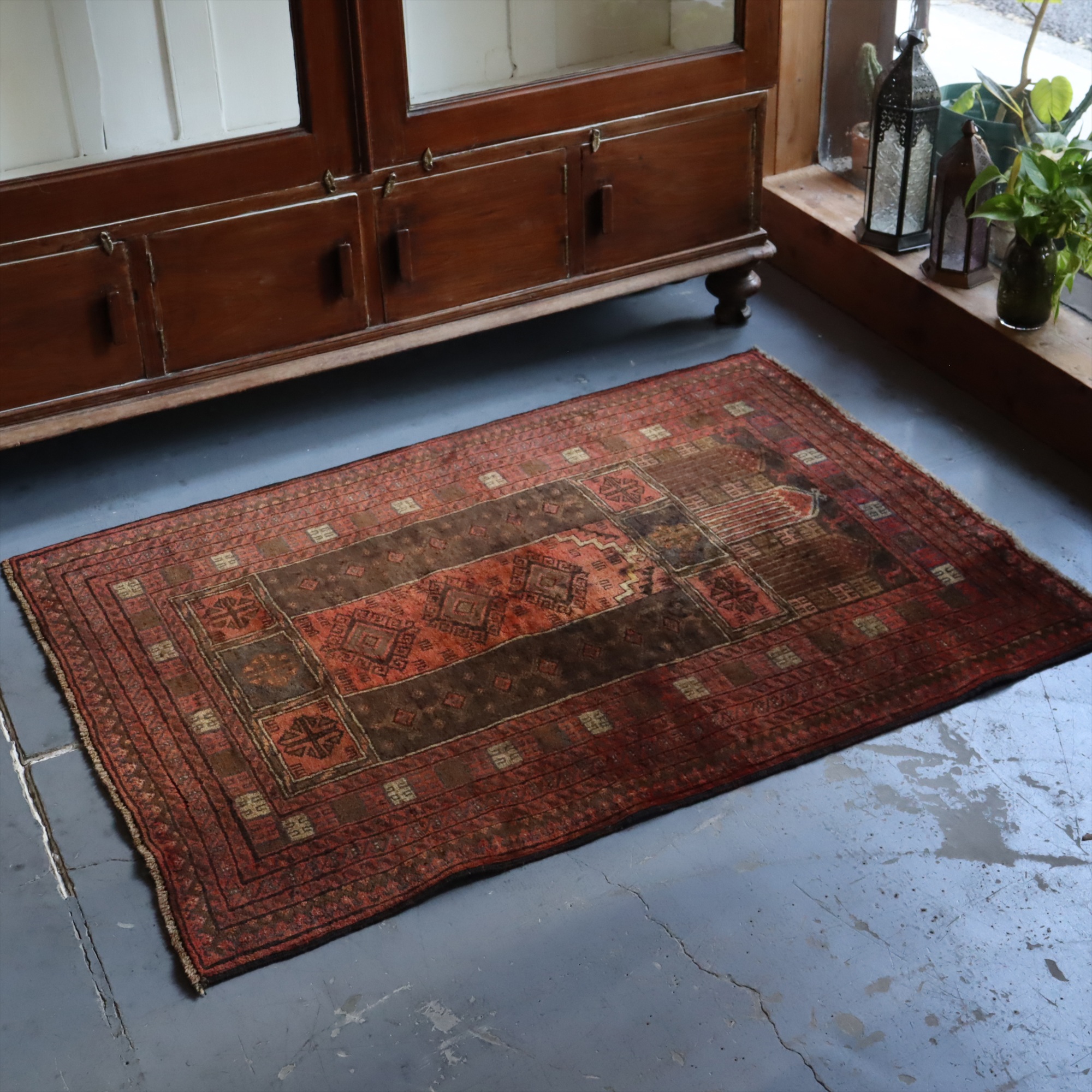 朱色に近いレッドとブラウンを基調とした色使いで、お祈りのくぼみを示すミフラープと幾何学模様が織られています。くすんだ色合いになっていて、こなれた感が良く出ています。