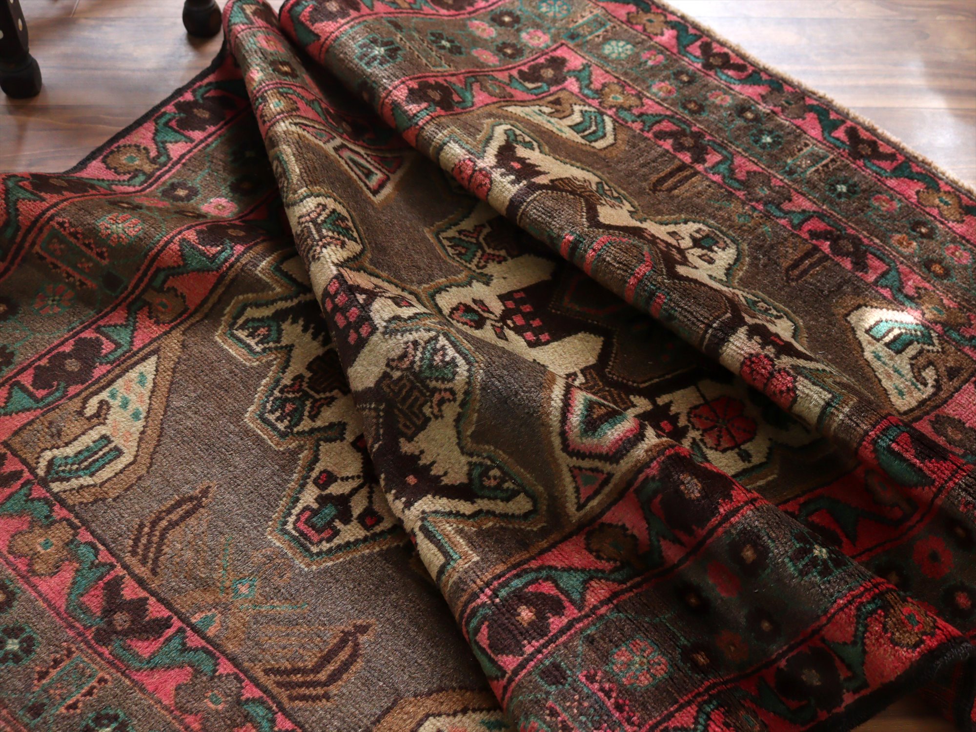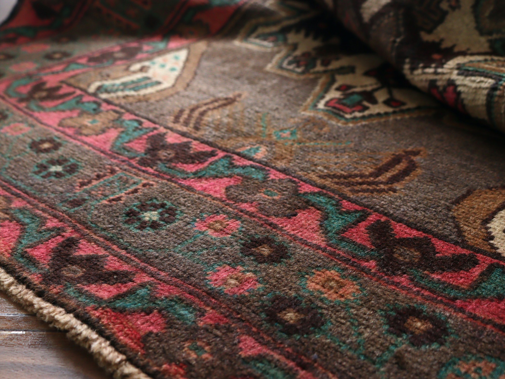 落ち着いたブラウンのフィールドに、花形のメダリオンが並んだデザイン。メダリオンそのものだけでなく、所々に小花のデザインが施されています。