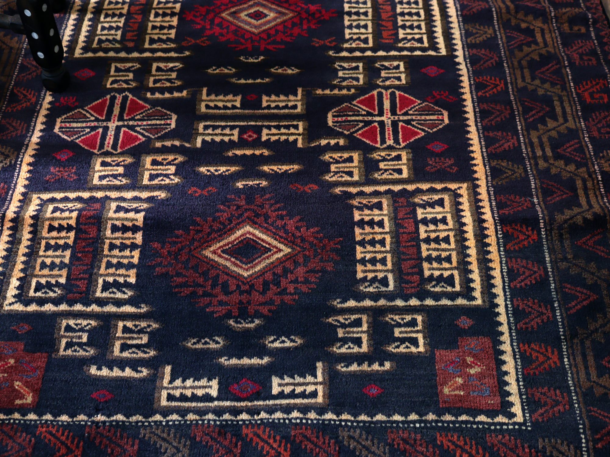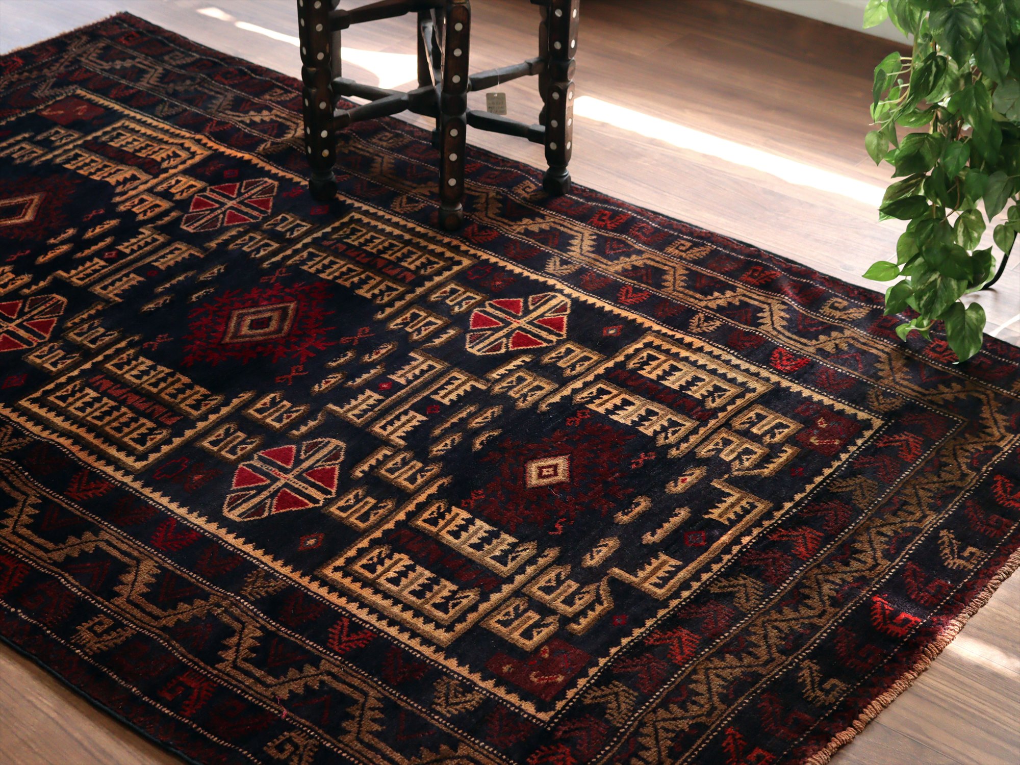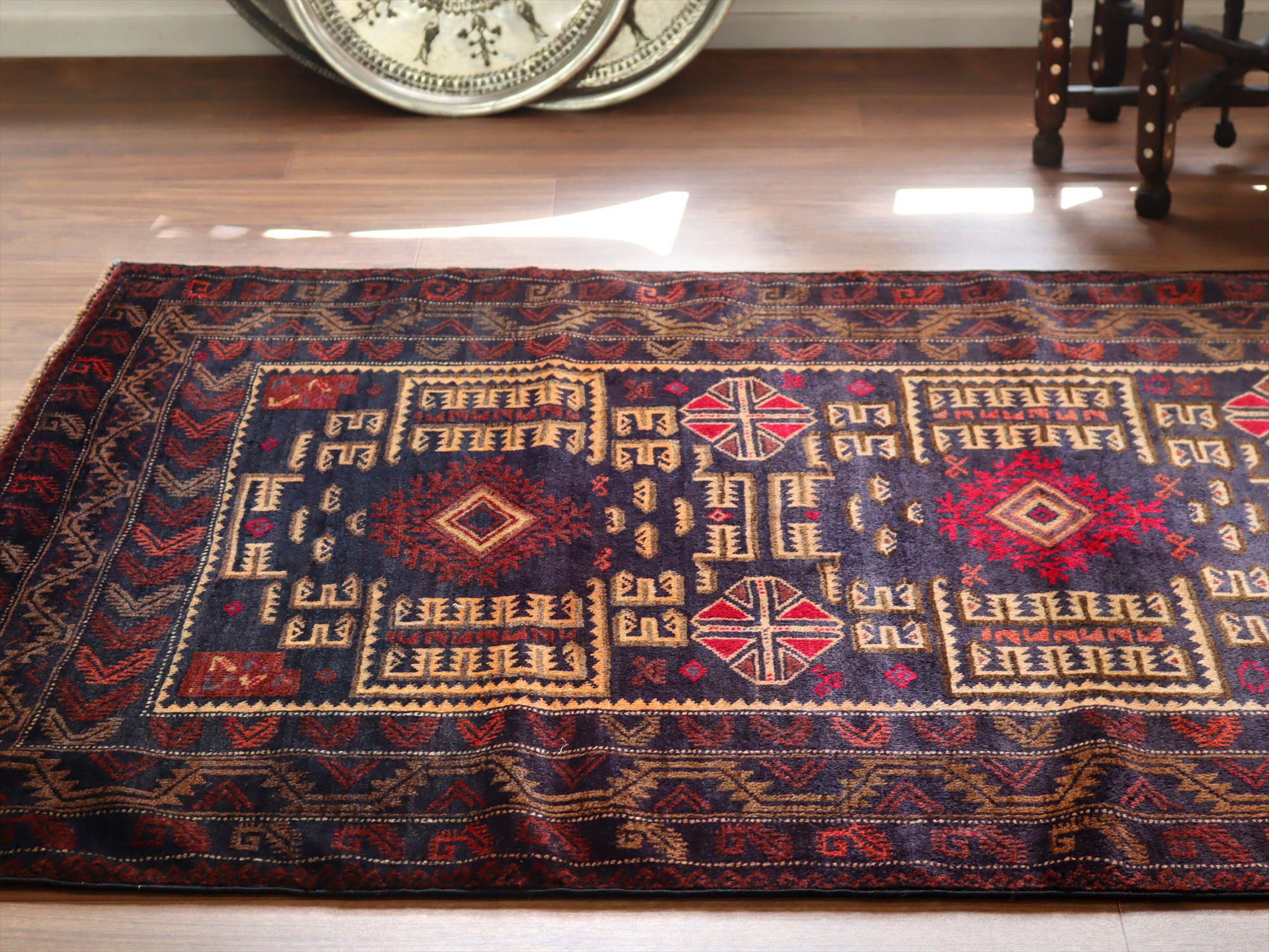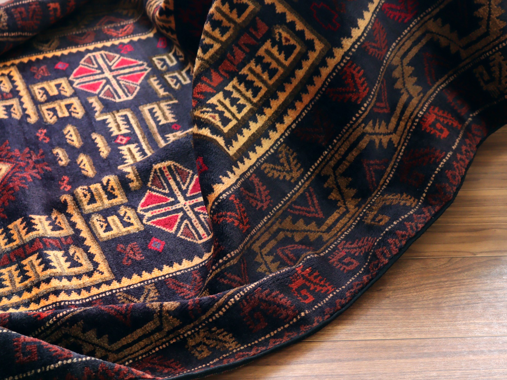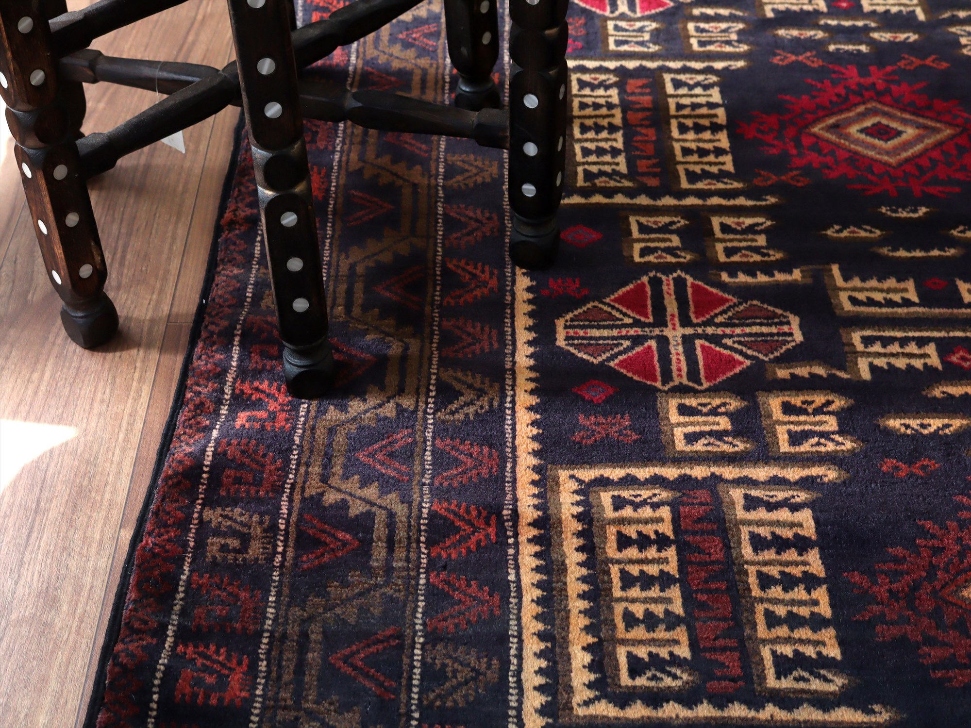 - トライバルラグ バルーチ206×121cm 幾何学模様とメダリオン ネイビー