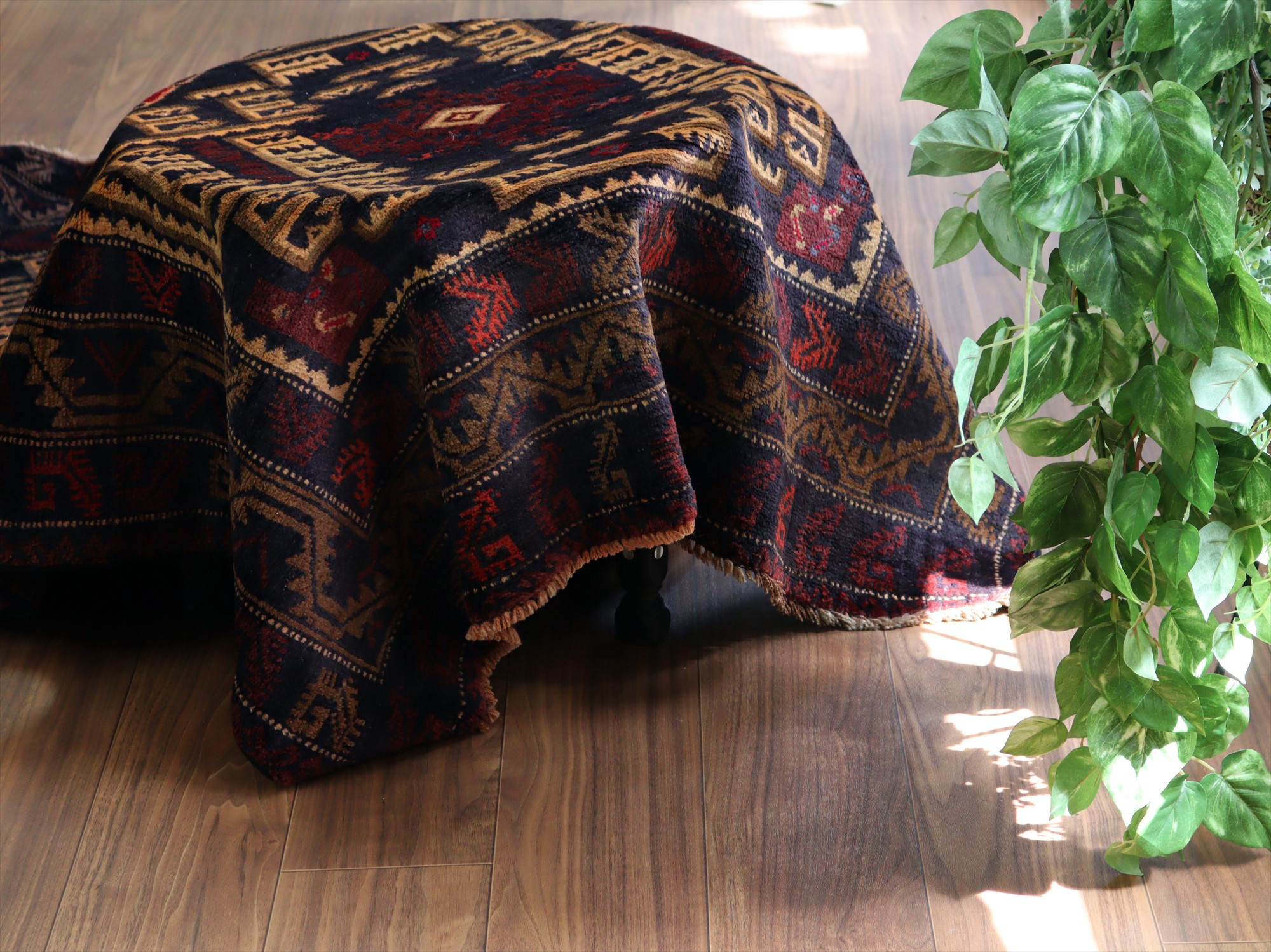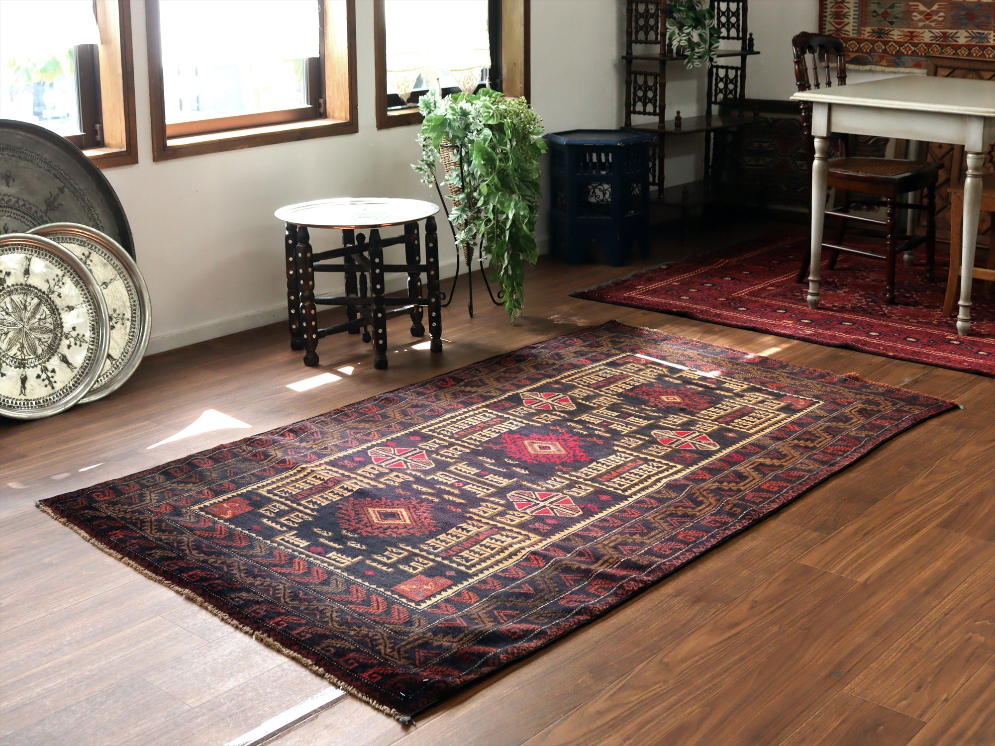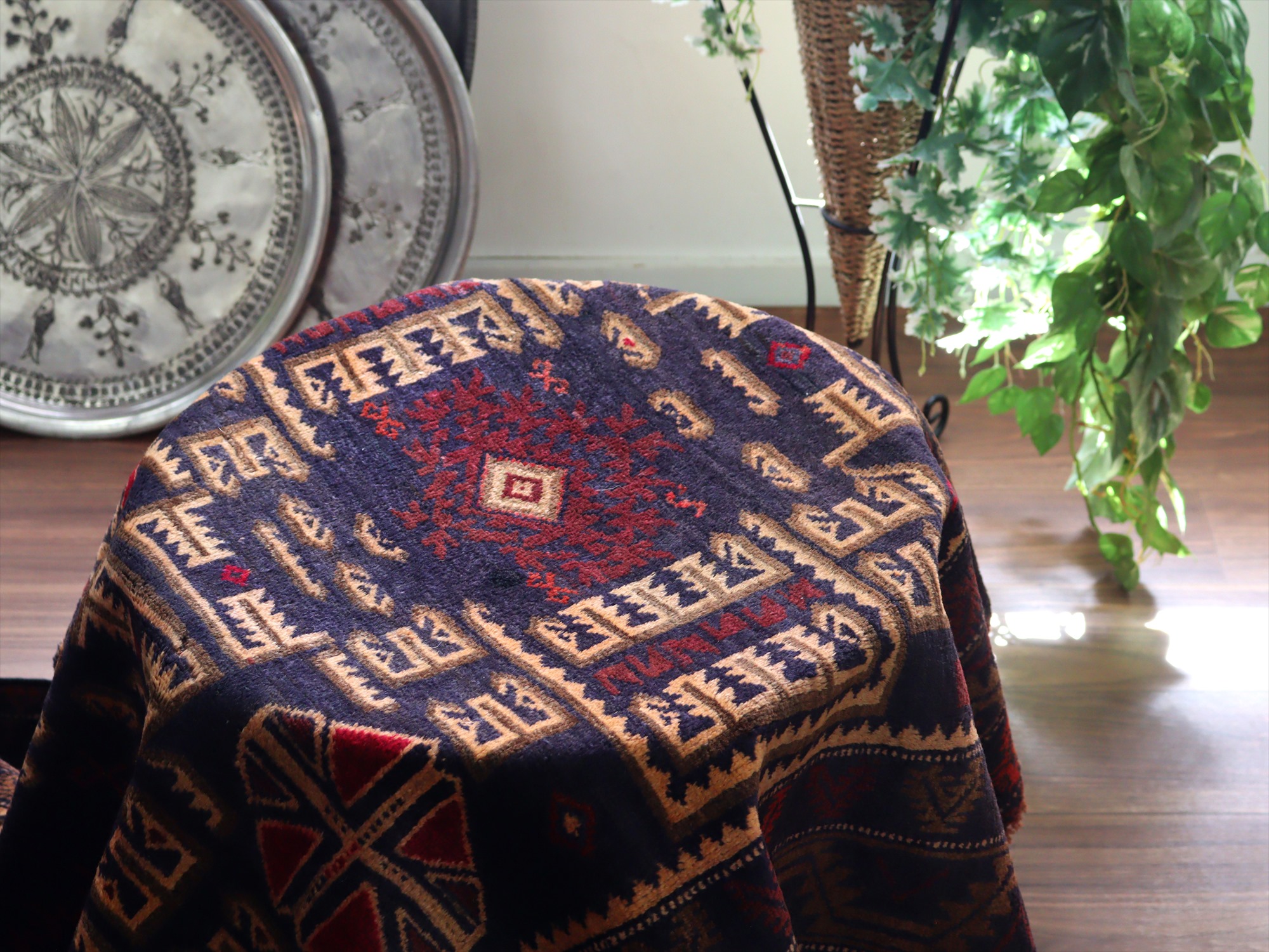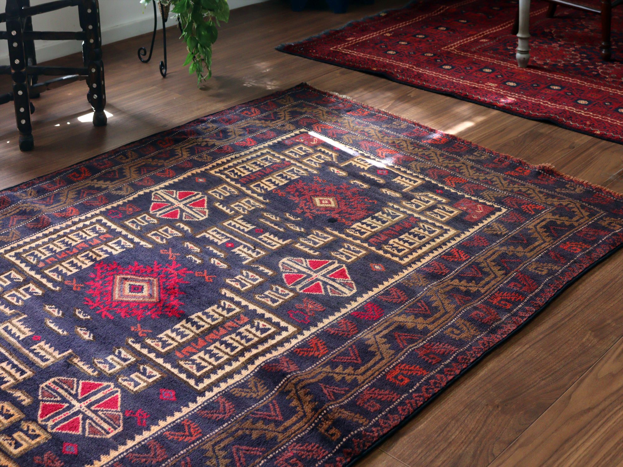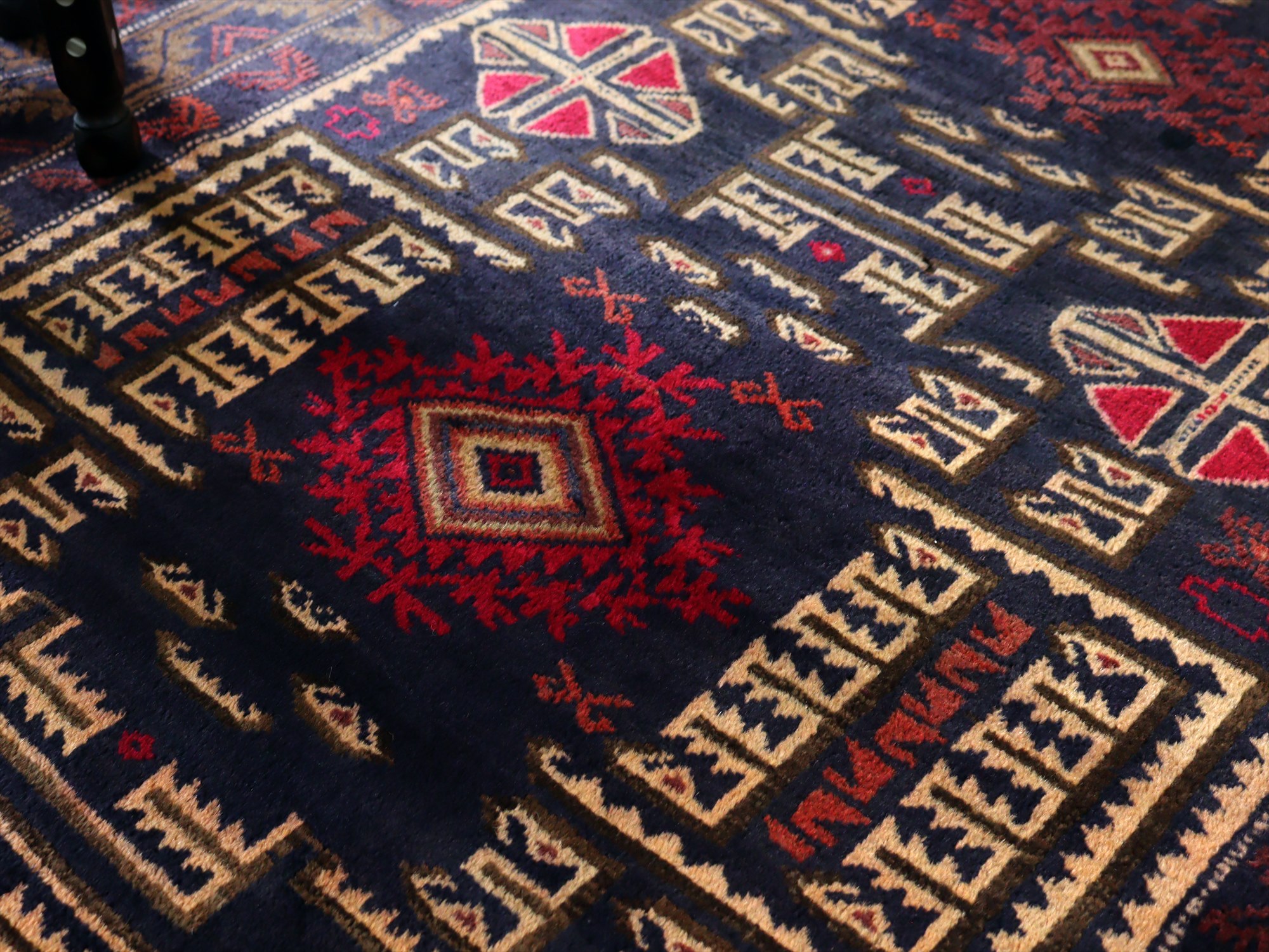 - トライバルラグ バルーチ206×121cm 幾何学模様とメダリオン ネイビー