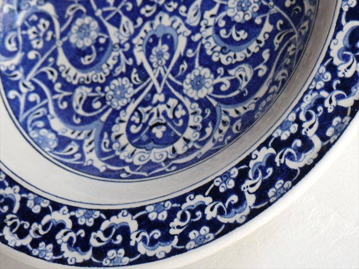 オスマントルコ宮廷へ献上するために、イズニックで陶器製作が始まった16世紀初頭に作られた絵皿を再現しています。青の濃淡を使って、緻密な筆遣いで描かれたデザインは、明代中国の影響を強くうけつつも、無限の広がりを表現するイスラミックモチーフに変化しています。