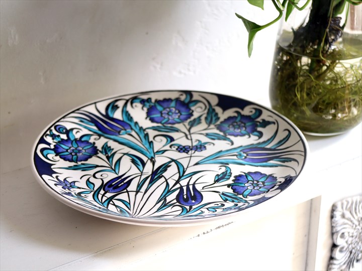 - 手書き絵皿 直径25.5cm トルコ 飾り絵皿 ミュージアムピース オットマンクラシックチューリップとカーネーション ブルーグリーン Turkish Hand Paint Plate