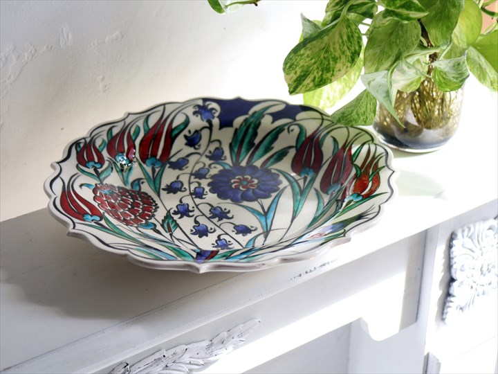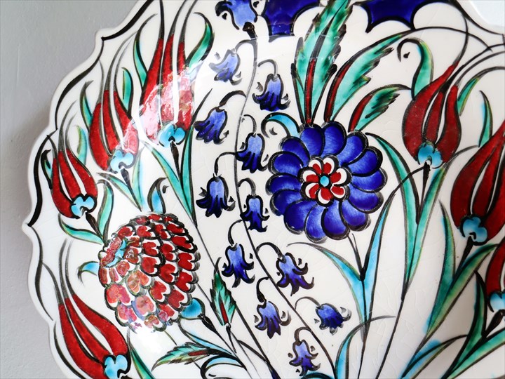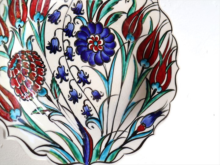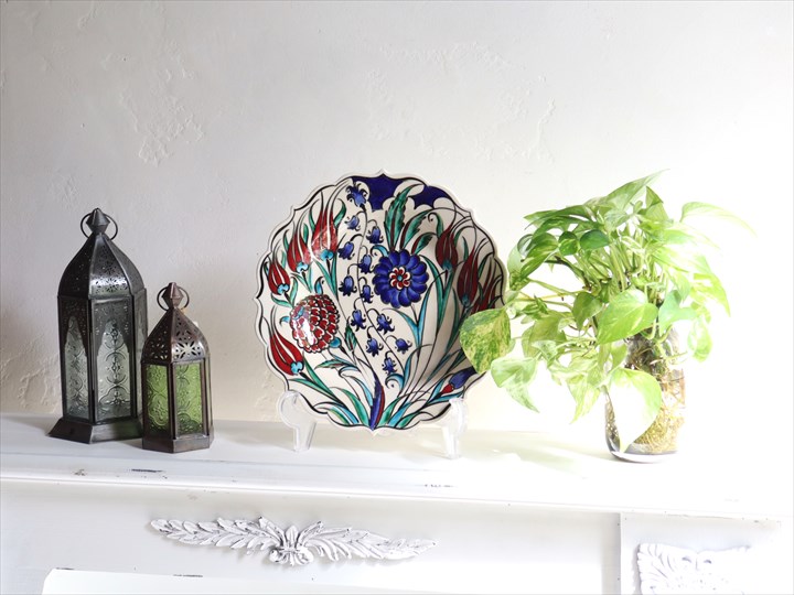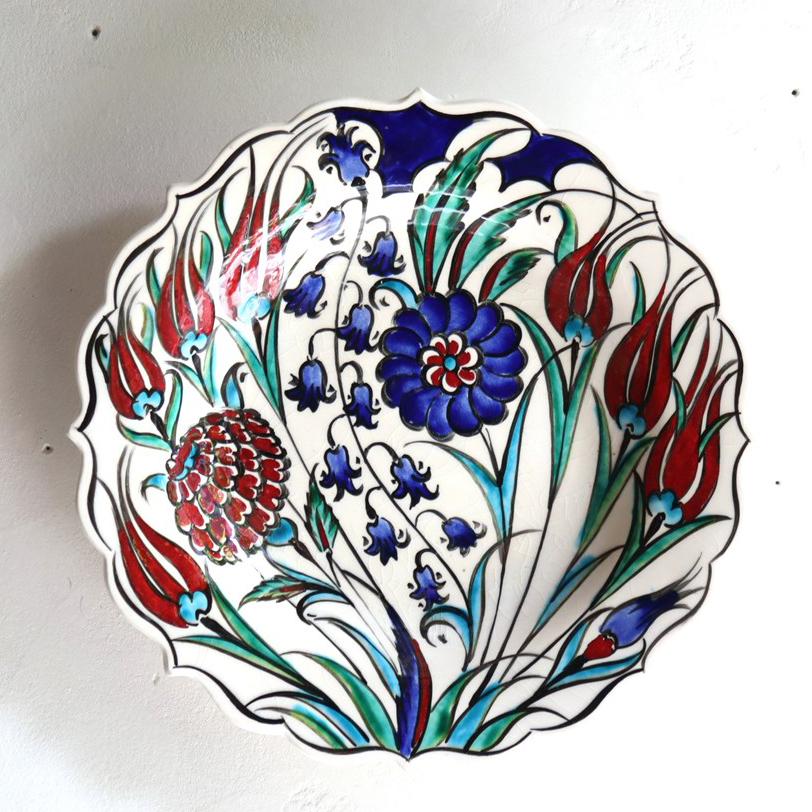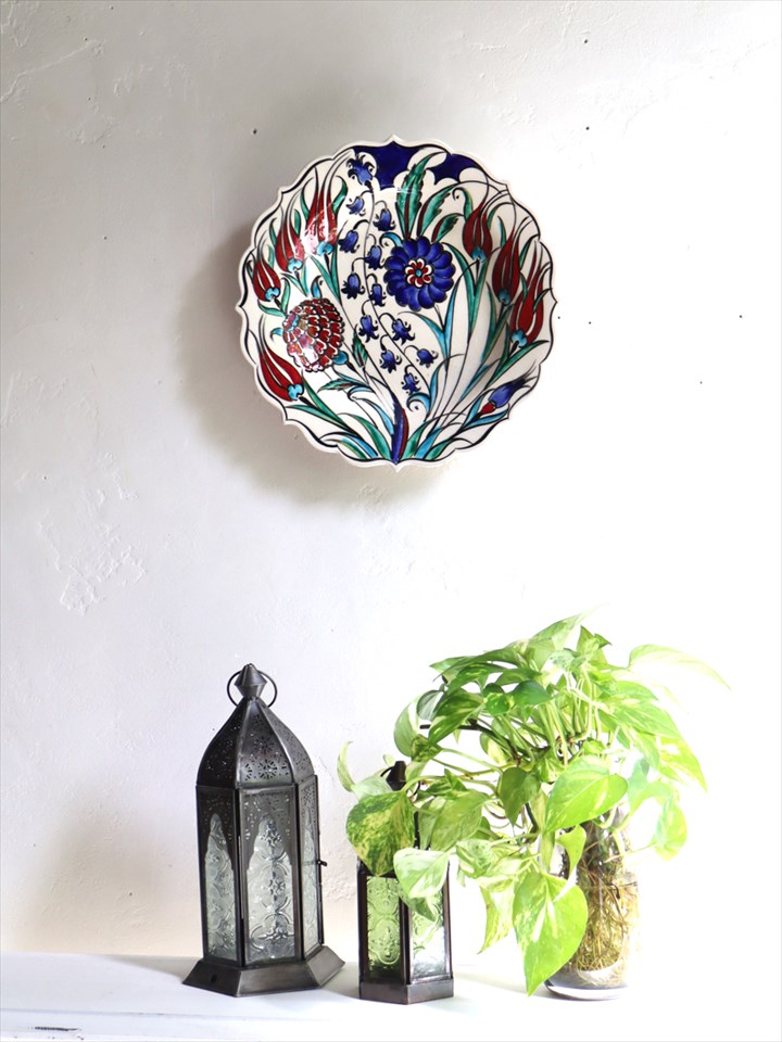 トルコの陶器産業の中心地「キュタフヤ」の工房で手書き絵付けされている飾り皿です。16世紀末に完成されたとされる、オスマントルコ独特の表現で描かれたチューリップ、カーネーションやすずらん。