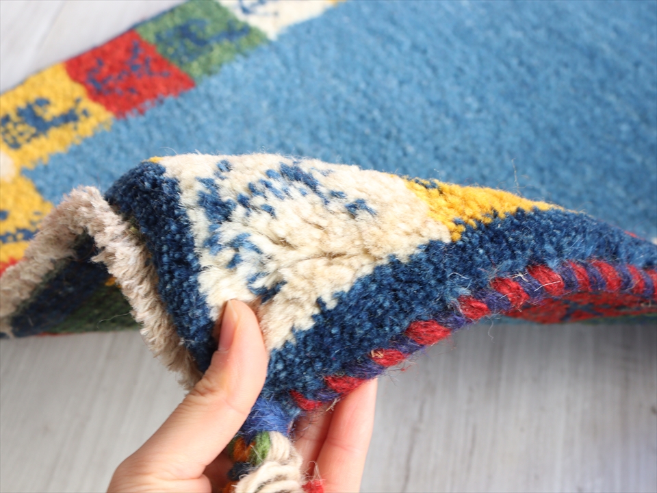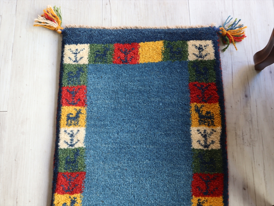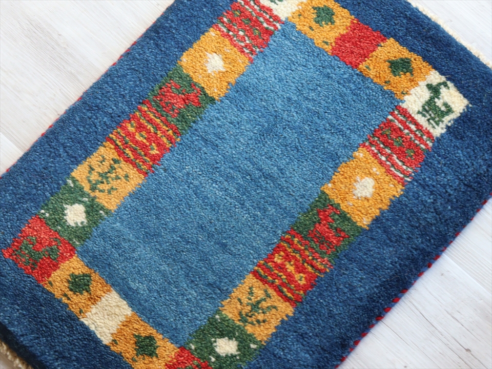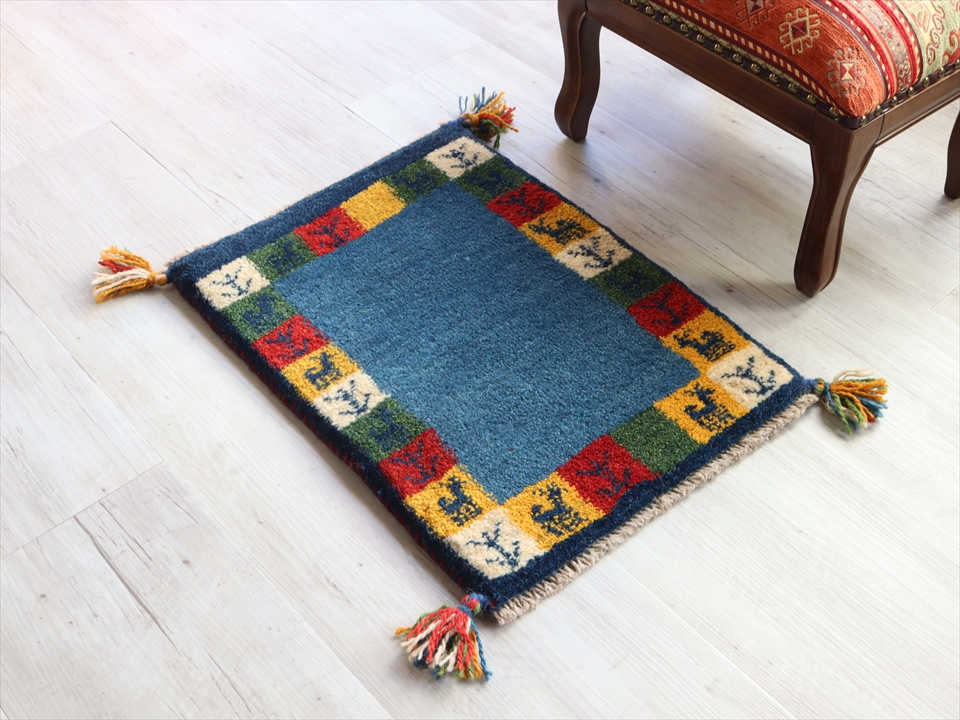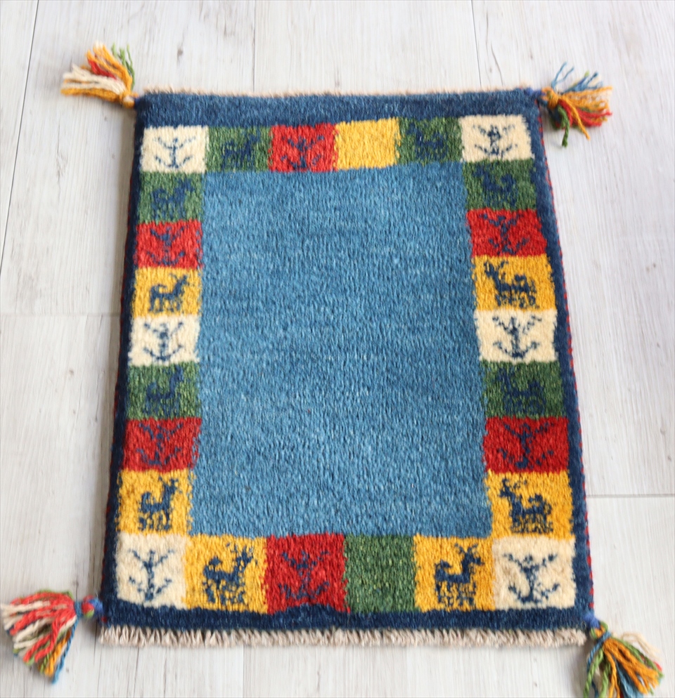 ギャッベ イラン遊牧民族手織り ラグ 玄関 ミニサイズ 54x39cm ブルー カラフルタイル 動物と植物モチーフ