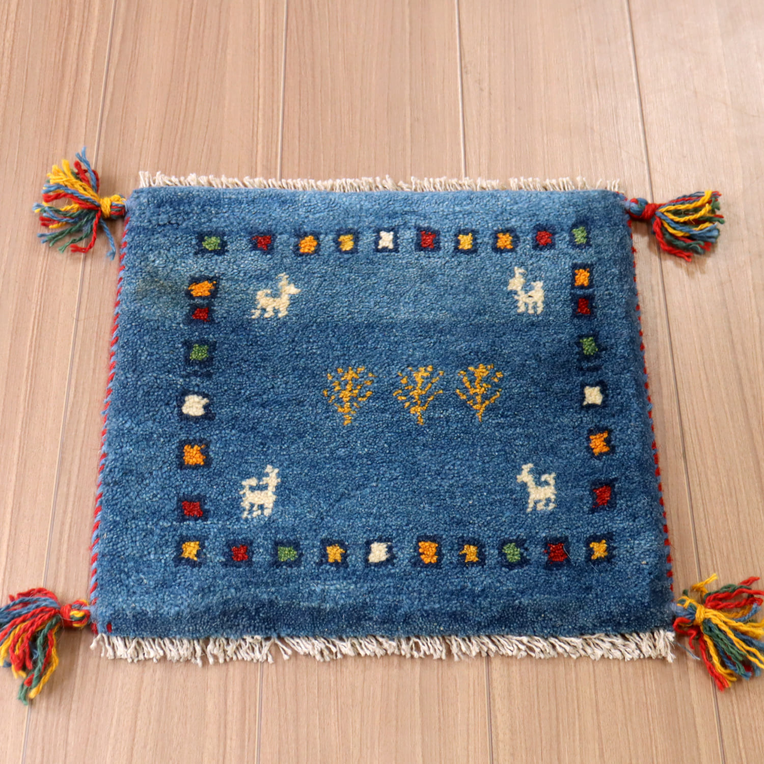 - ギャッベ 座布団サイズ 39x40cm ブルー イラン産手織りギャッベ