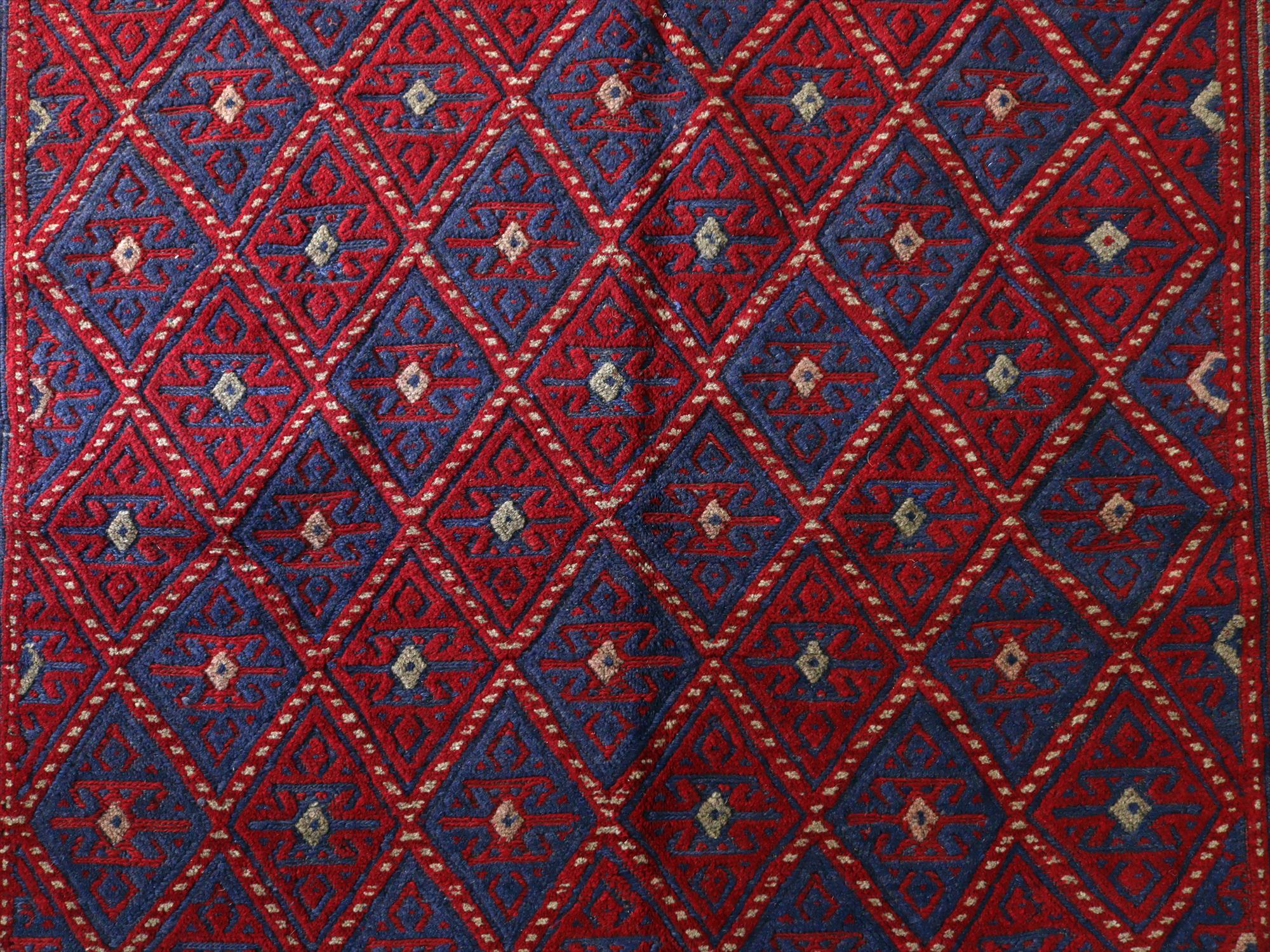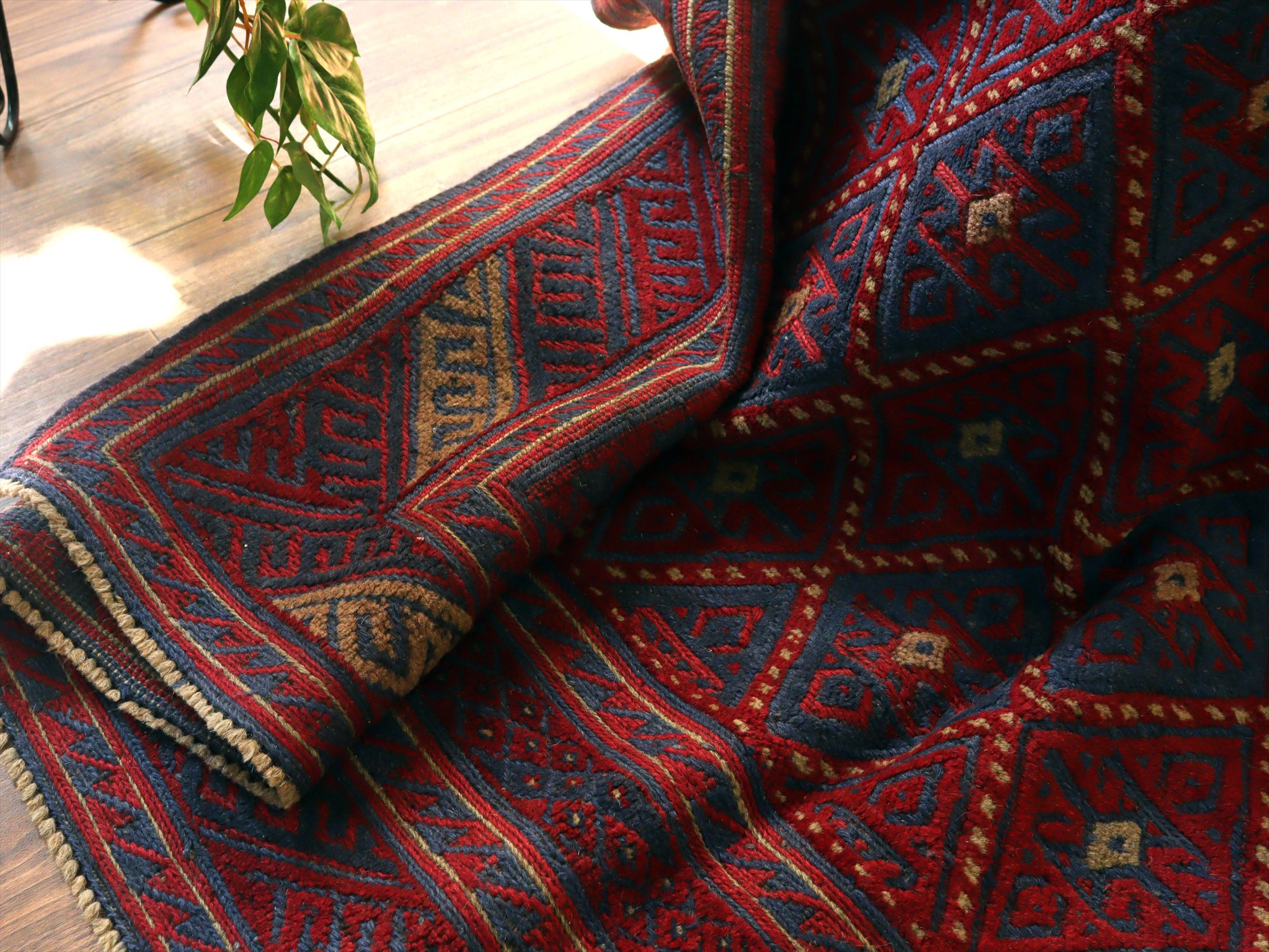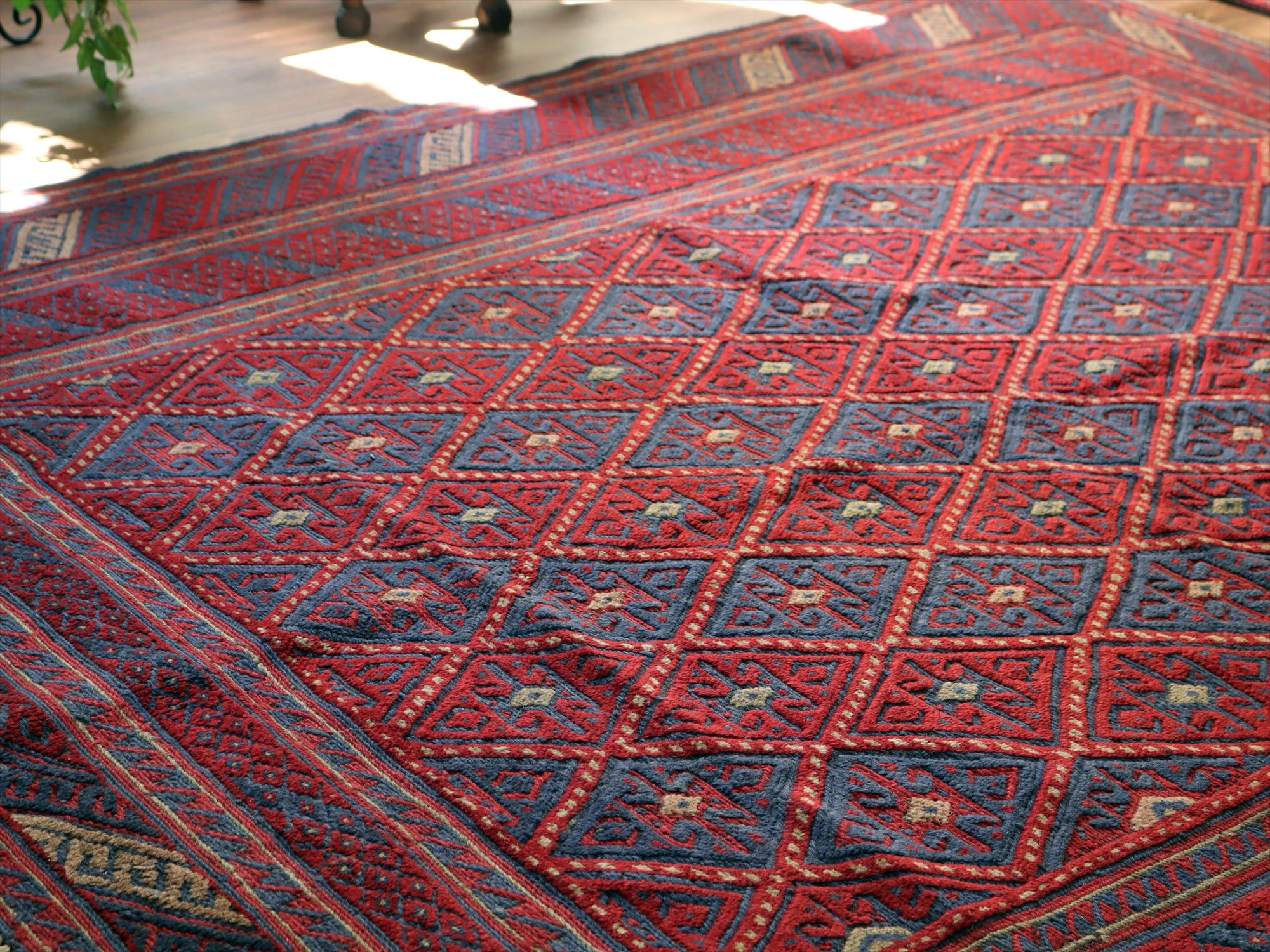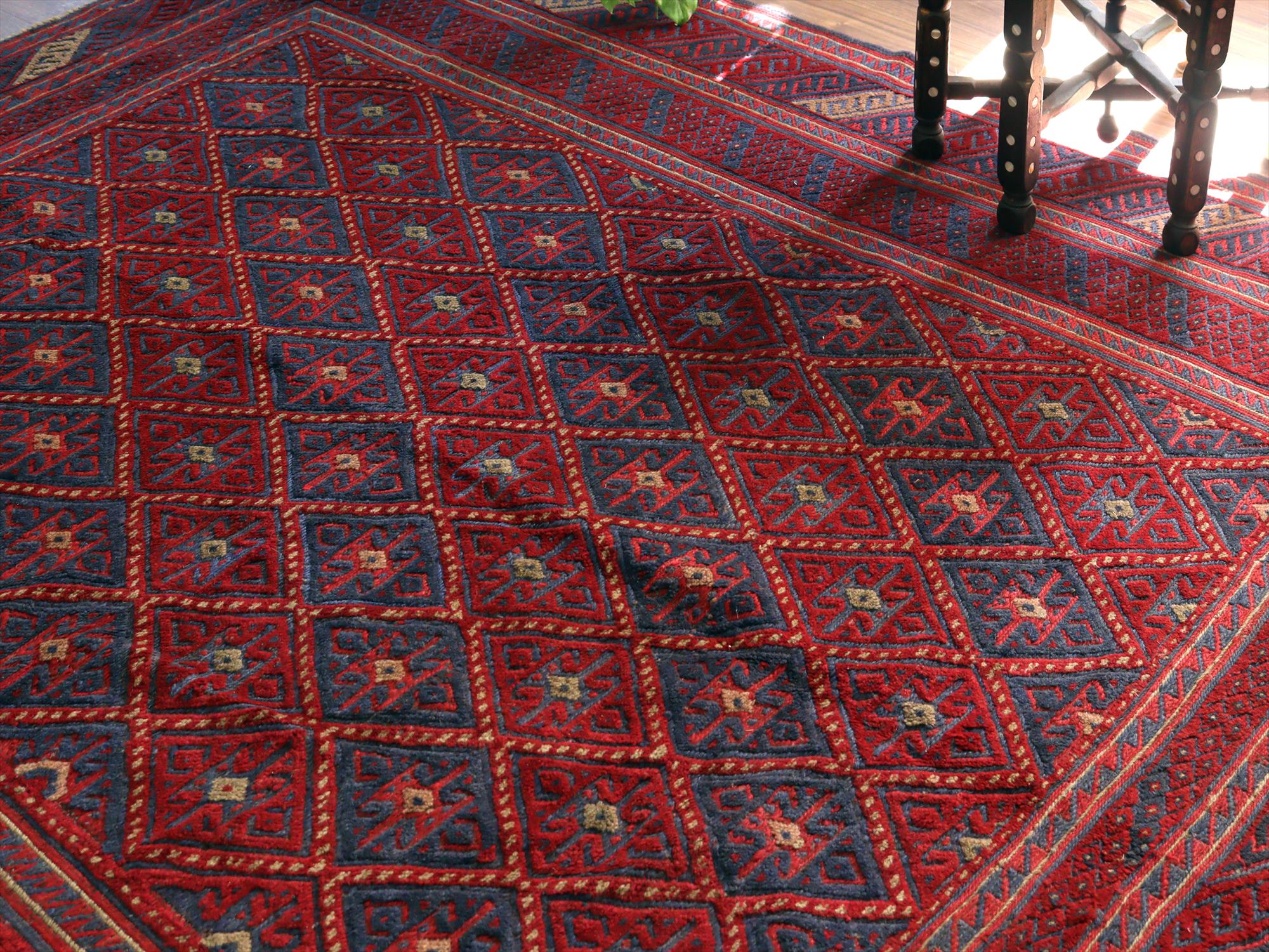 アフガニスタン東部、イランと国境を接するエリアの緻密な織りのキリムです。細かい織り目のスマック織りをベースに、立体感のあるカーペット織りでモチーフをレリーフのように織り込んだ1枚。
