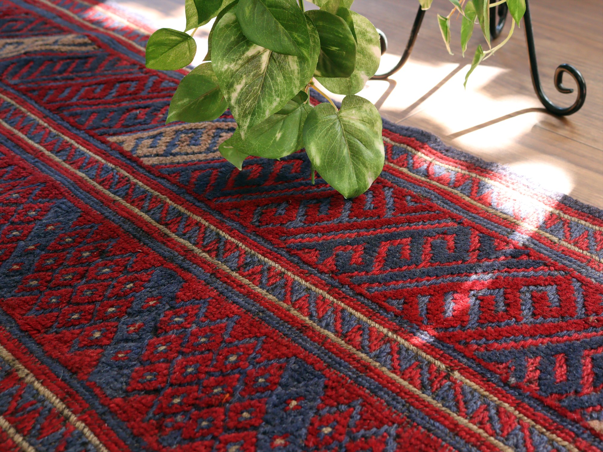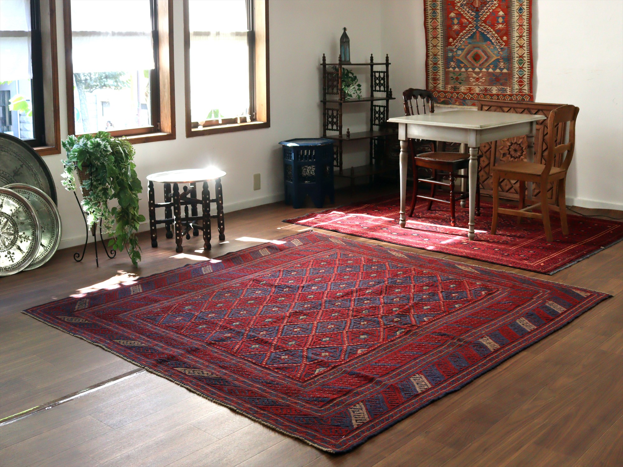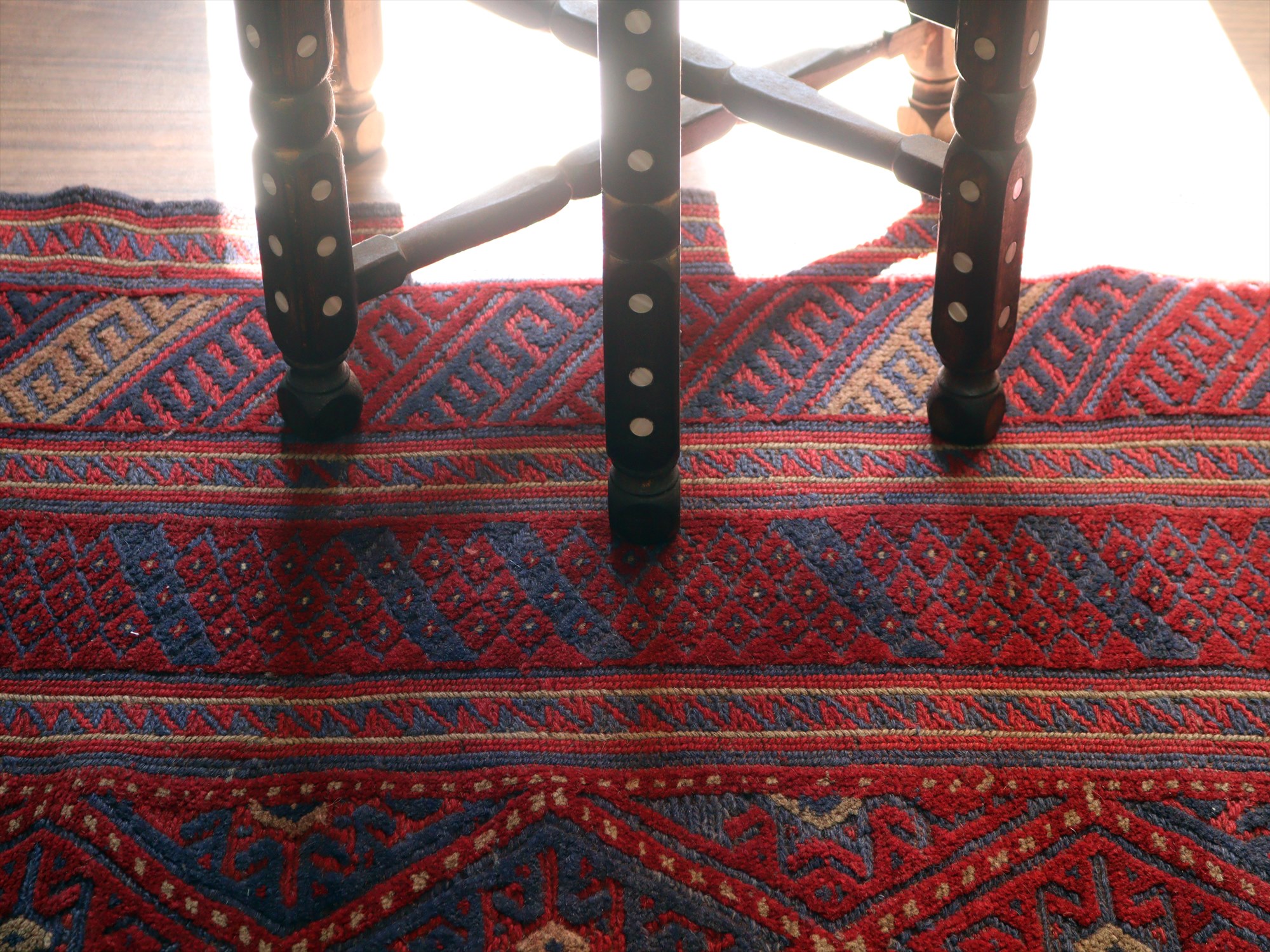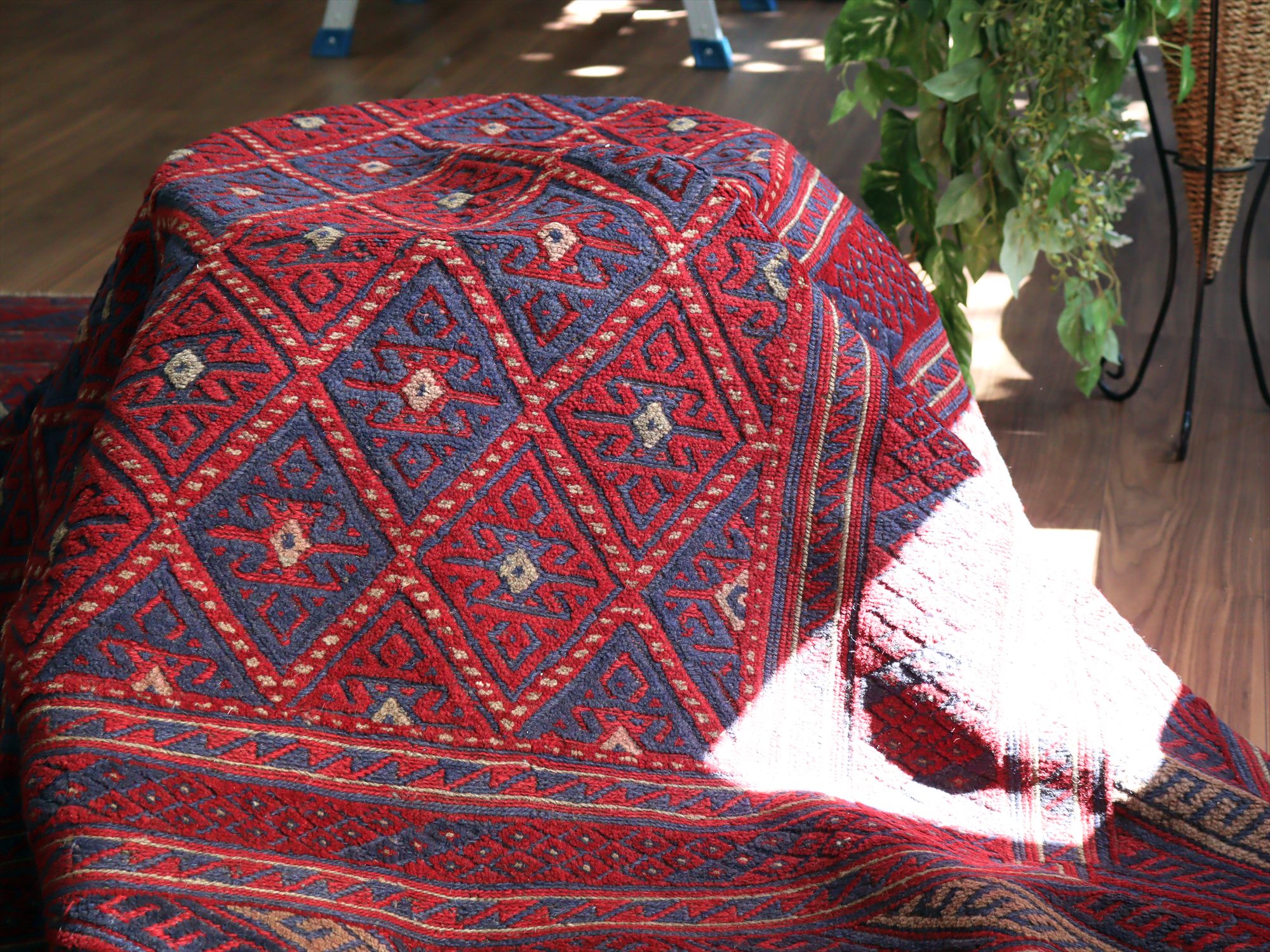 アフガニスタン東部、イランと国境を接するエリアの緻密な織りのキリムです。細かい織り目のスマック織りをベースに、立体感のあるカーペット織りでモチーフをレリーフのように織り込んだ1枚。