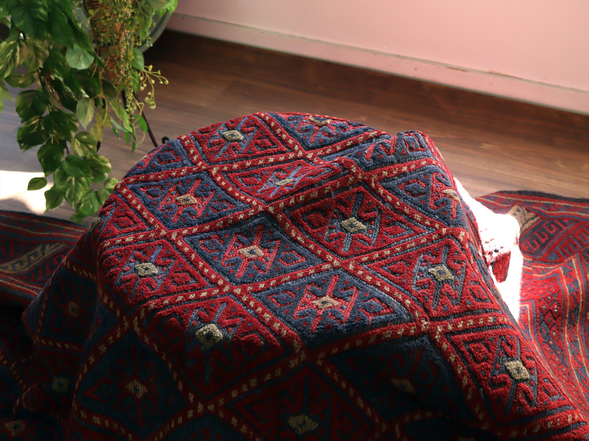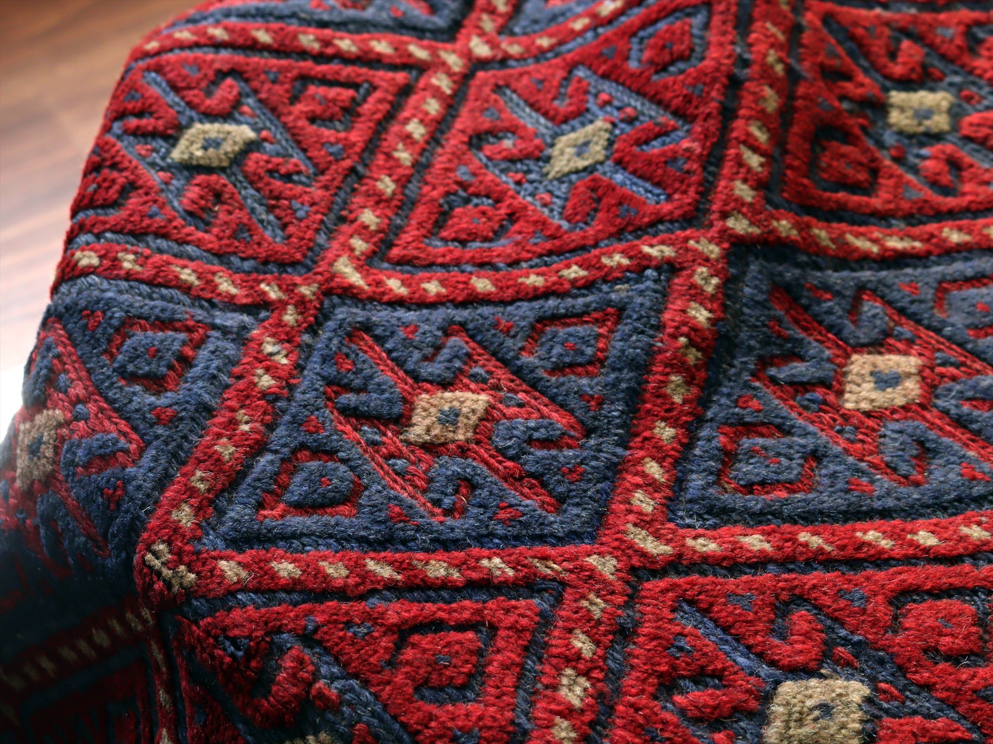 ベース地はスマック織りでしっかりとした織り地です。モチーフ部分はパイル(毛足)のある織りで、表面には立体感があります。
