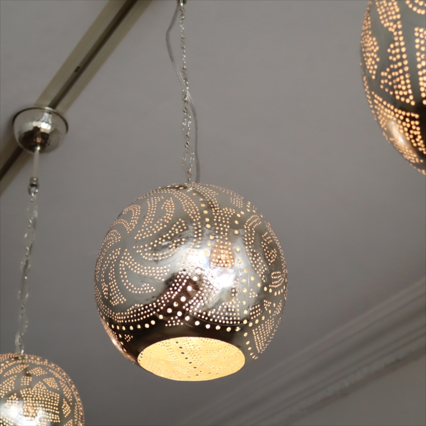 メタルを薄く加工し、コンコンと小さな穴をあけて光をデザインするランプシェードを作りました。中世から作られて来た伝統的な技法で、細工からこぼれる光が壁に映り、エキゾチックな雰囲気を楽しめます。