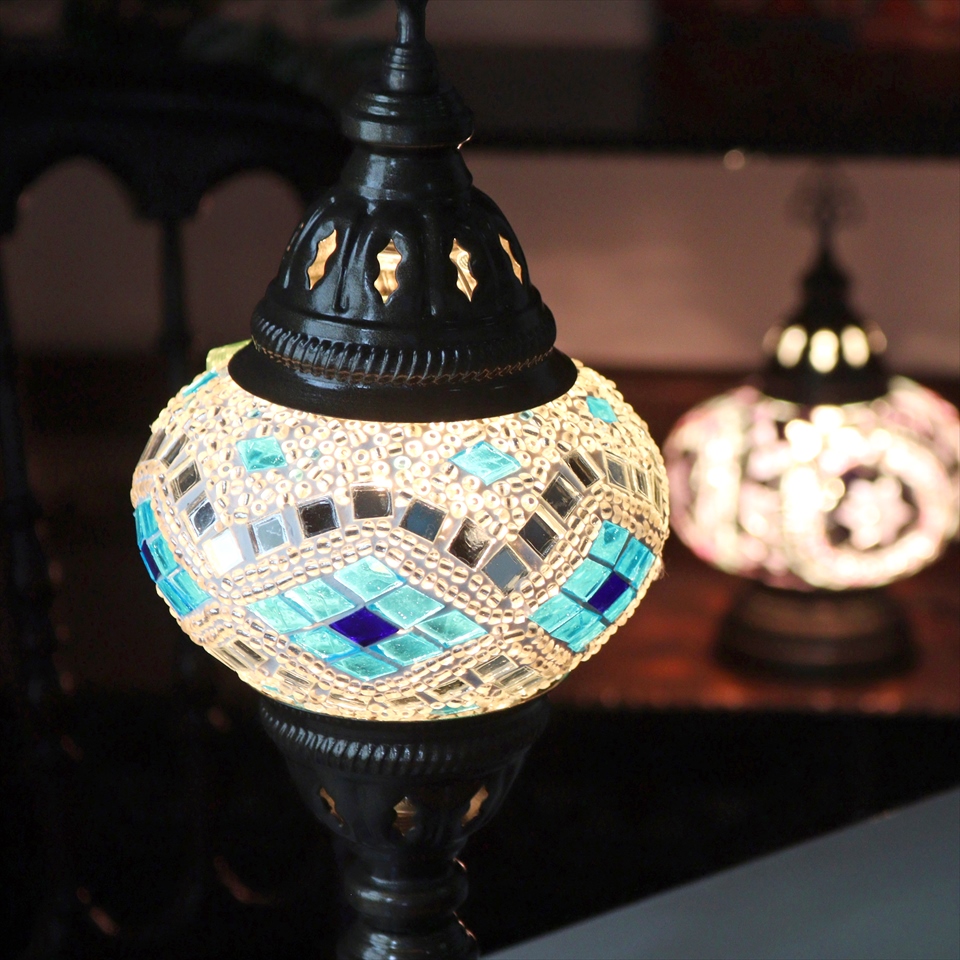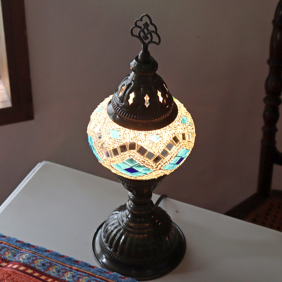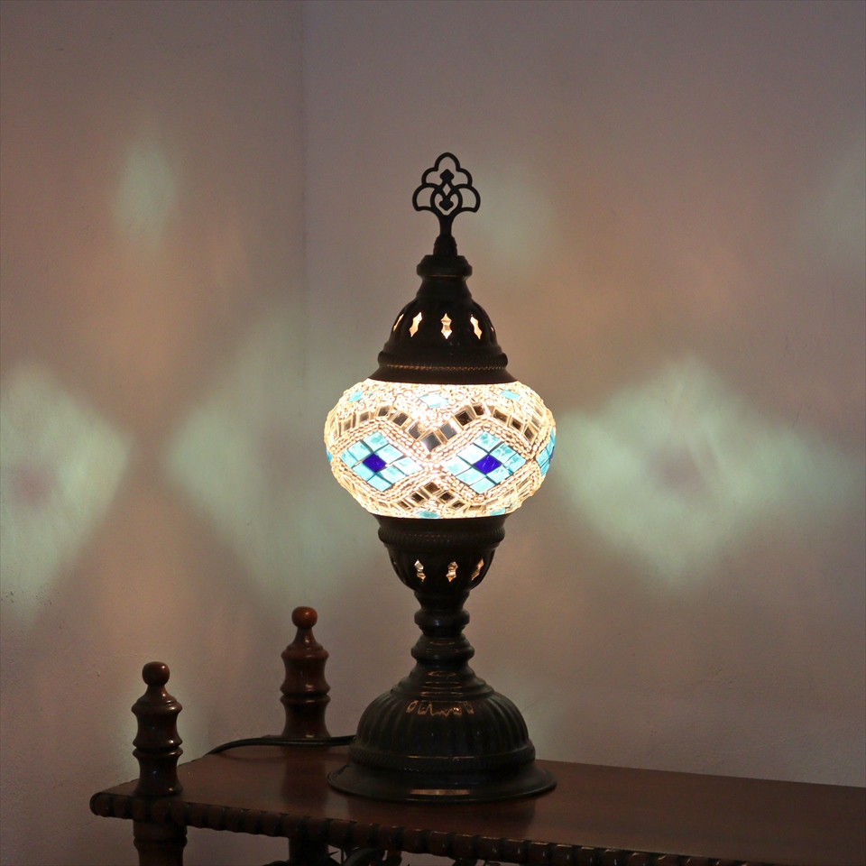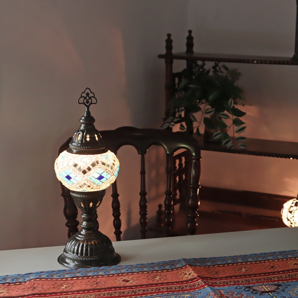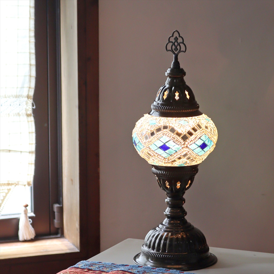 - トルコランプ モザイクテーブルランプ 直径13cm 全高36cm ホワイト/ブルーアーガイル