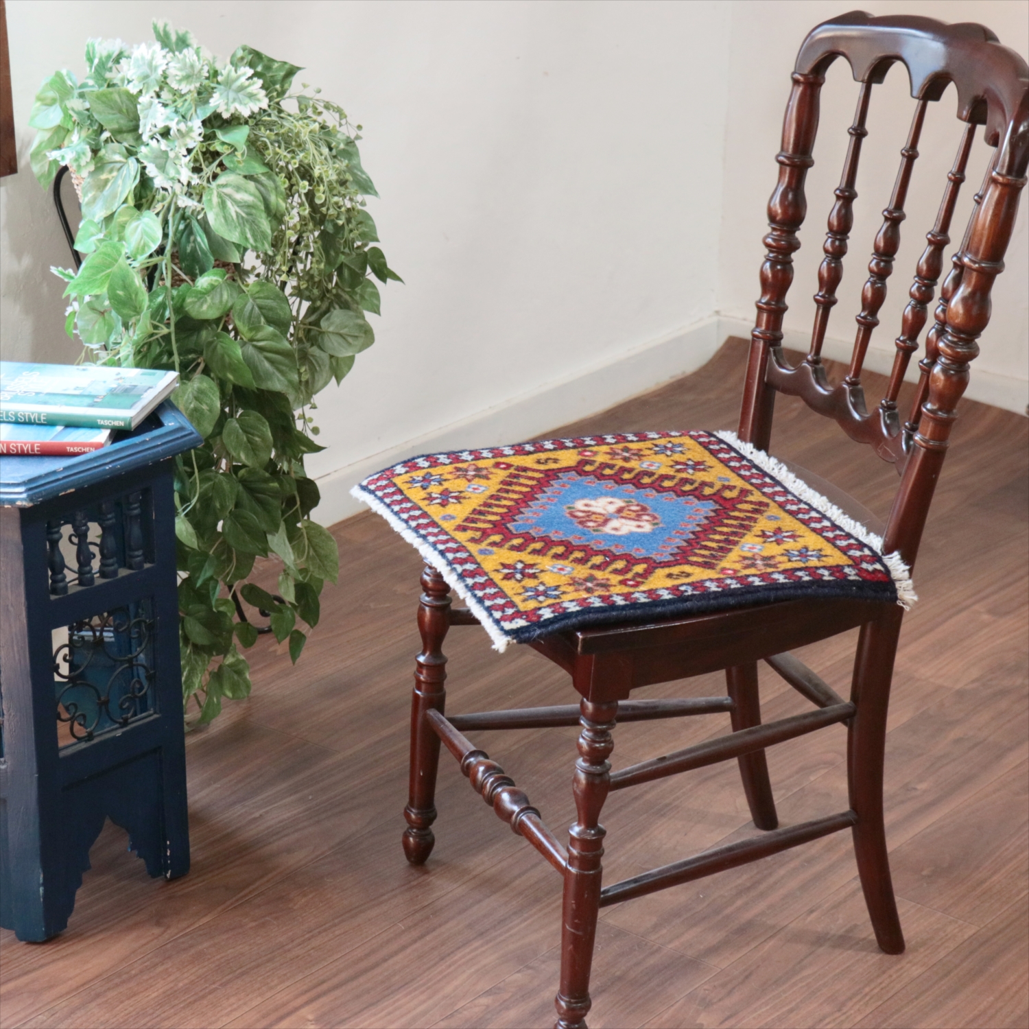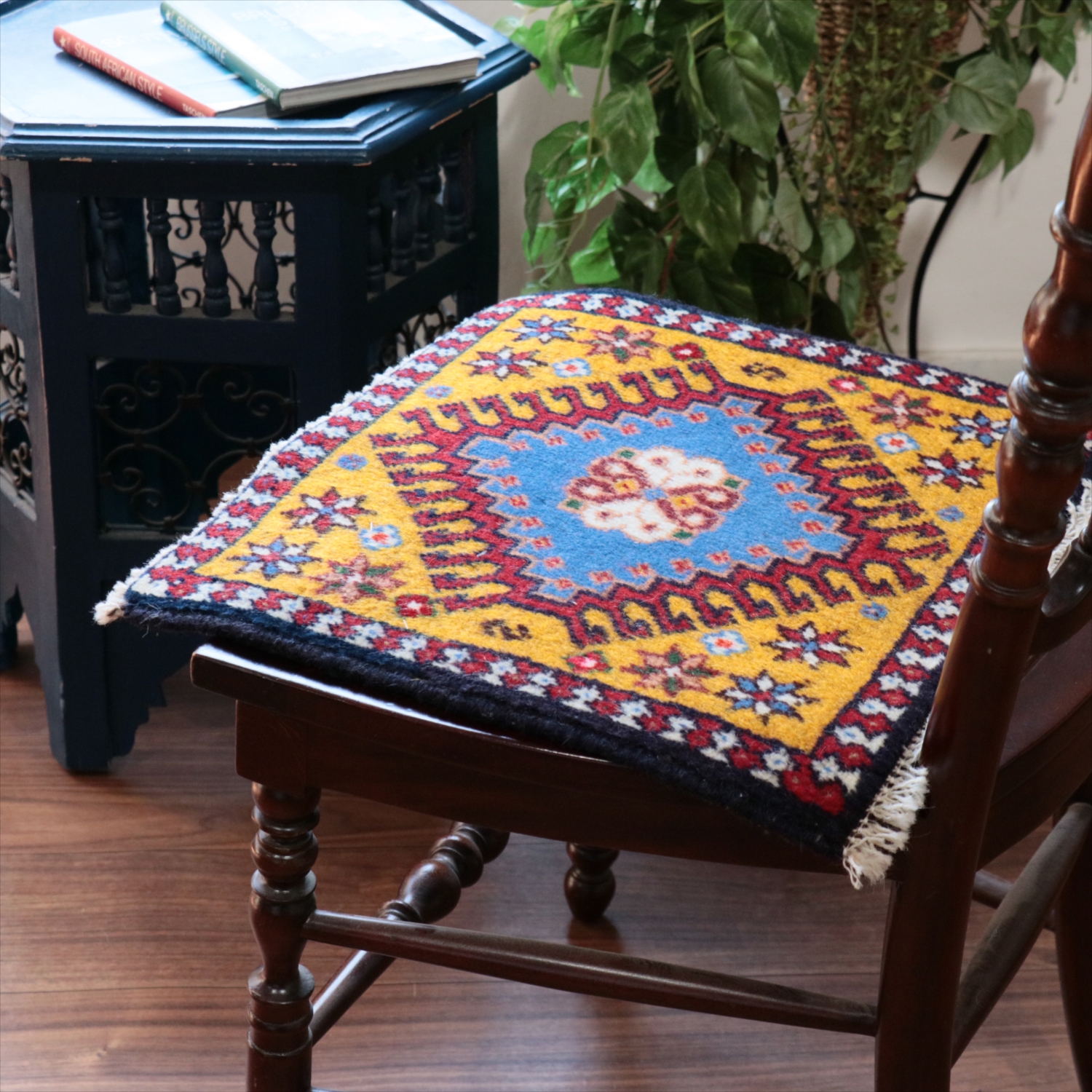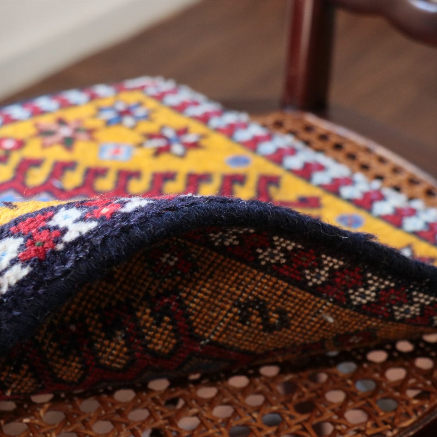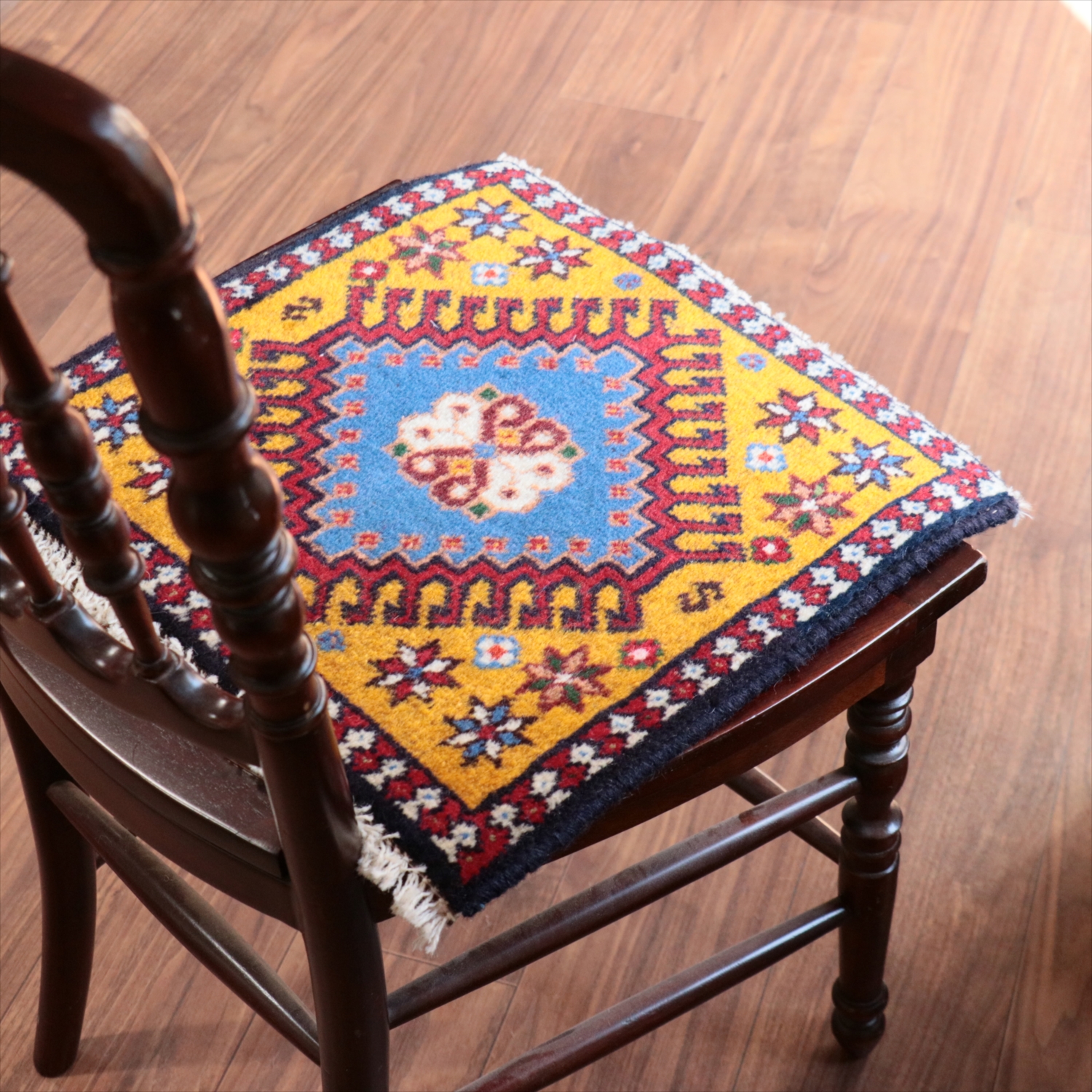 40cm角のミニサイズのラグ。小さいながらも、織りはしっかりしていて本格的です。多少ゆがみが気になりますが、ゆがみも含めて素朴な感じをお楽しみいただければと思います。