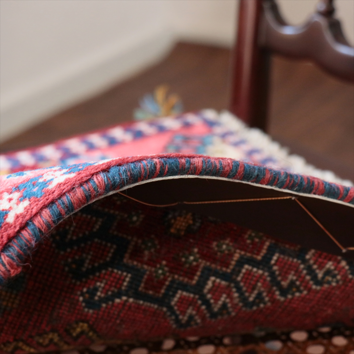 40cm角のミニサイズのラグ。小さいながらも、織りはしっかりしていて本格的です。多少ゆがみが気になりますが、ゆがみも含めて素朴な感じをお楽しみいただければと思います。