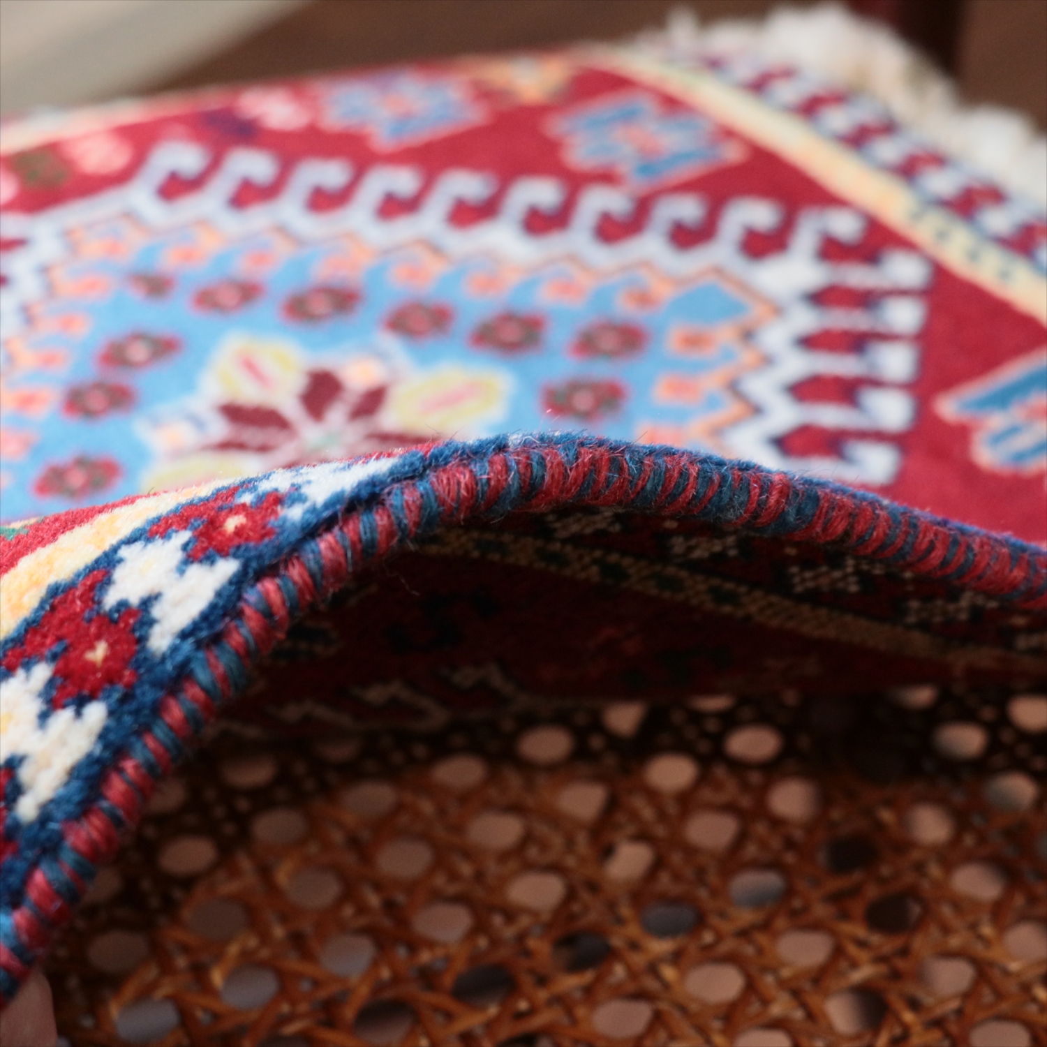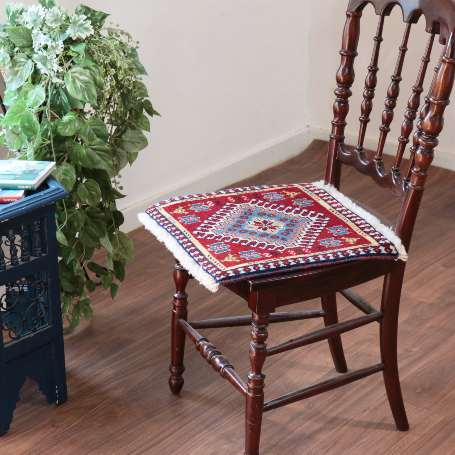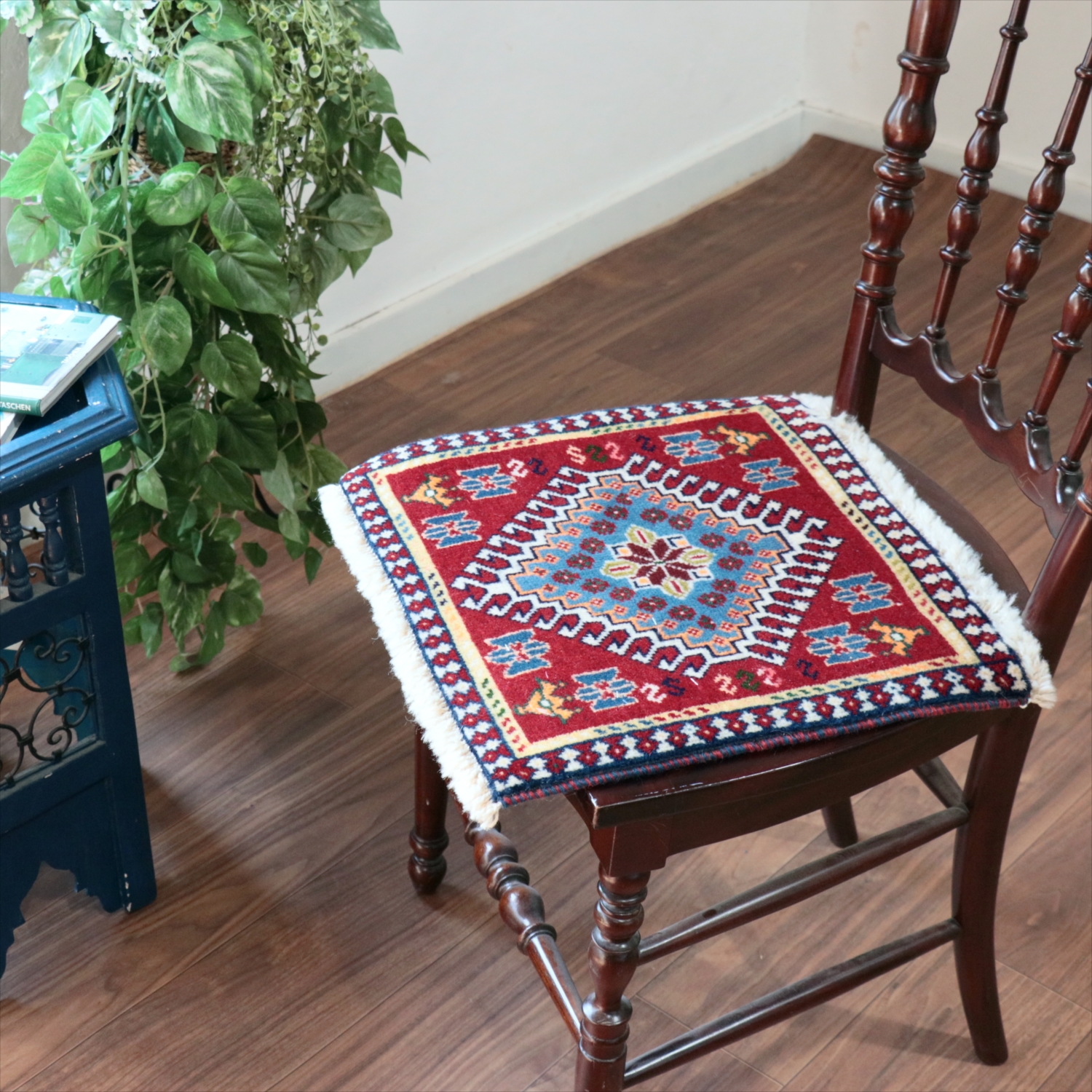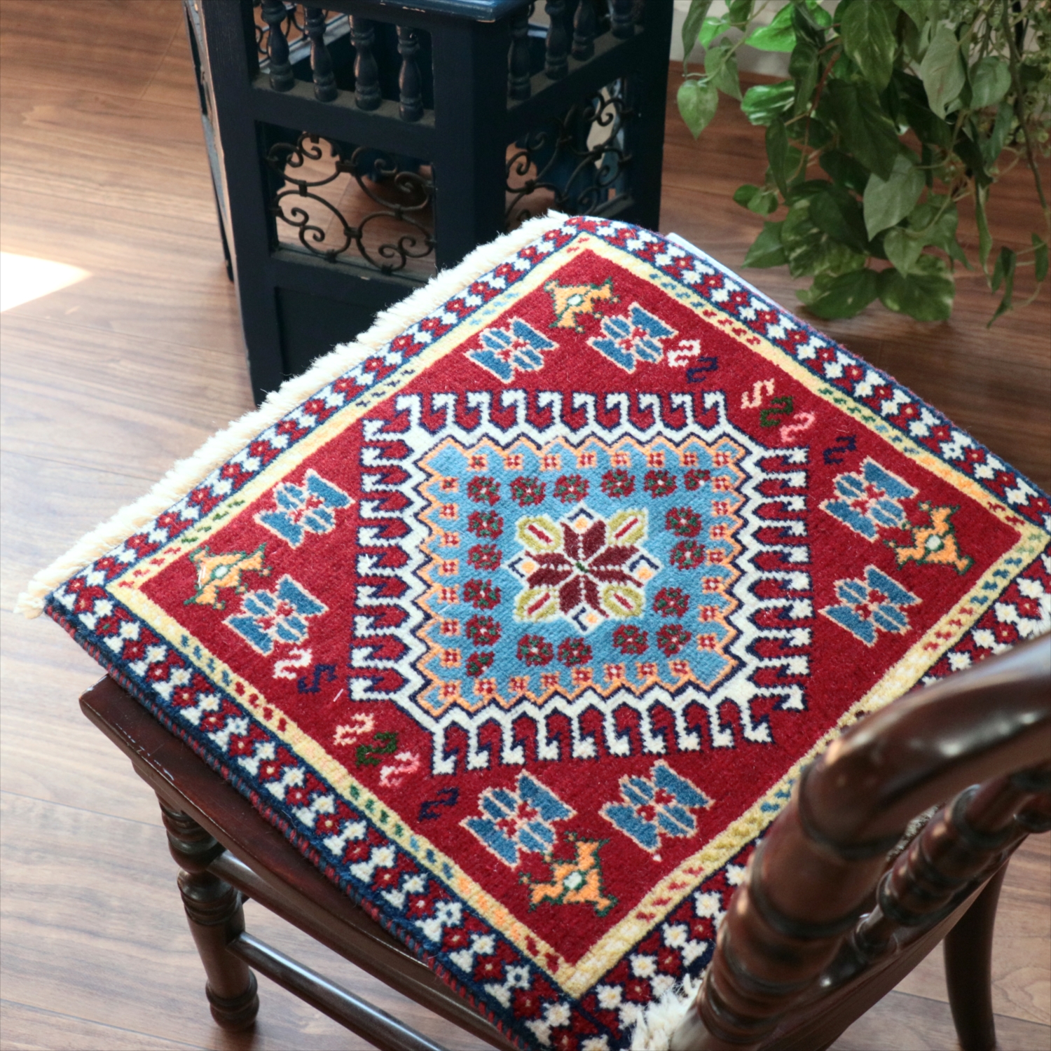 40cm角のミニサイズのラグ。小さいながらも、織りはしっかりしていて本格的です。多少ゆがみが気になりますが、ゆがみも含めて素朴な感じをお楽しみいただければと思います。