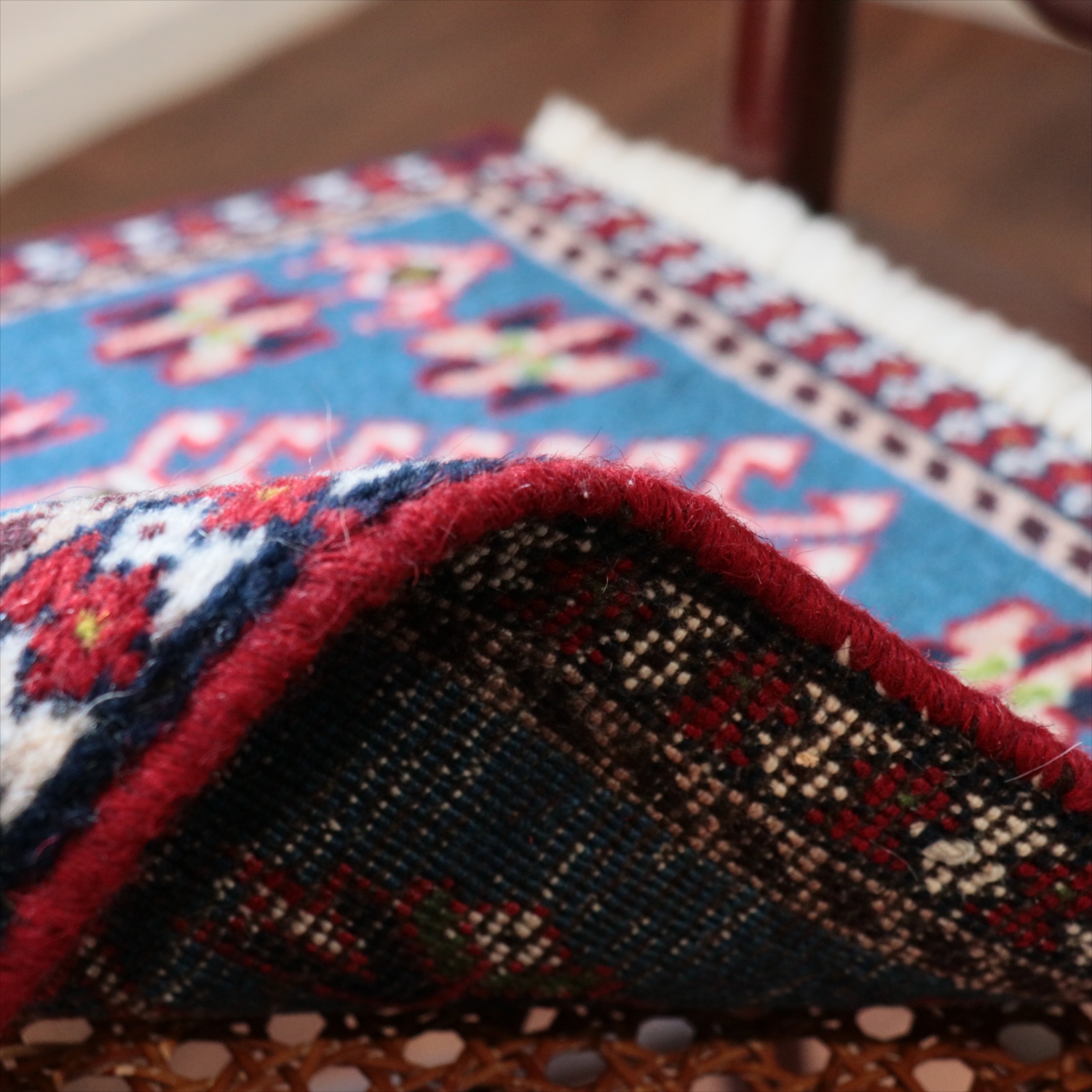 40cm角のミニサイズのラグ。小さいながらも、織りはしっかりしていて本格的です。多少ゆがみが気になりますが、ゆがみも含めて素朴な感じをお楽しみいただければと思います。