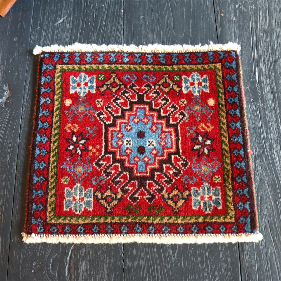 30cm角のミニサイズのラグ。小さいながらも、織りはしっかりしていて本格的です。多少ゆがみが気になりますが、ゆがみも含めて素朴な感じをお楽しみいただければと思います。