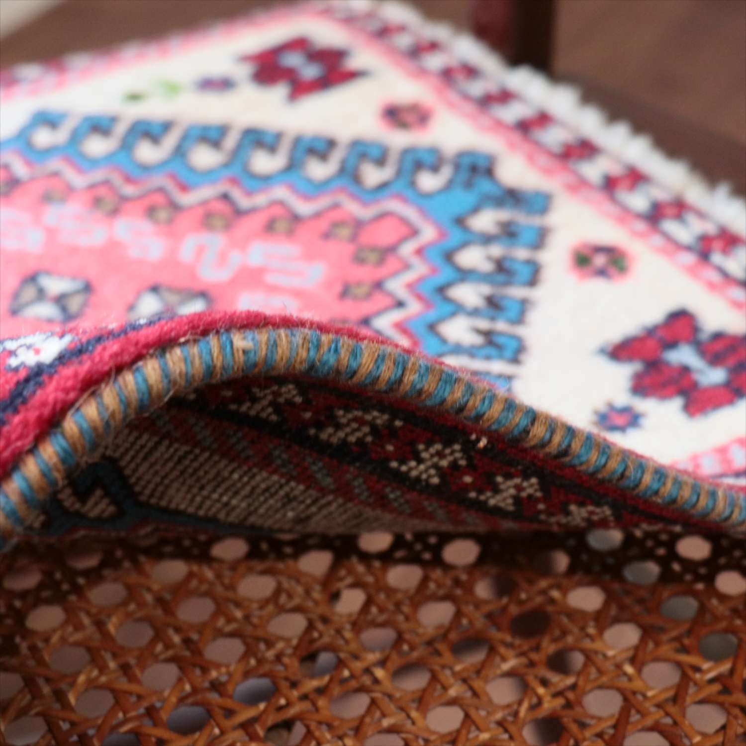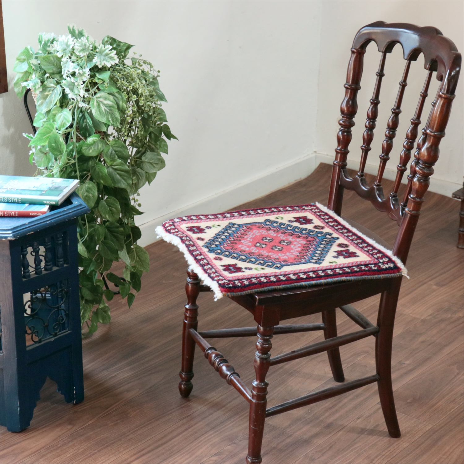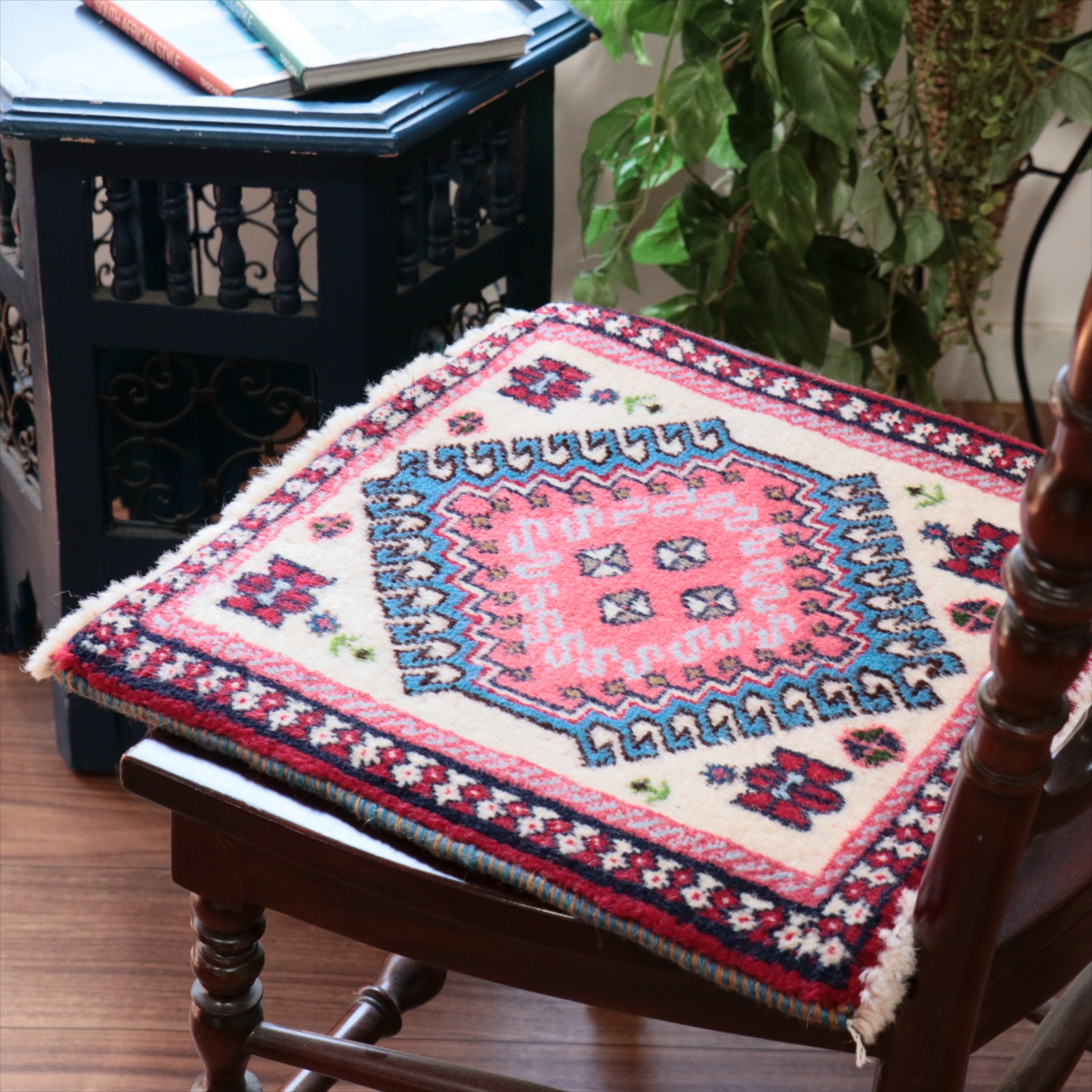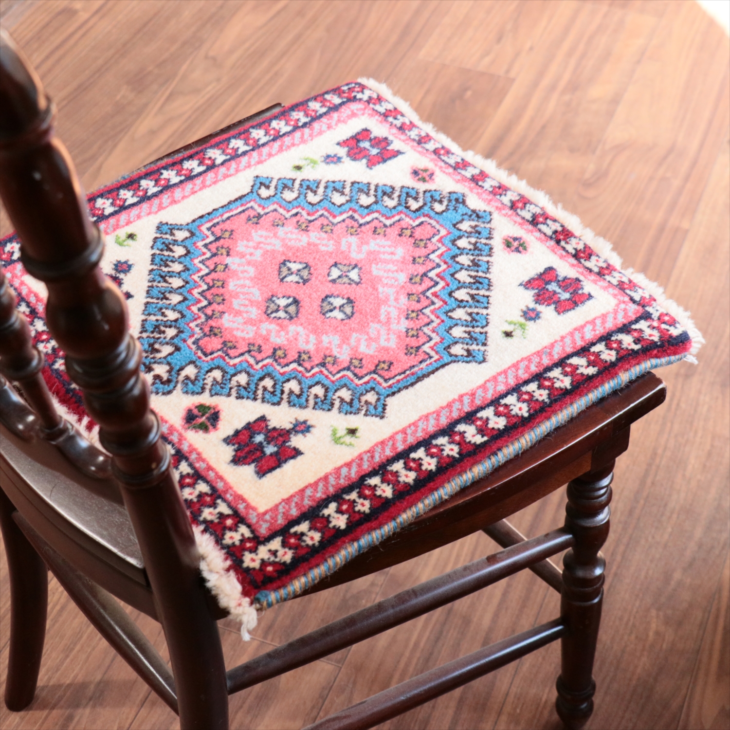 40cm角のミニサイズのラグ。小さいながらも、織りはしっかりしていて本格的です。多少ゆがみが気になりますが、ゆがみも含めて素朴な感じをお楽しみいただければと思います。