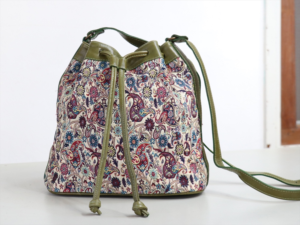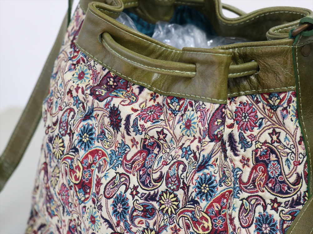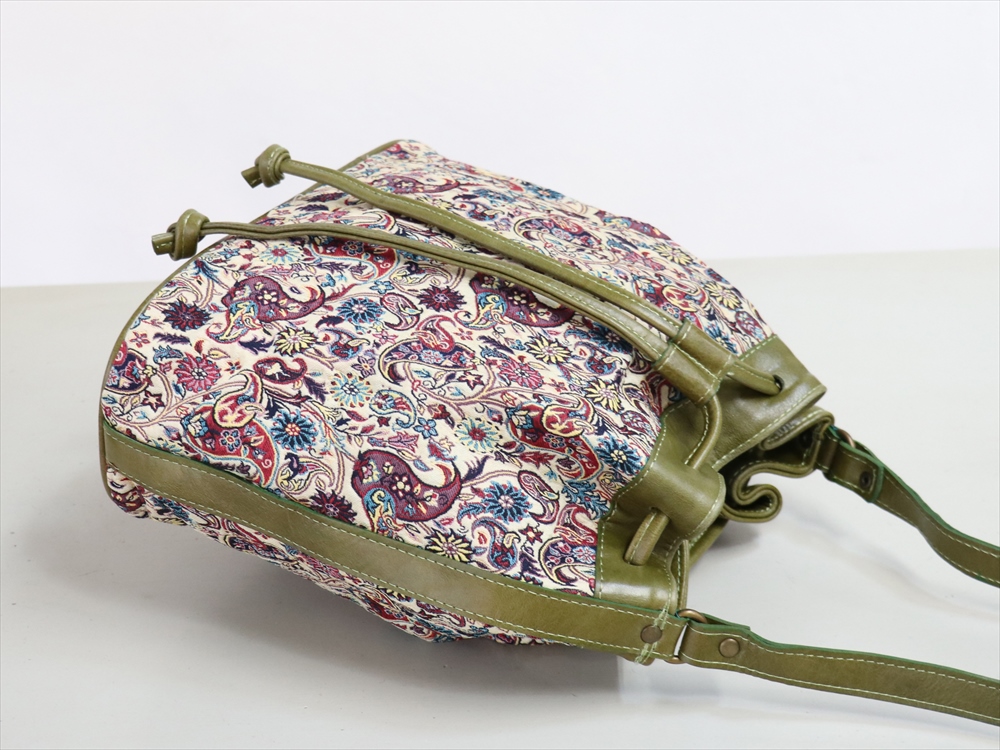 テルメ ペイズリーの巾着型ショルダーバッグアイボリー/革の色オリーブグリーン