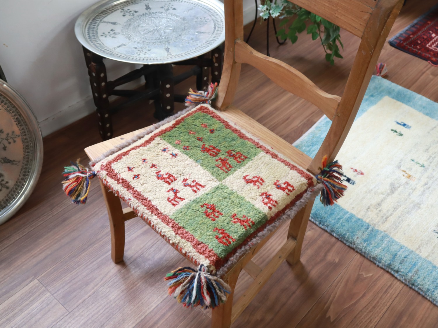 - 【15%OFF】ギャッベ イラン産手織り 座布団サイズ 36x34cm クリーム色とグリーン