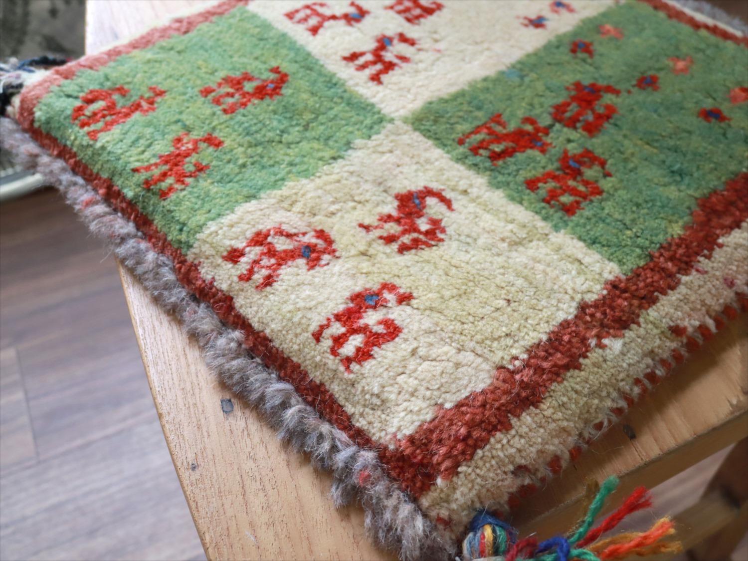 【15%OFF】ギャッベ イラン産手織り 座布団サイズ 36x34cm クリーム色とグリーン