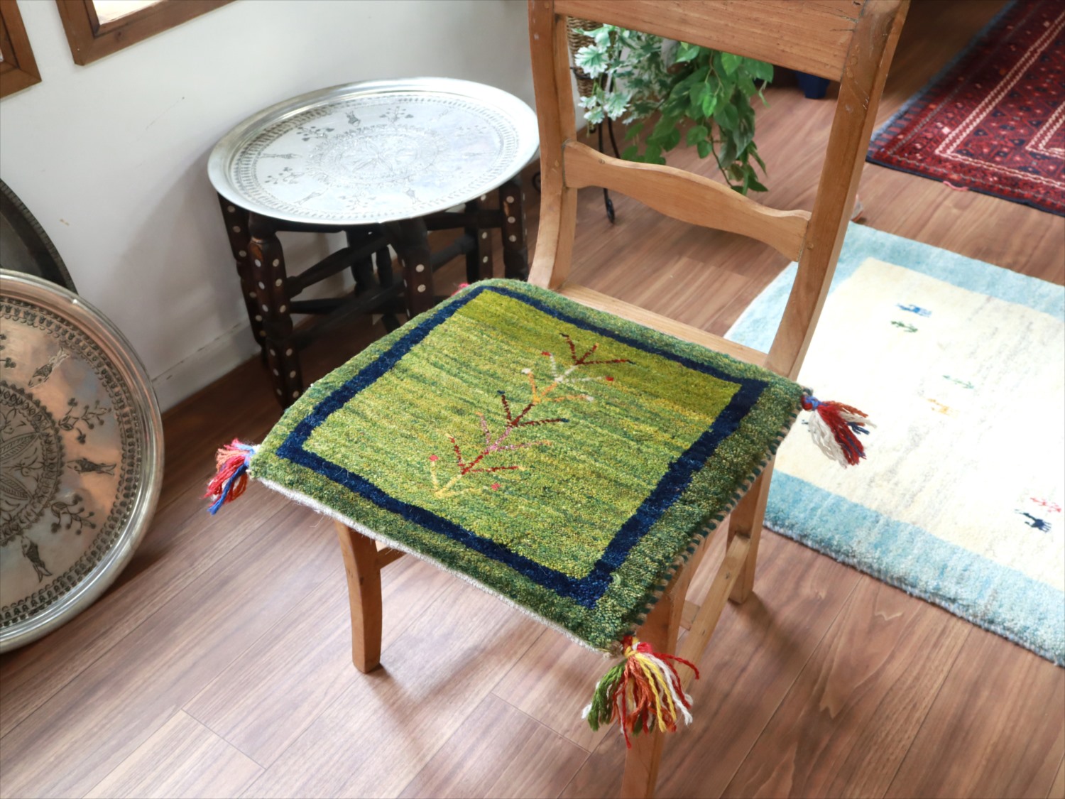 Key:イラン直輸入, GABBEH, ギャッベ, ギャベ, グリーン, 緑, 手織り, 手紡ぎ, ウール, 天然素材, ポンポン, 座布団, バザールギャッベ, ハンドメイド, 一点もの, 現品販売,ガラタバザール, 東京中野区
